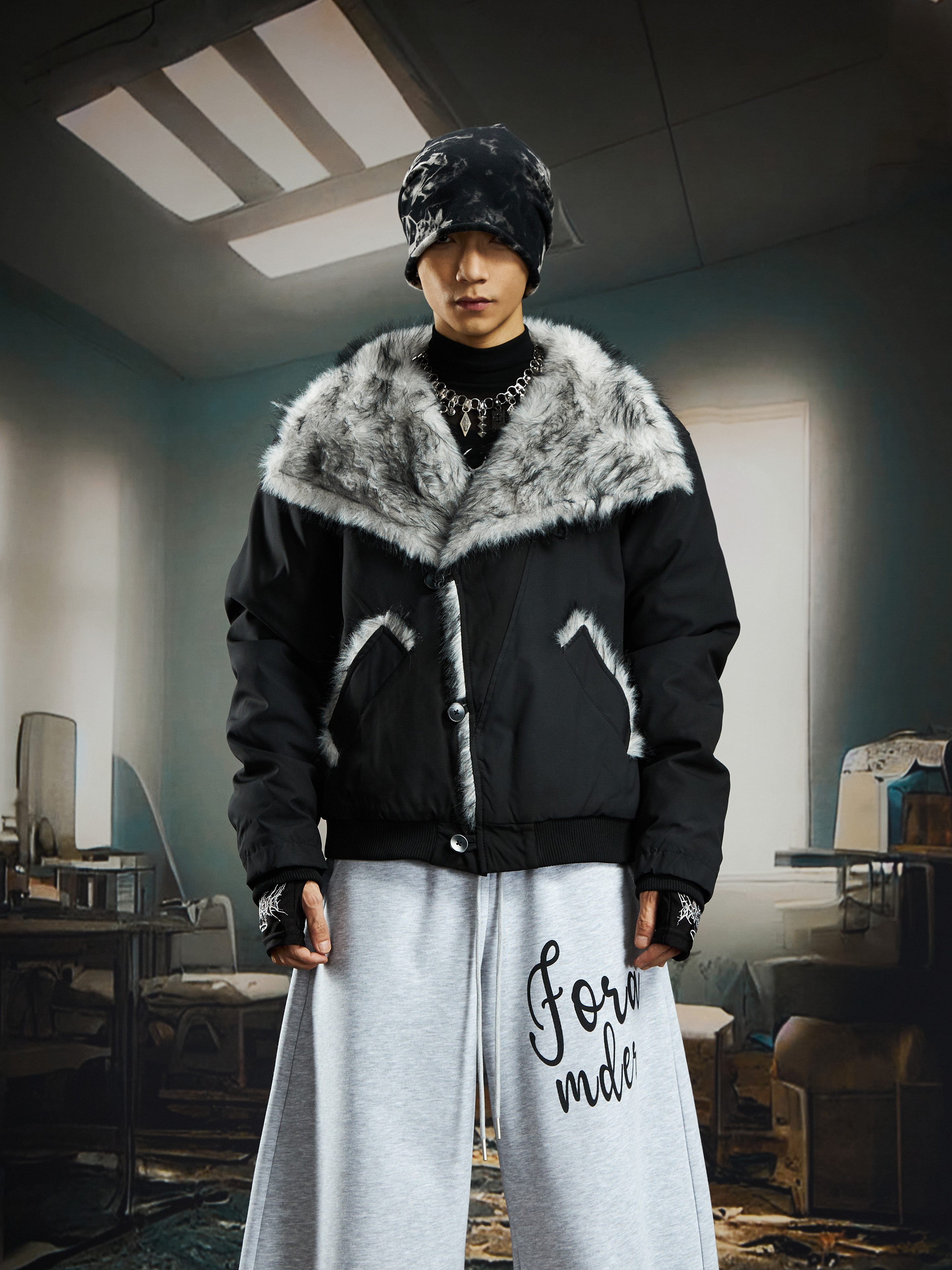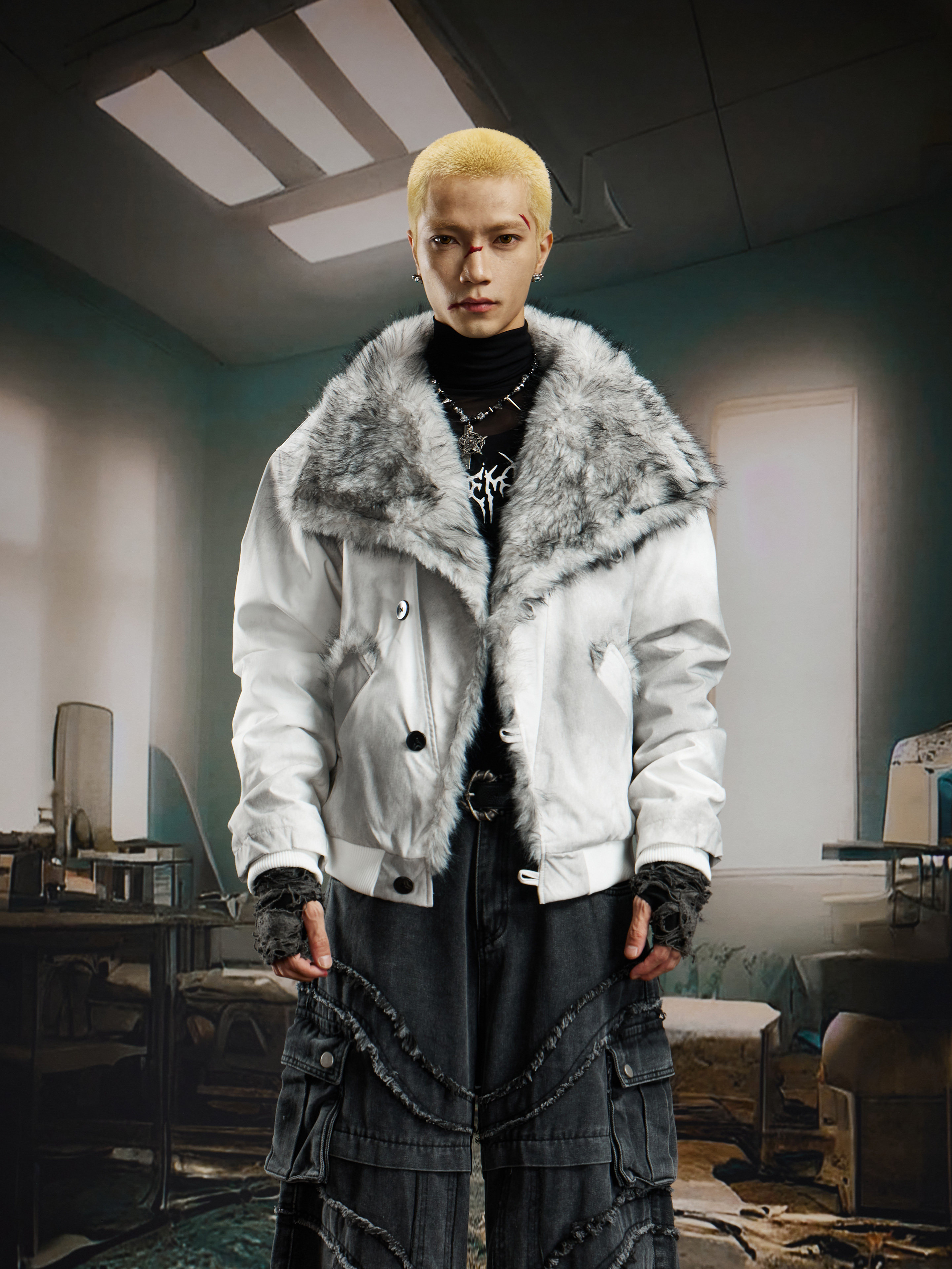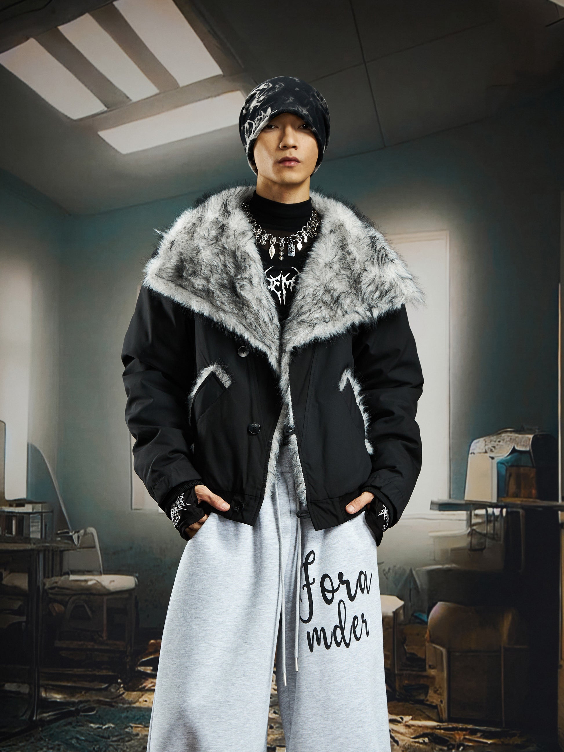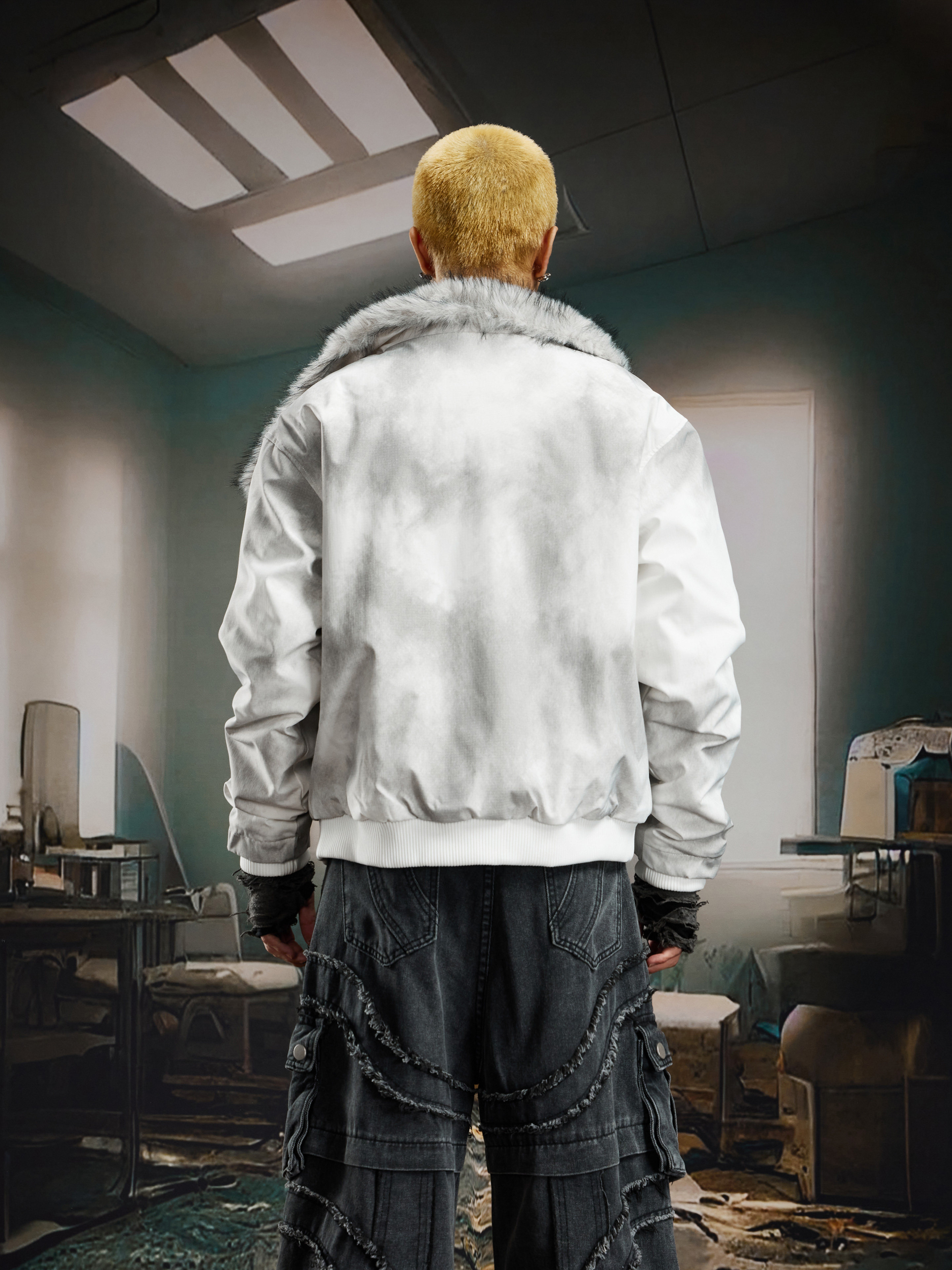 Damage Dye Fake Fur Lapel Puffer Jacket WN22764