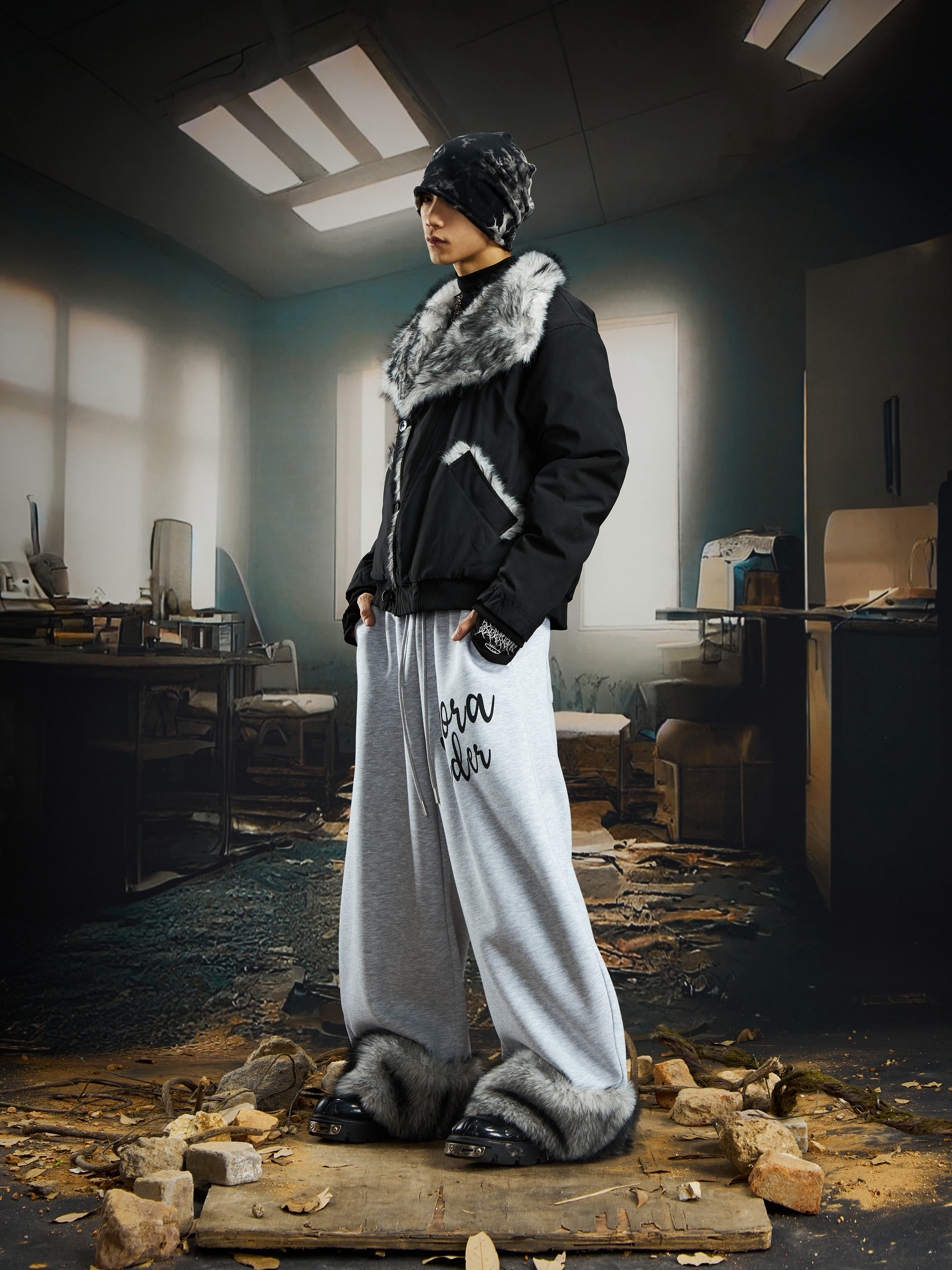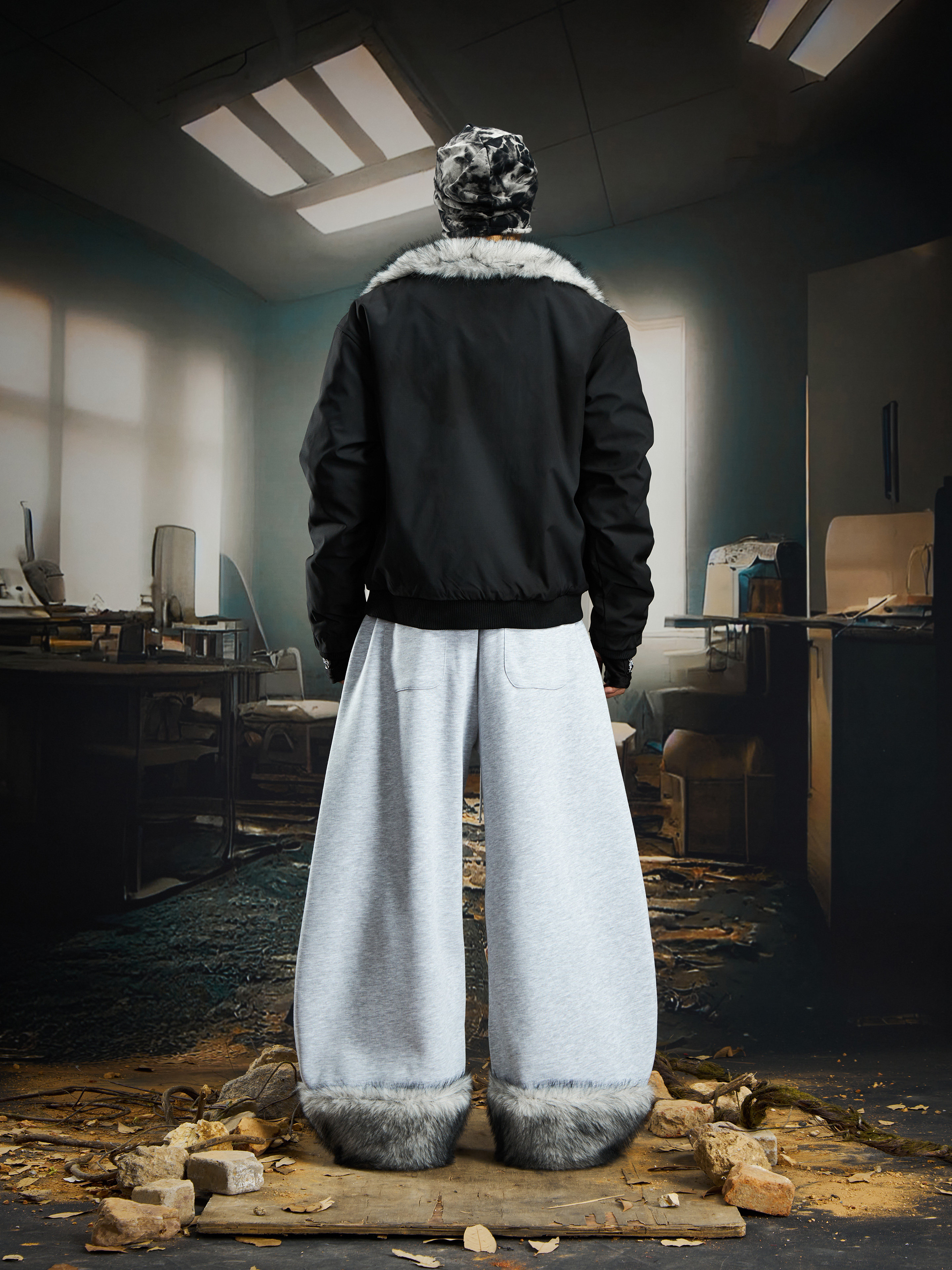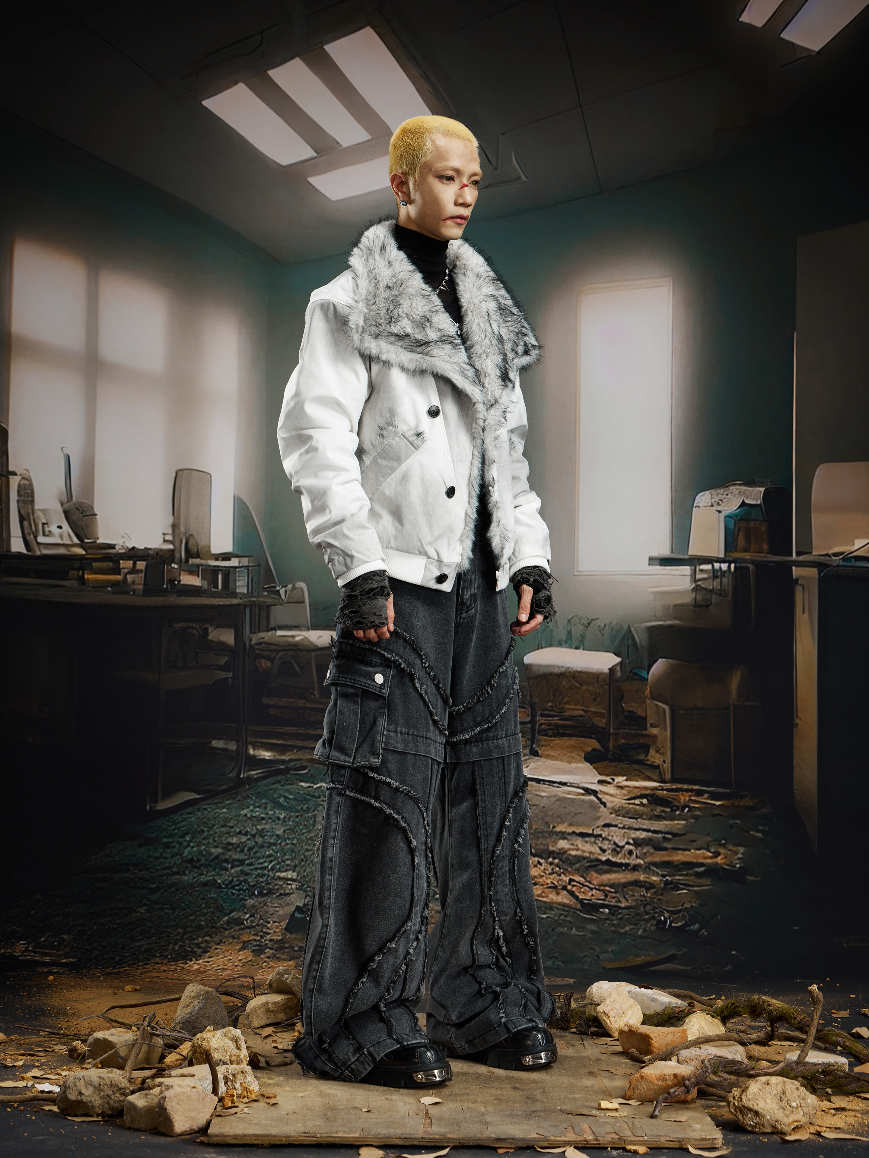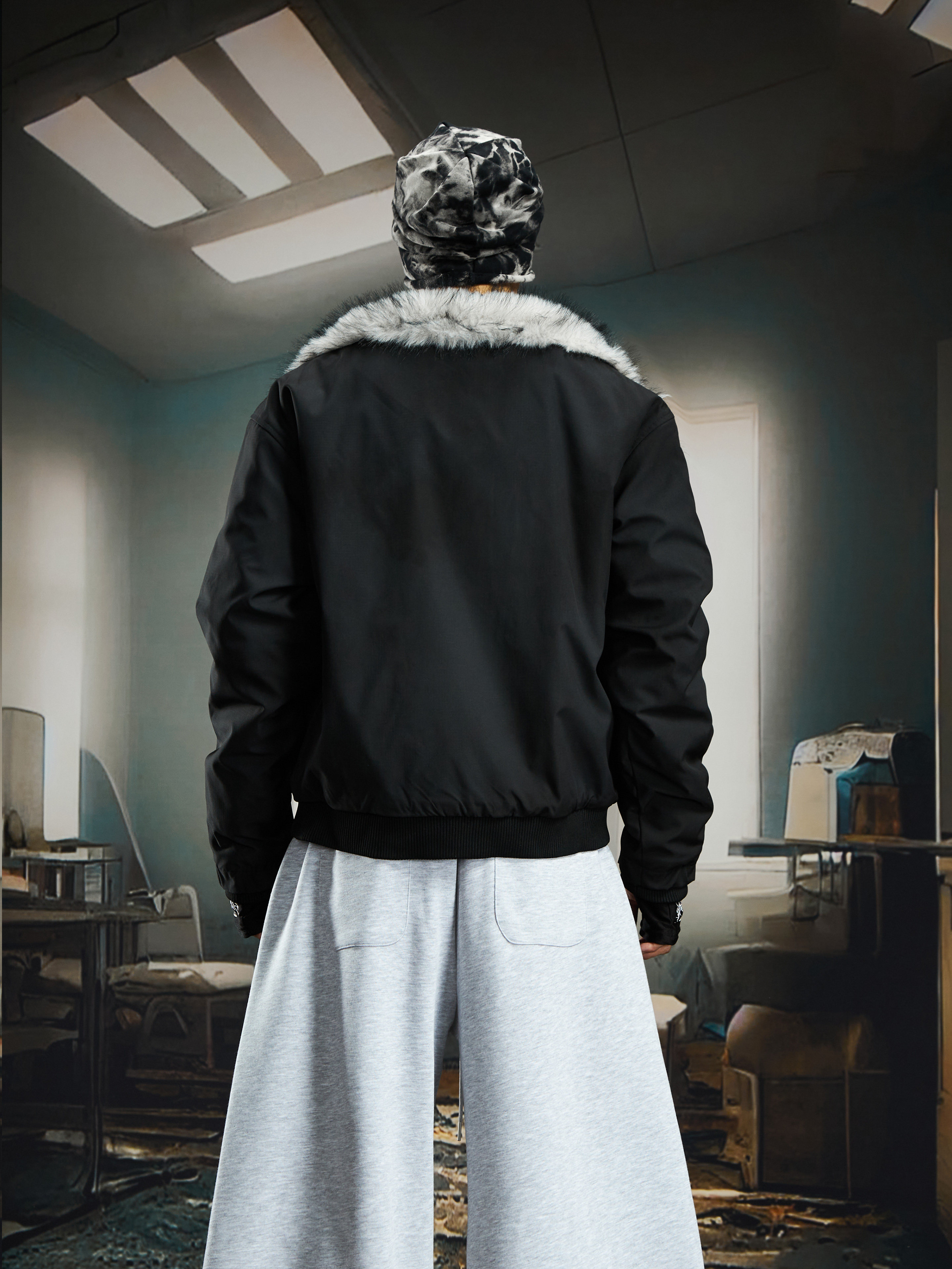 Damage Dye Fake Fur Lapel Puffer Jacket WN22764