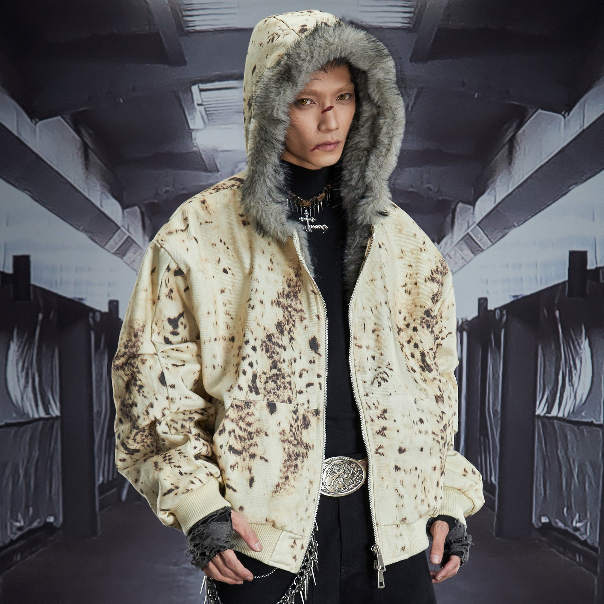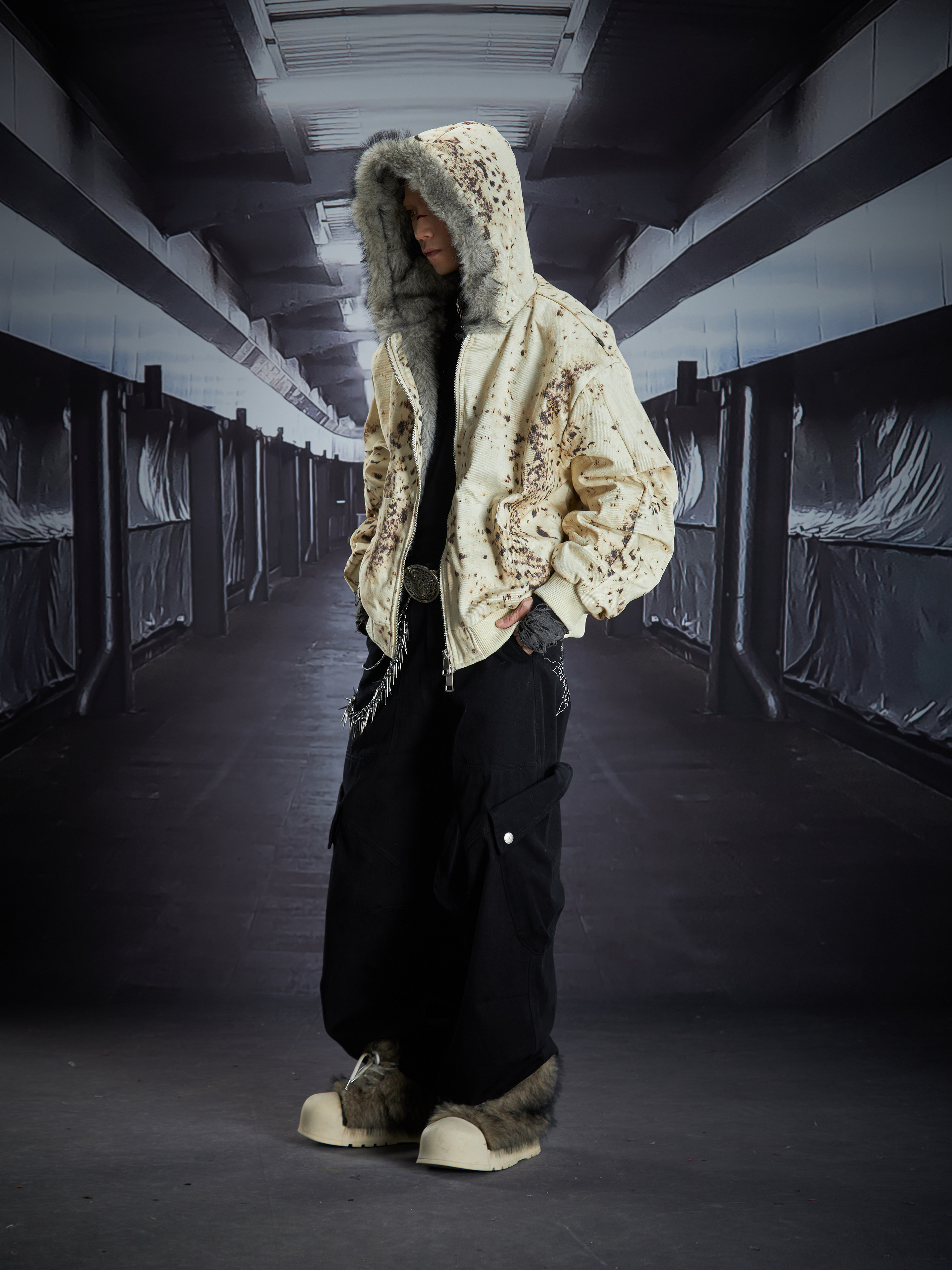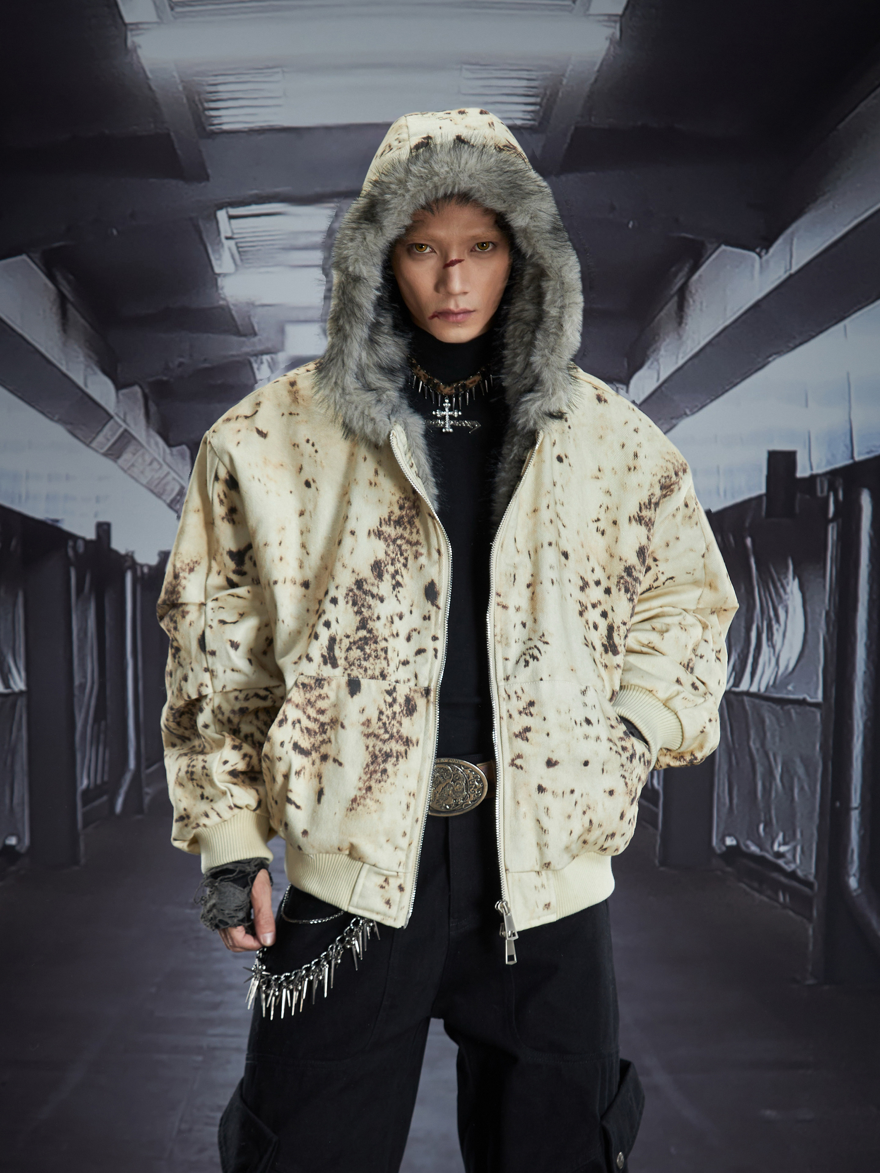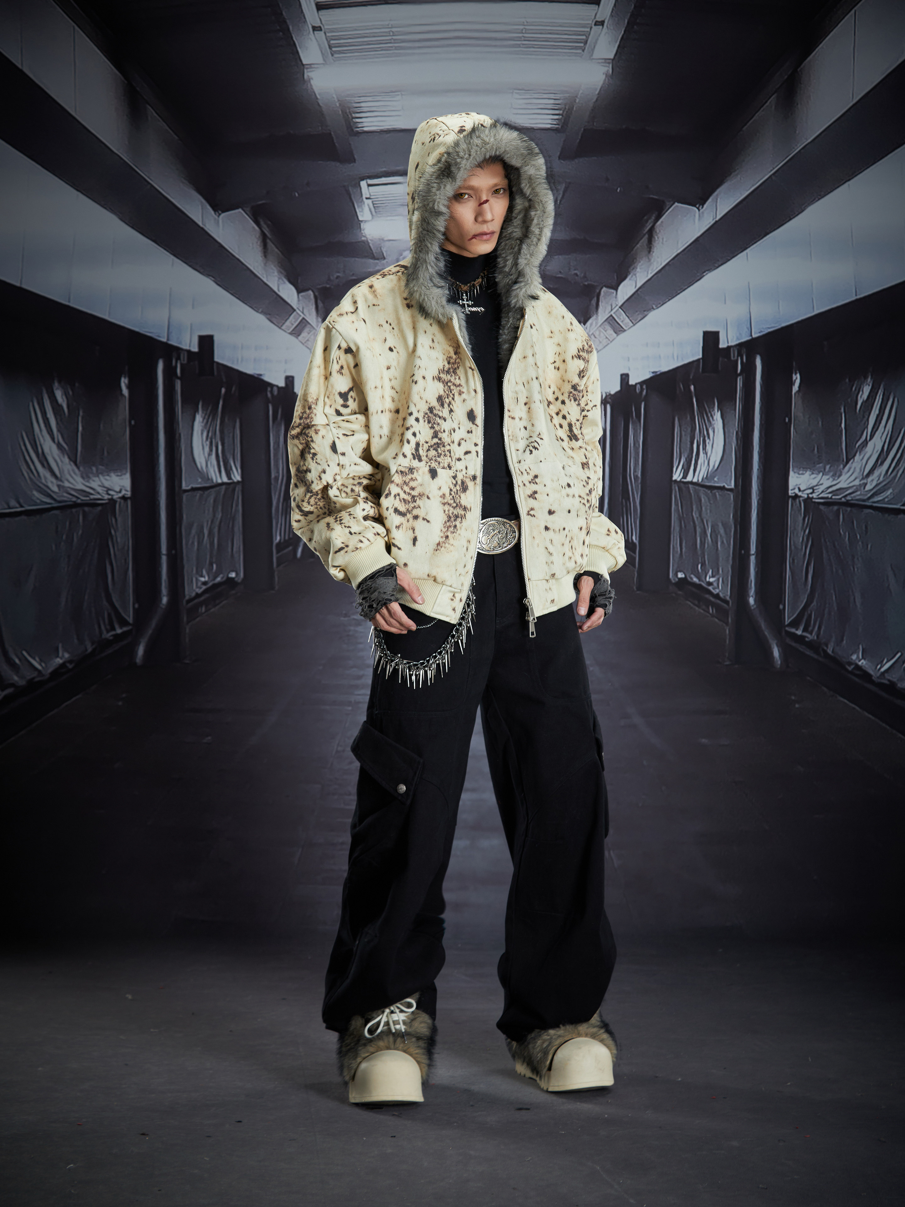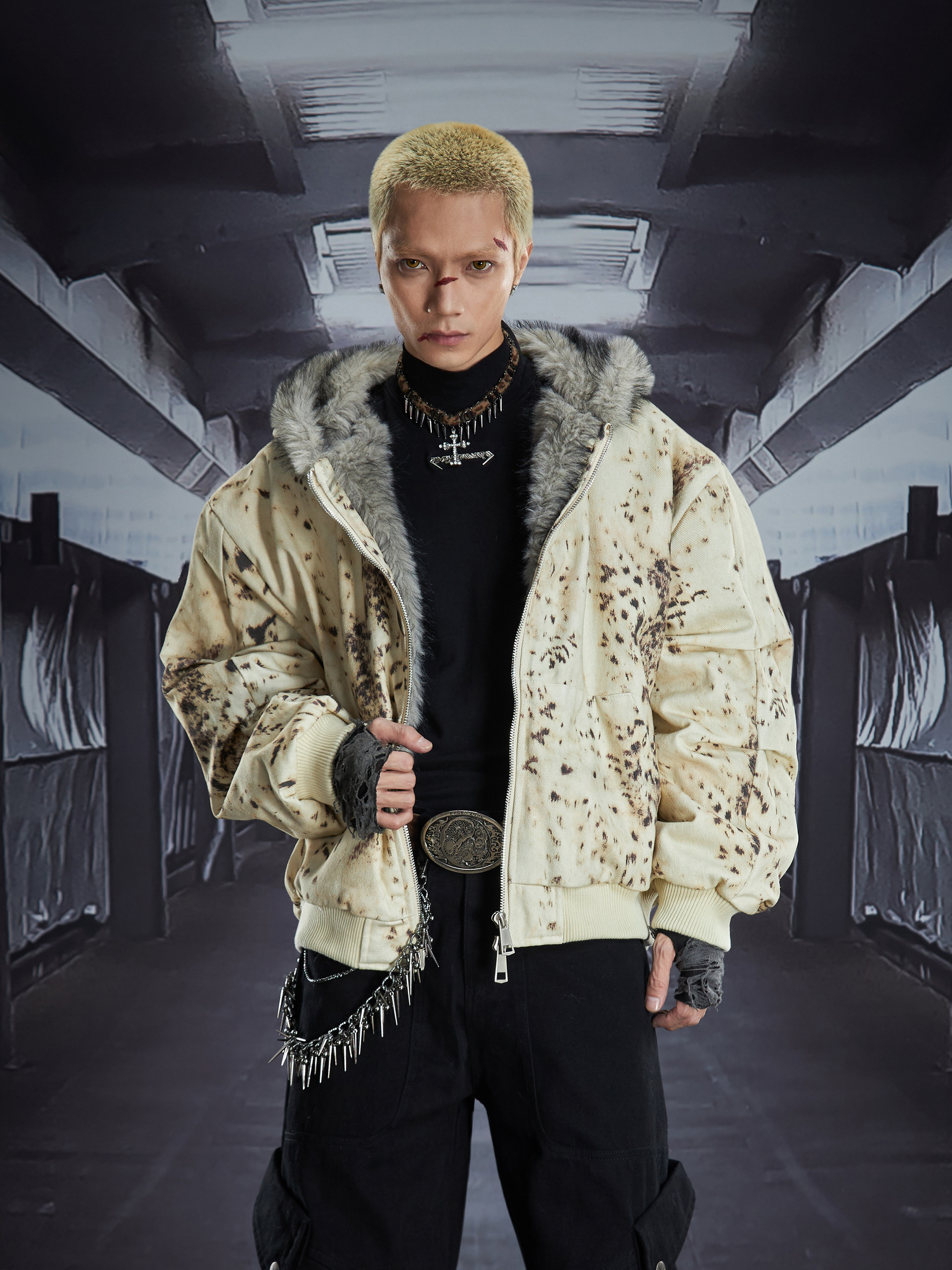 Washed Damage Fake Fur Hooded Cropped Padded Jacket WN22829