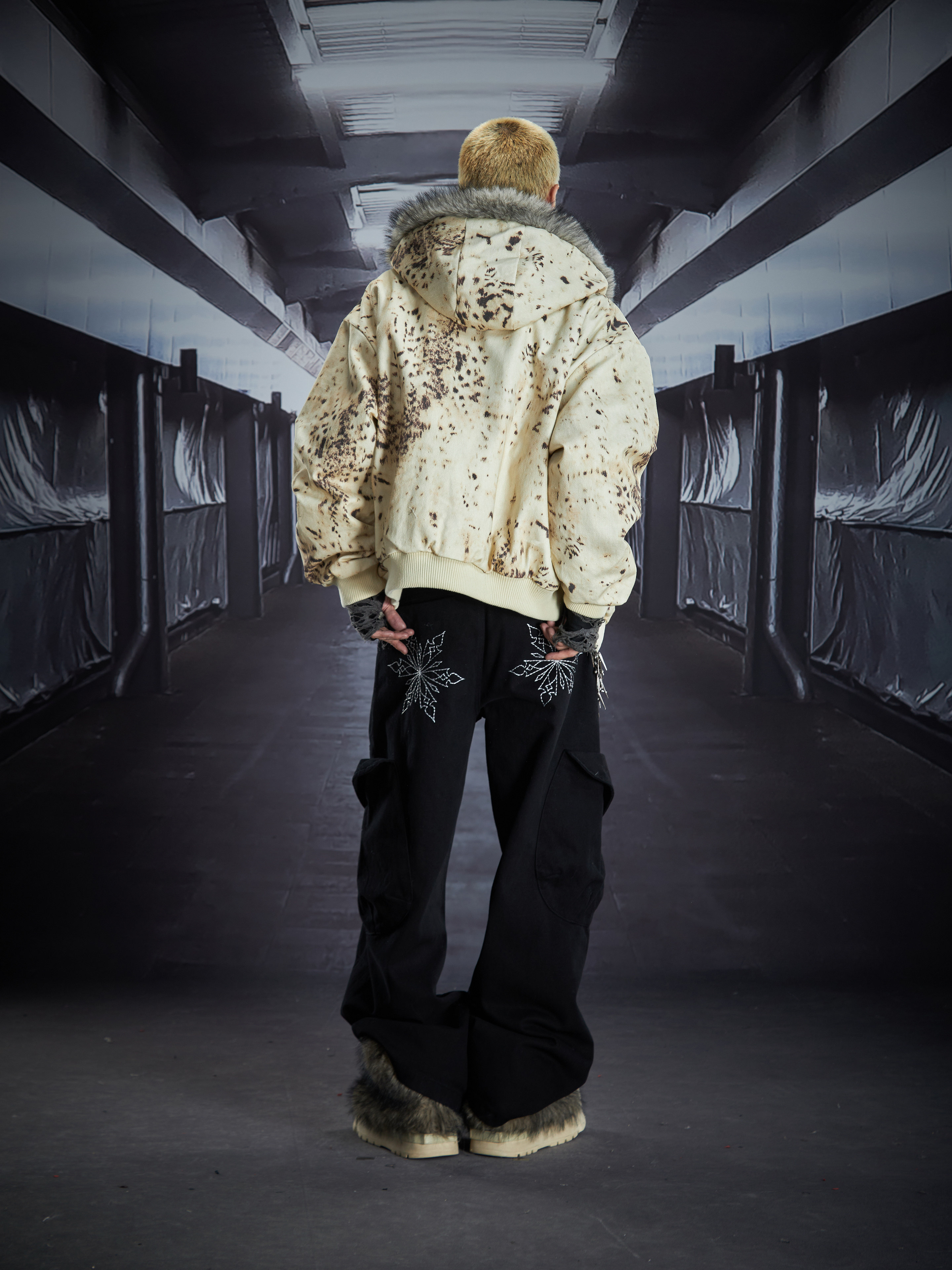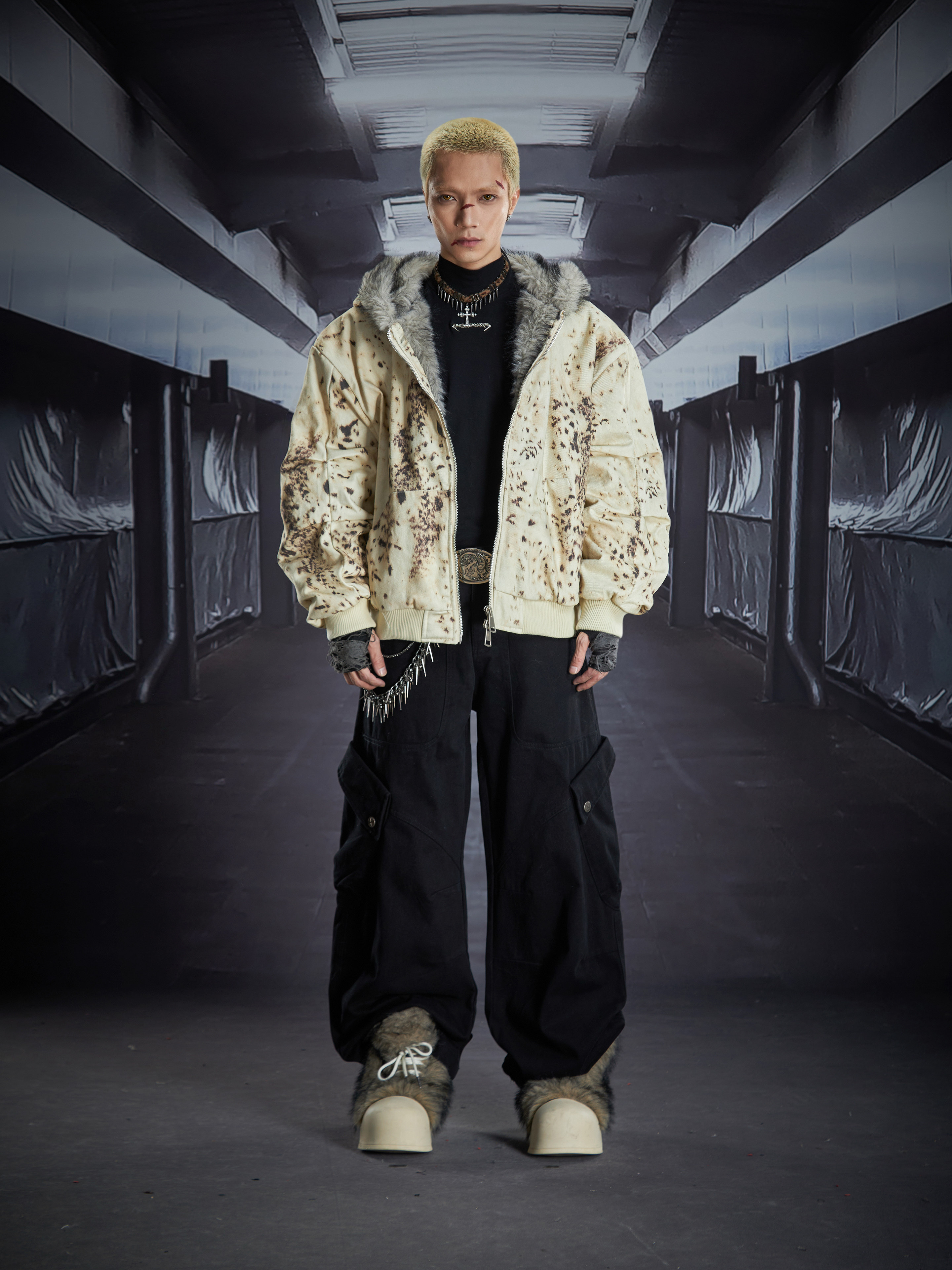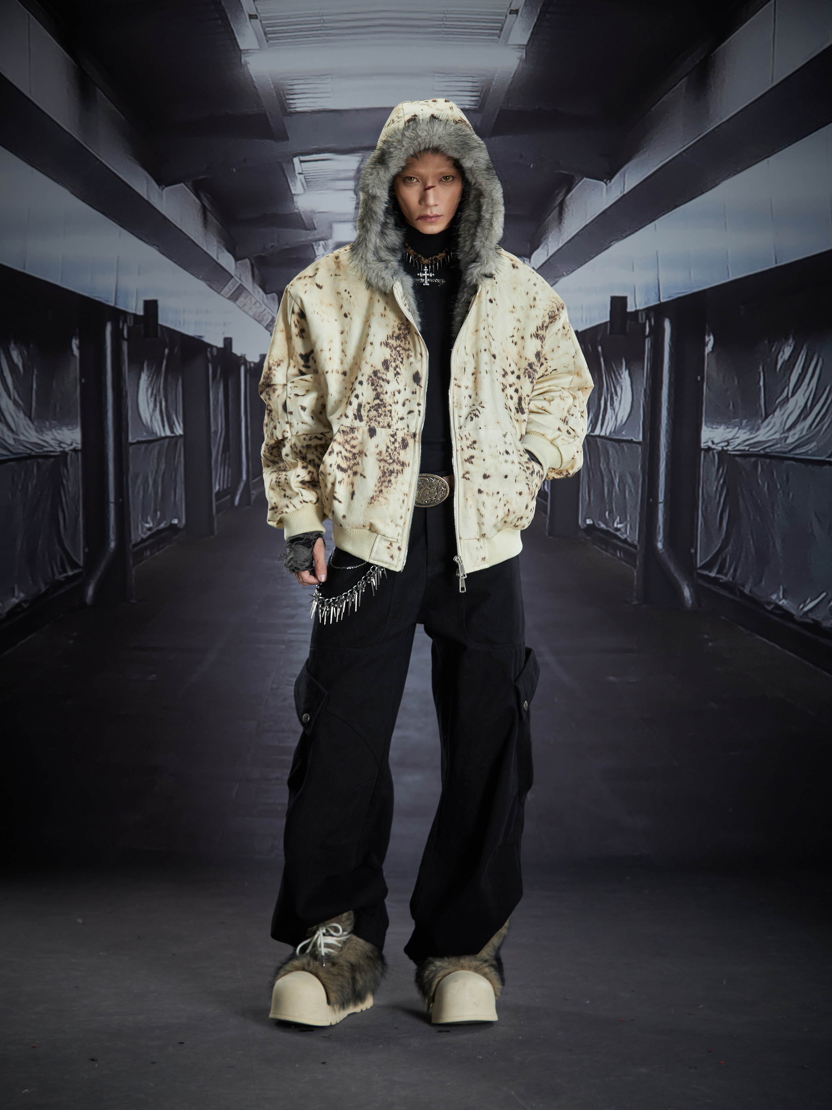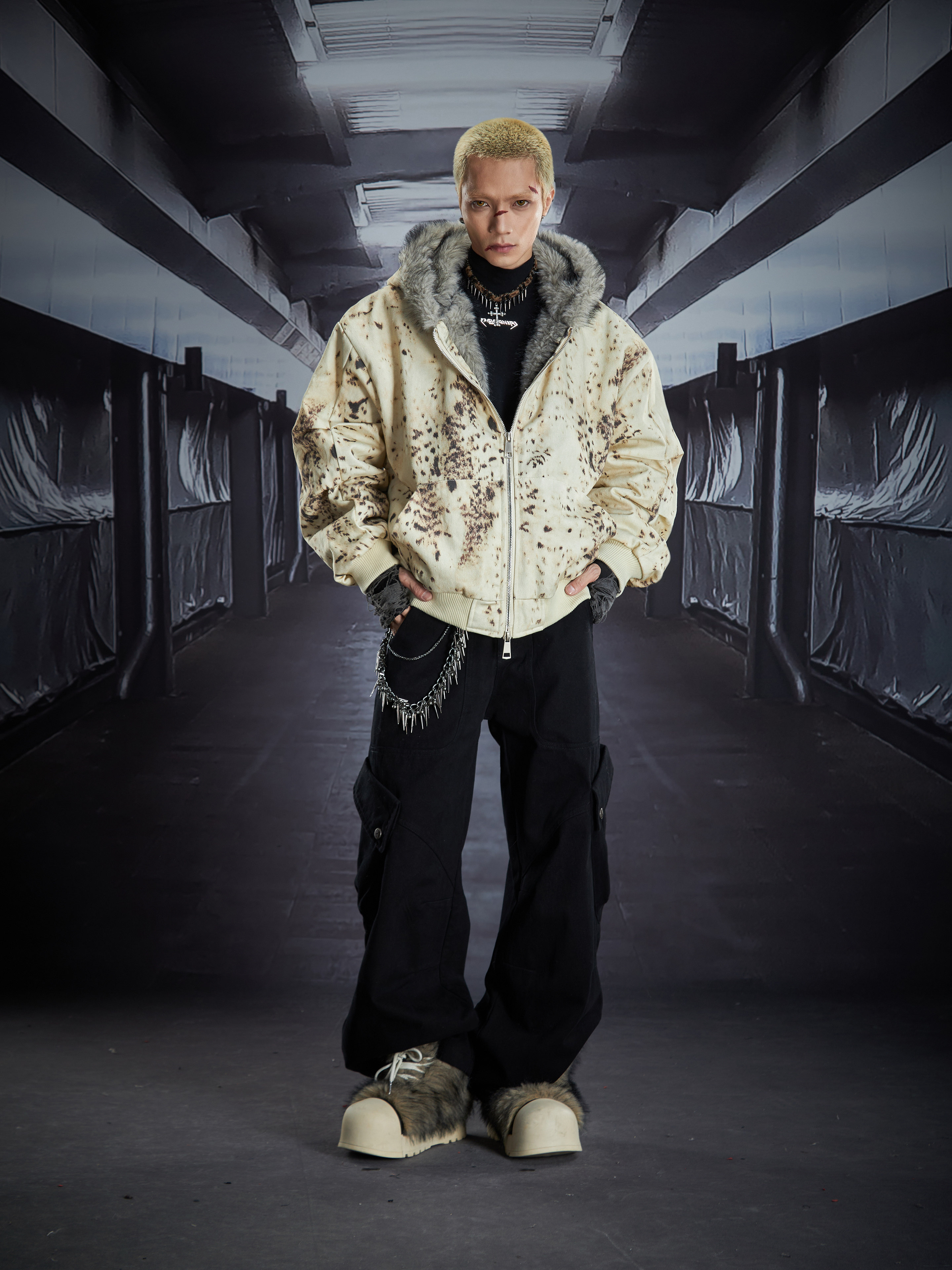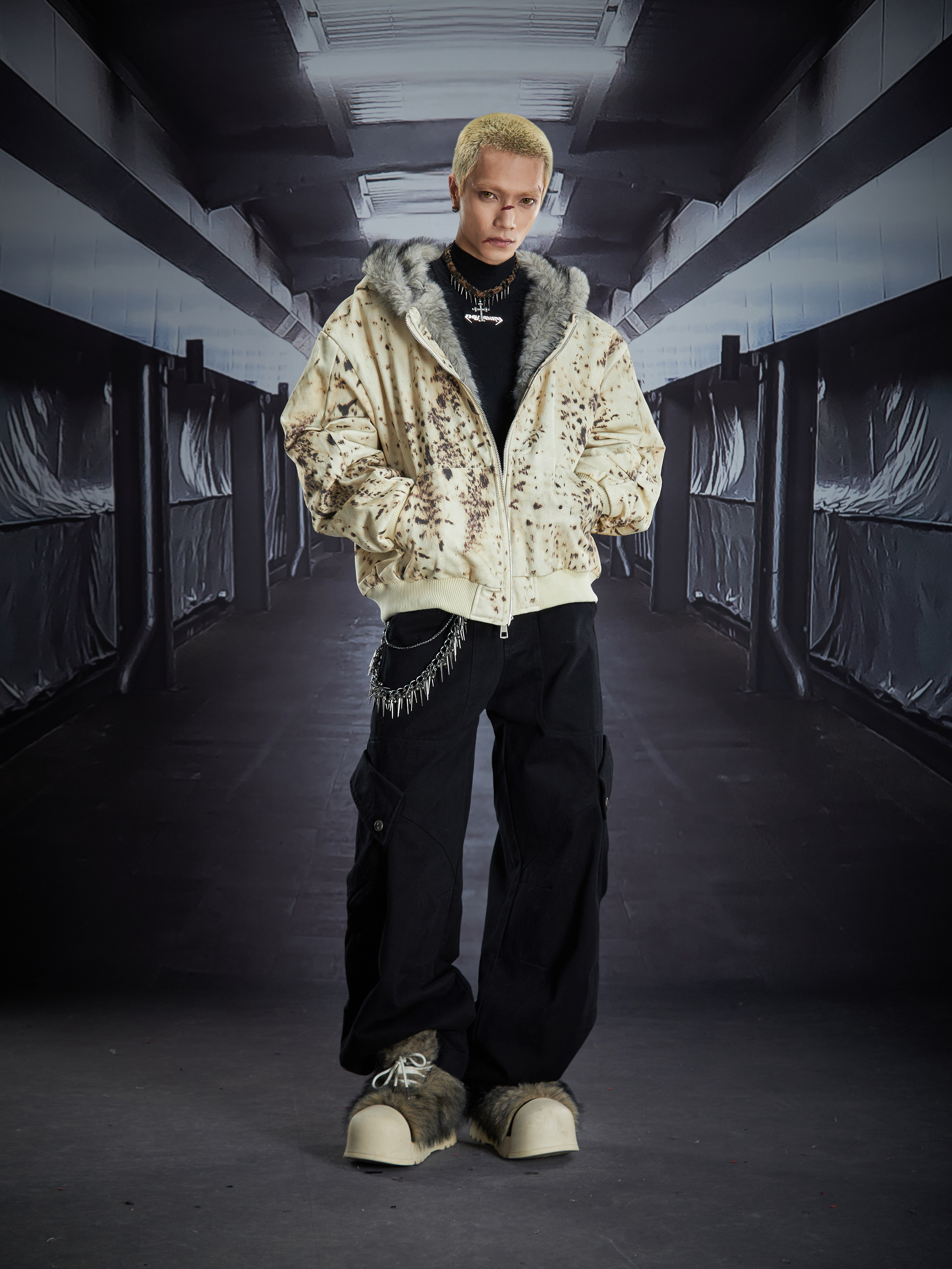 Washed Damage Fake Fur Hooded Cropped Padded Jacket WN22829