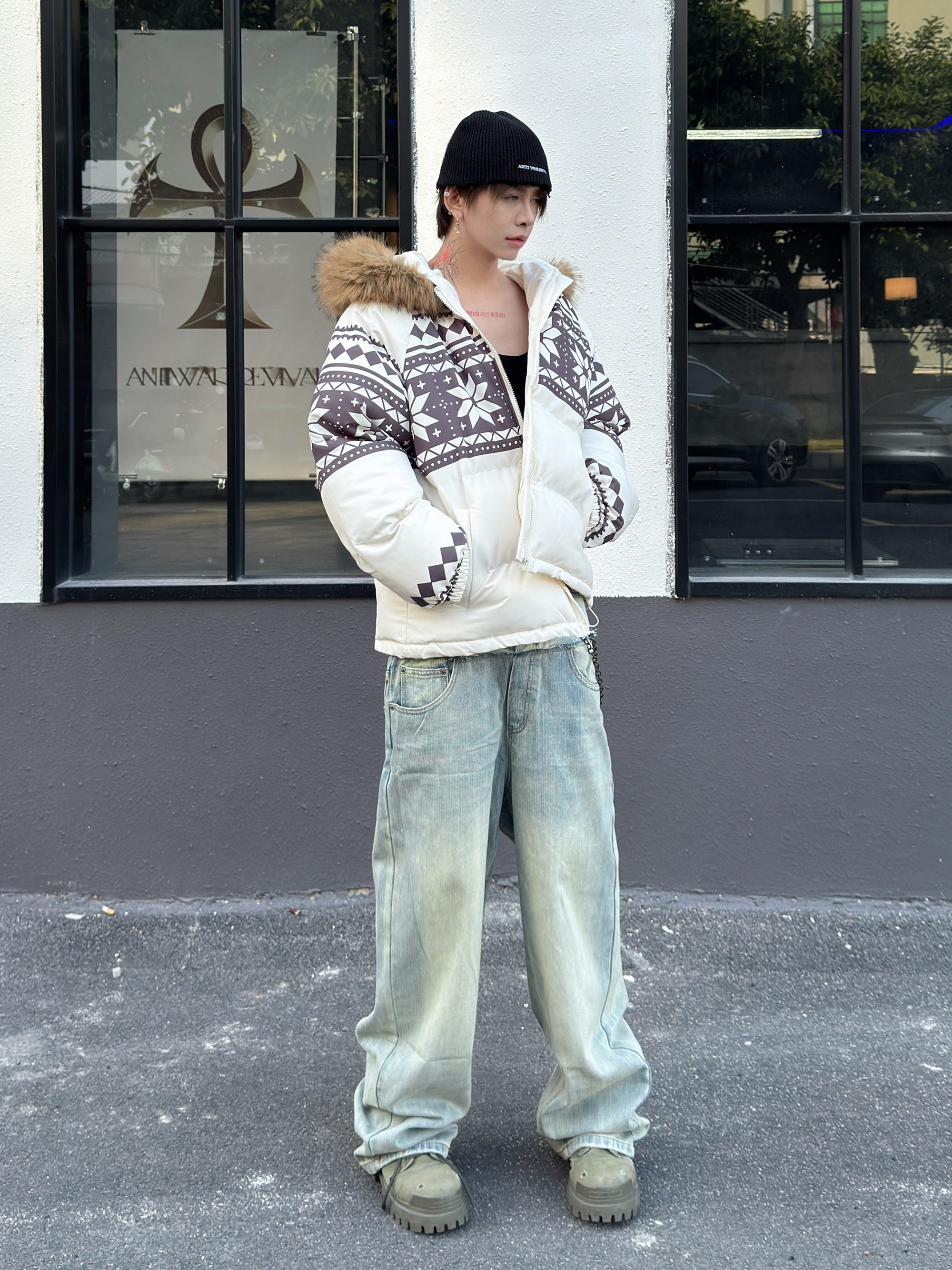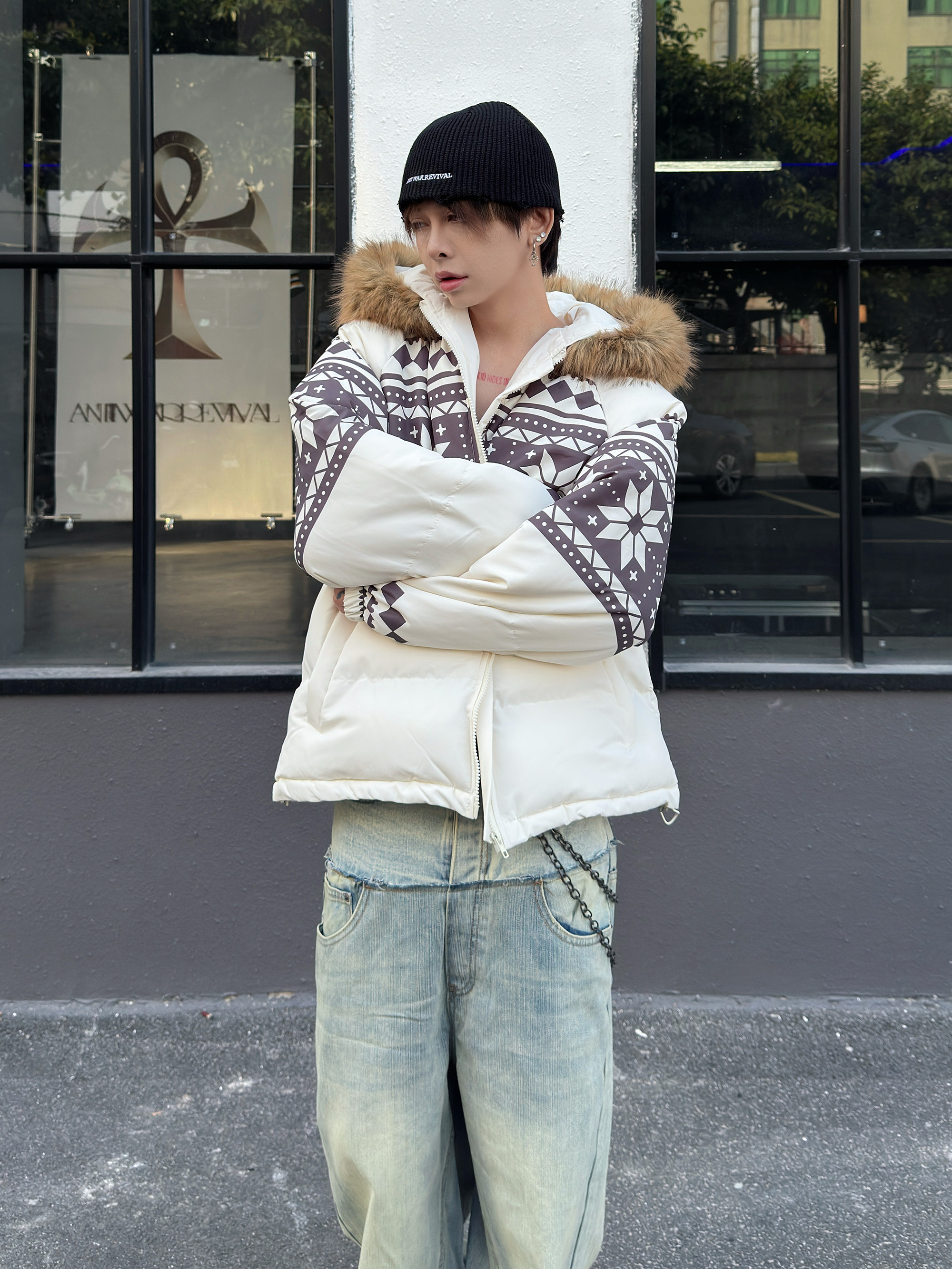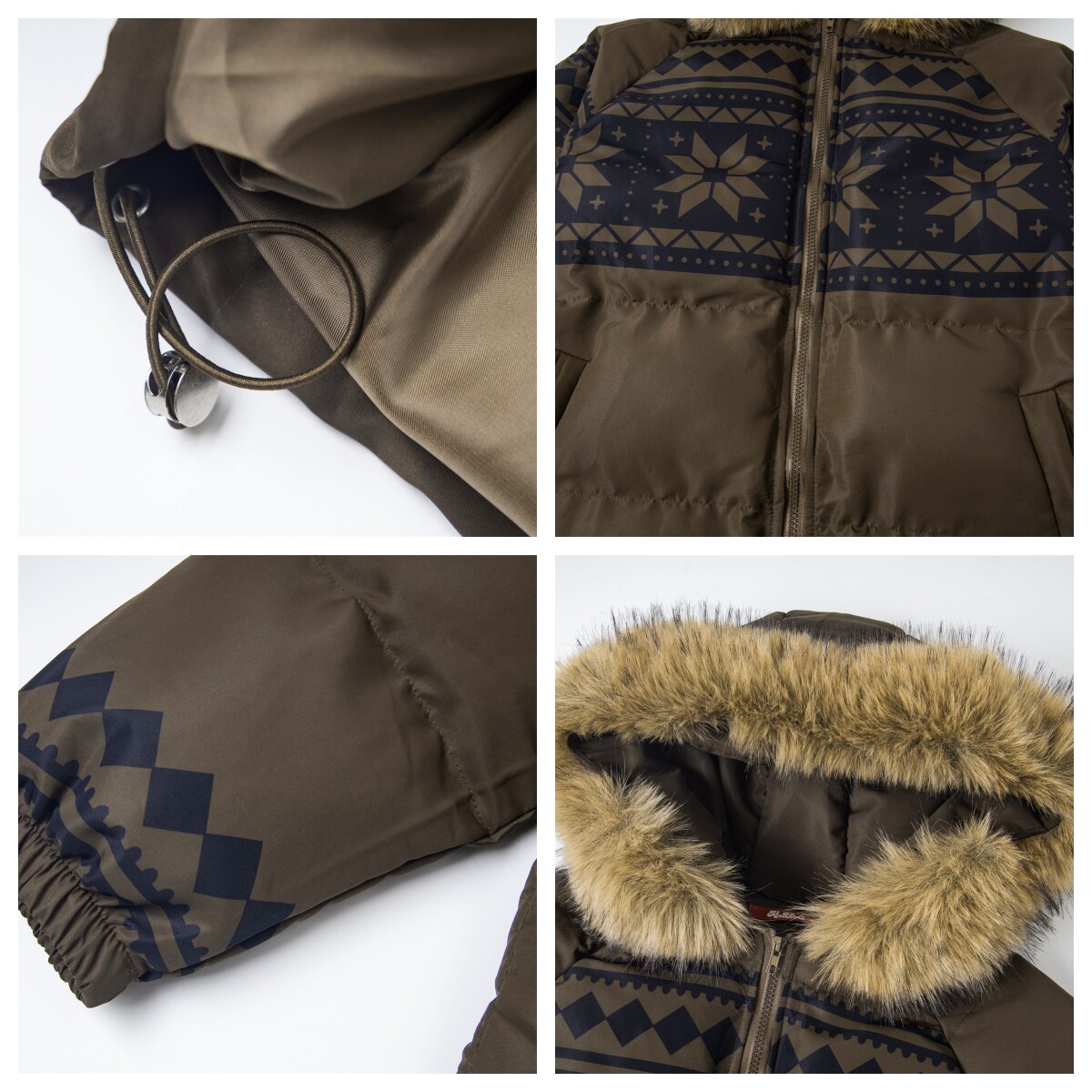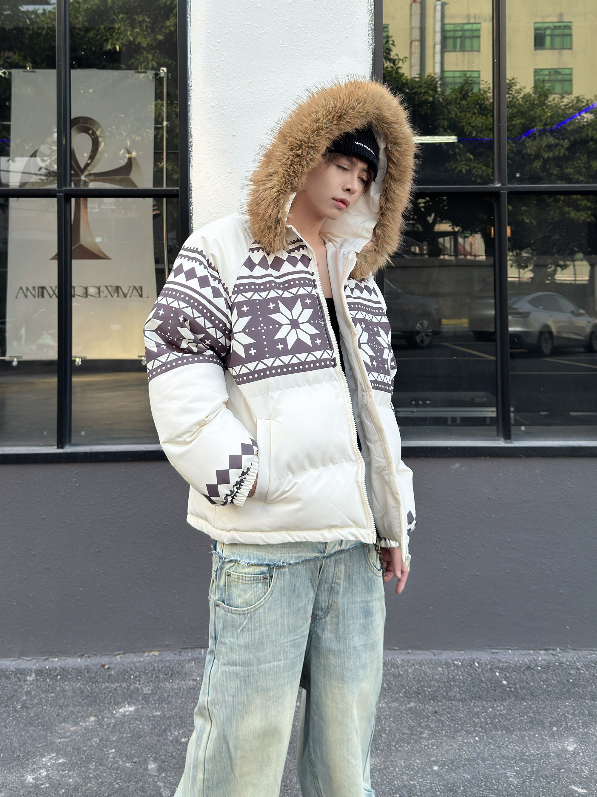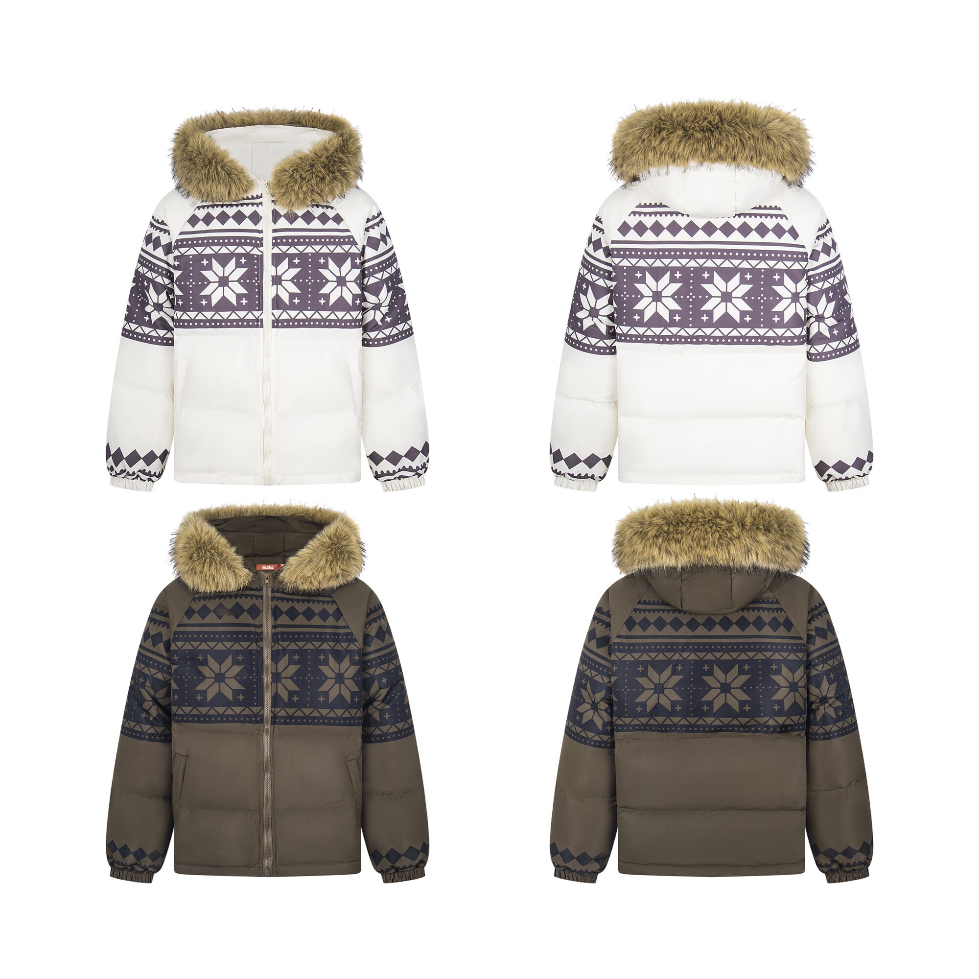 Fair Isle Lamb Fleece Fur Collar Hooded Puffer Jacket WN23010