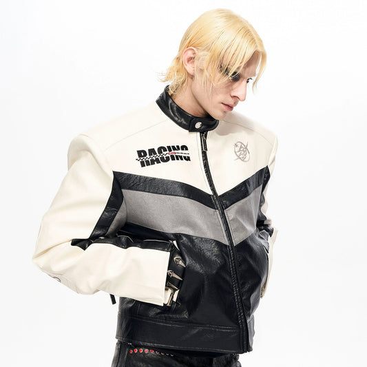 Stand Neck Shoulder Pad Short PU Leather Jacket WN5037