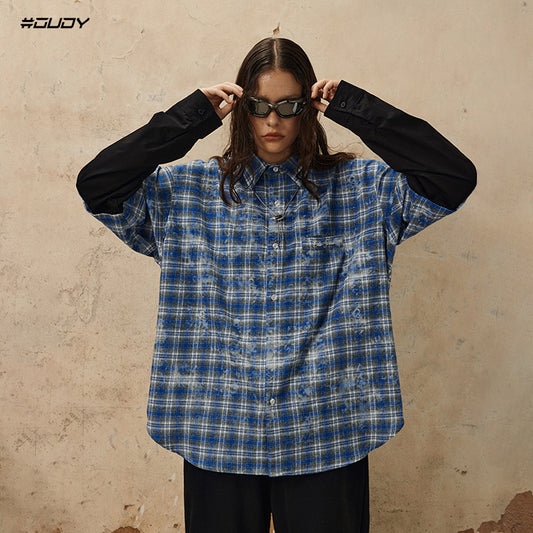 Plaid Fake Layered Letter Embroidery Dyeing Long Sleeve Shirt WN12439