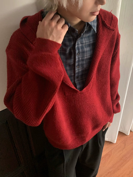 Plaid Patch Fake Layered Hooded Knit Sweater WN22228
