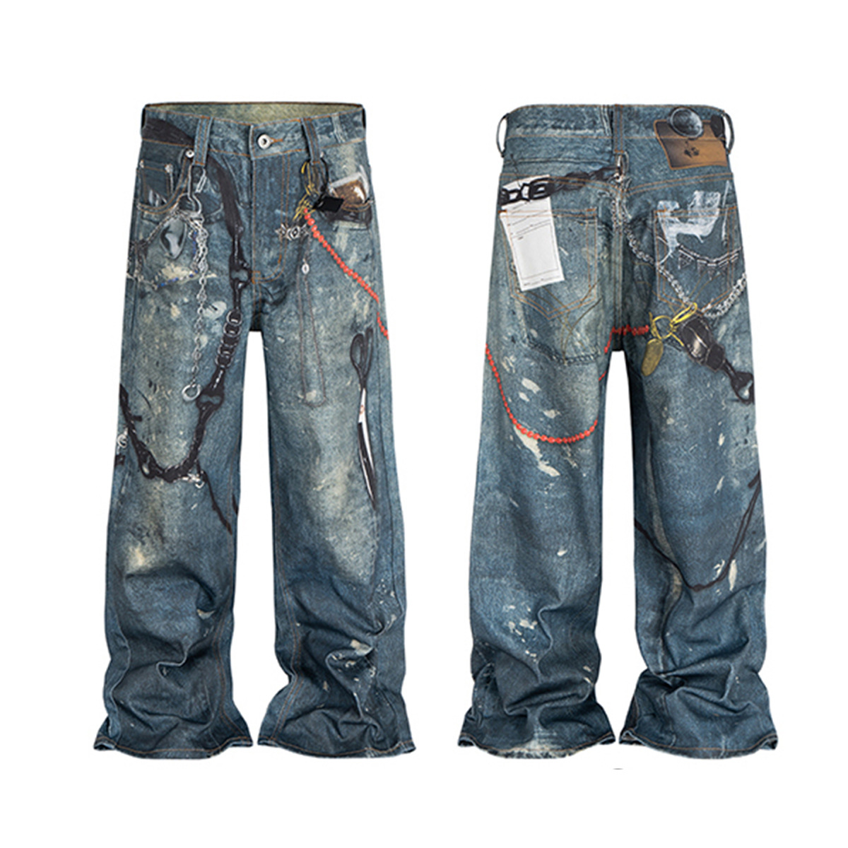3D Print Washed Wide-Leg Denim Jeans WN11346