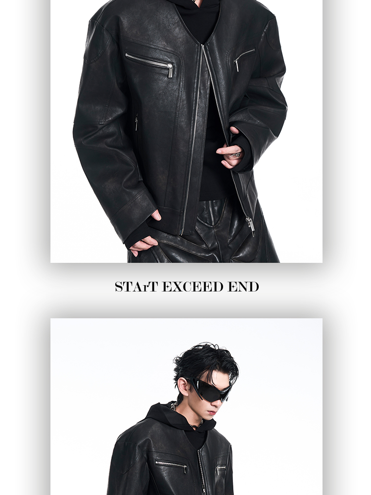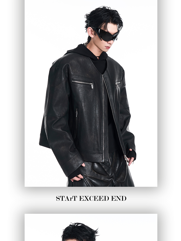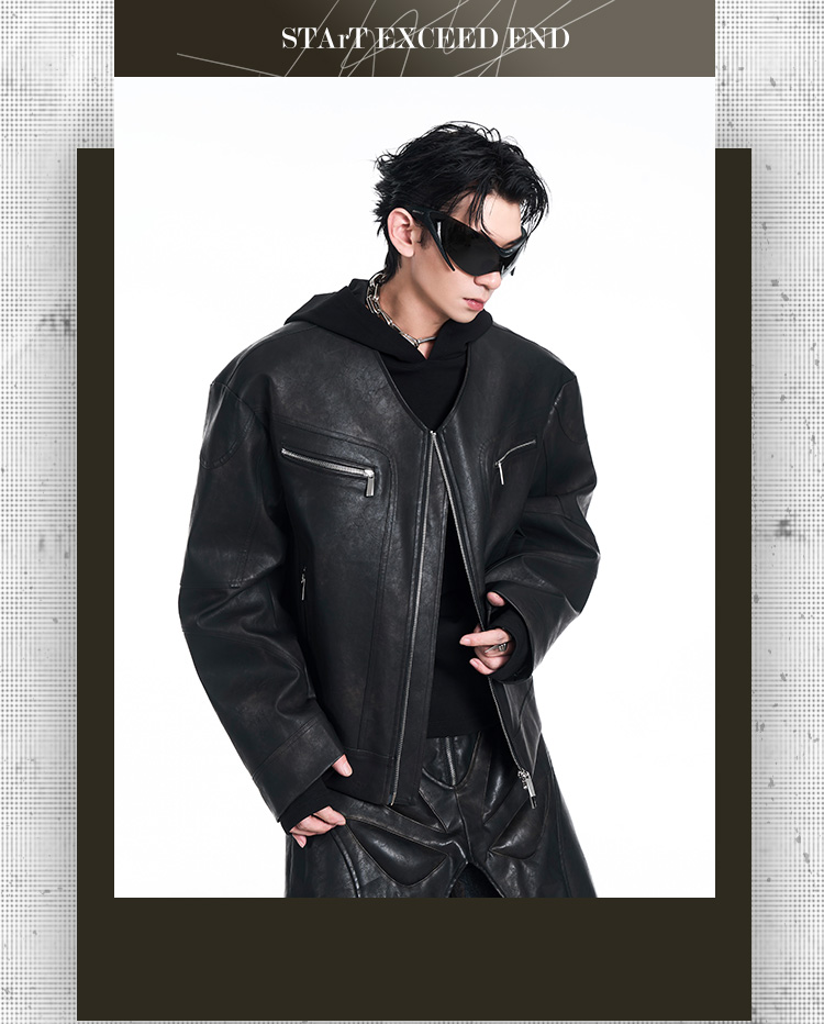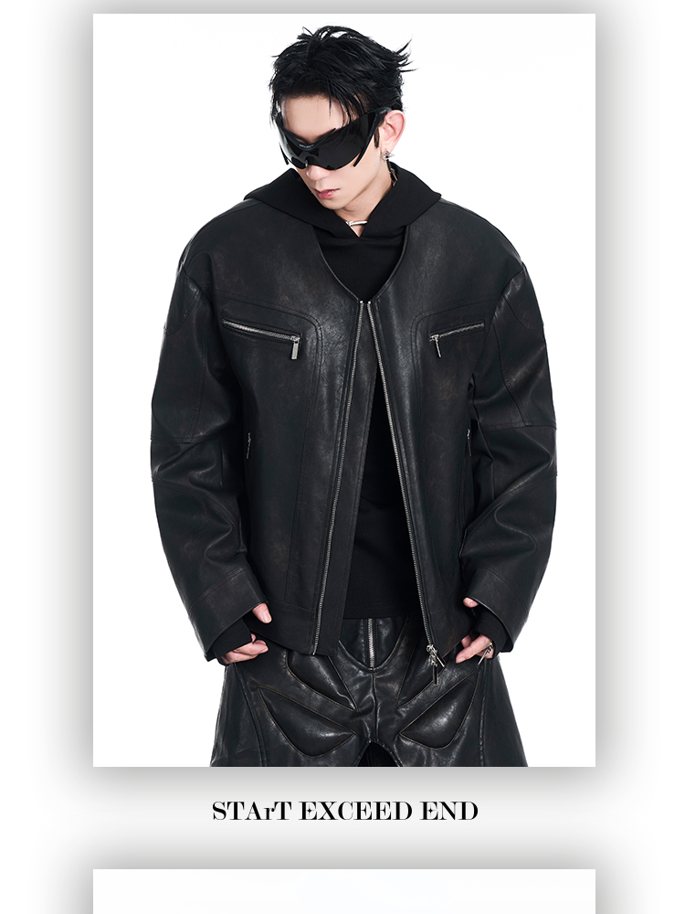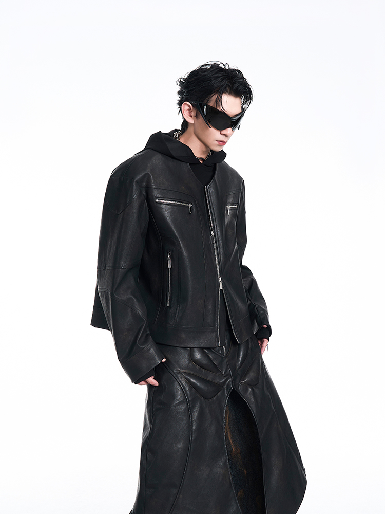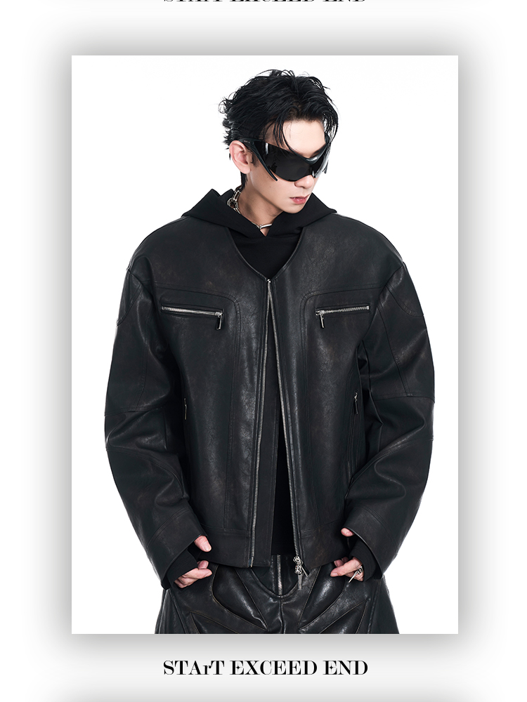 V-Neck Zipper Quilted PU Leather Jacket WN11712
