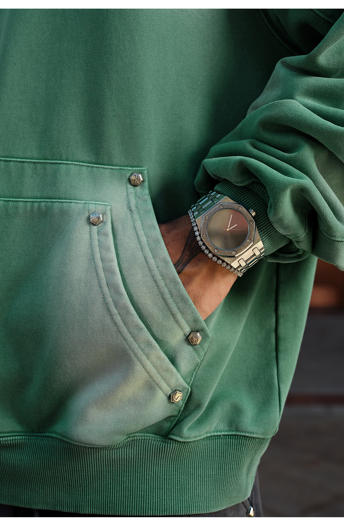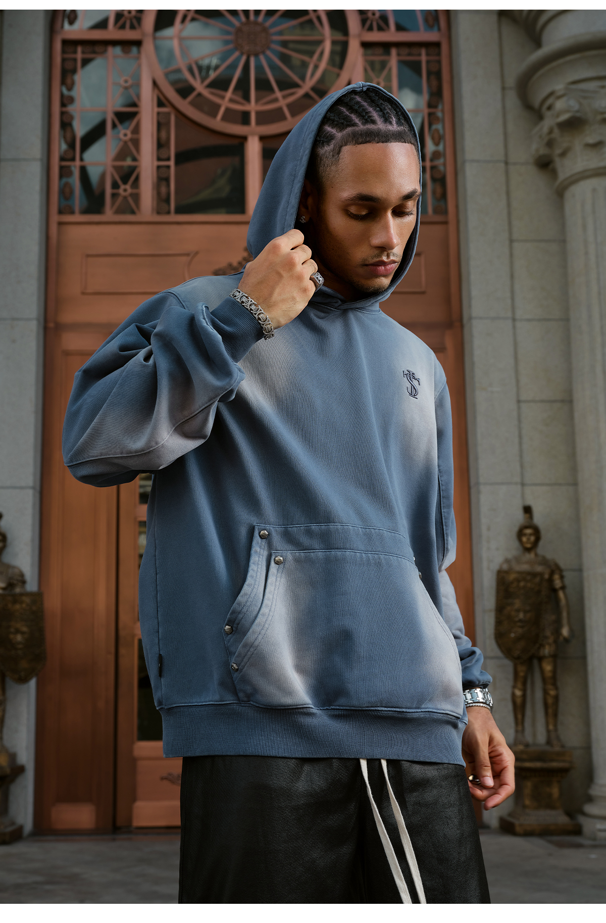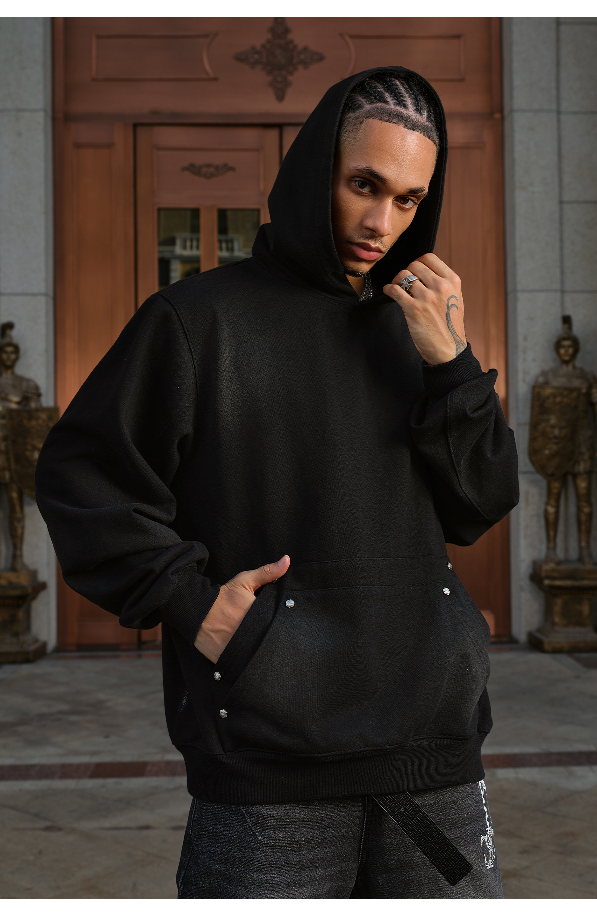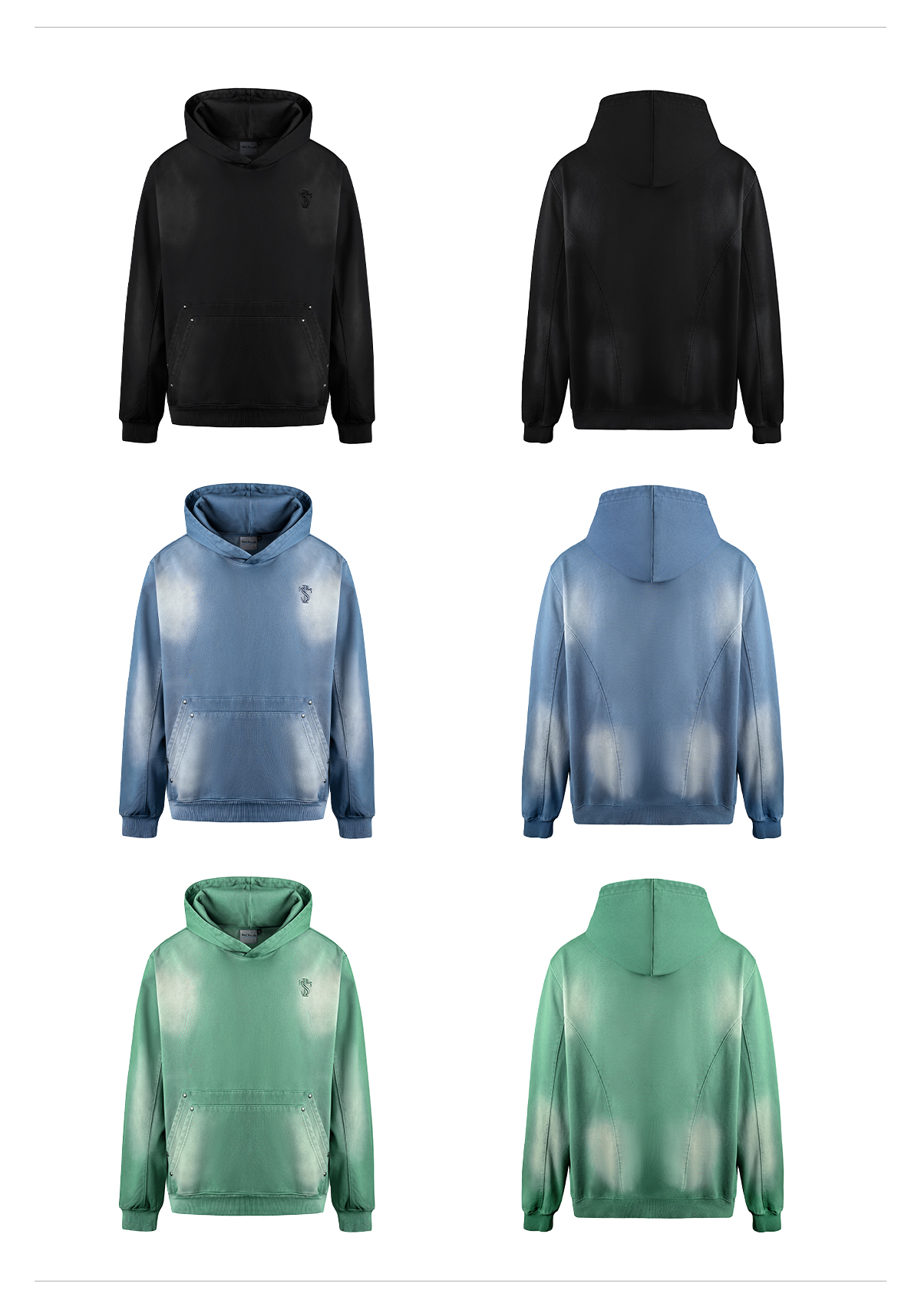 Double-Pocket Studded Washed Pullover Hoodie WN11984