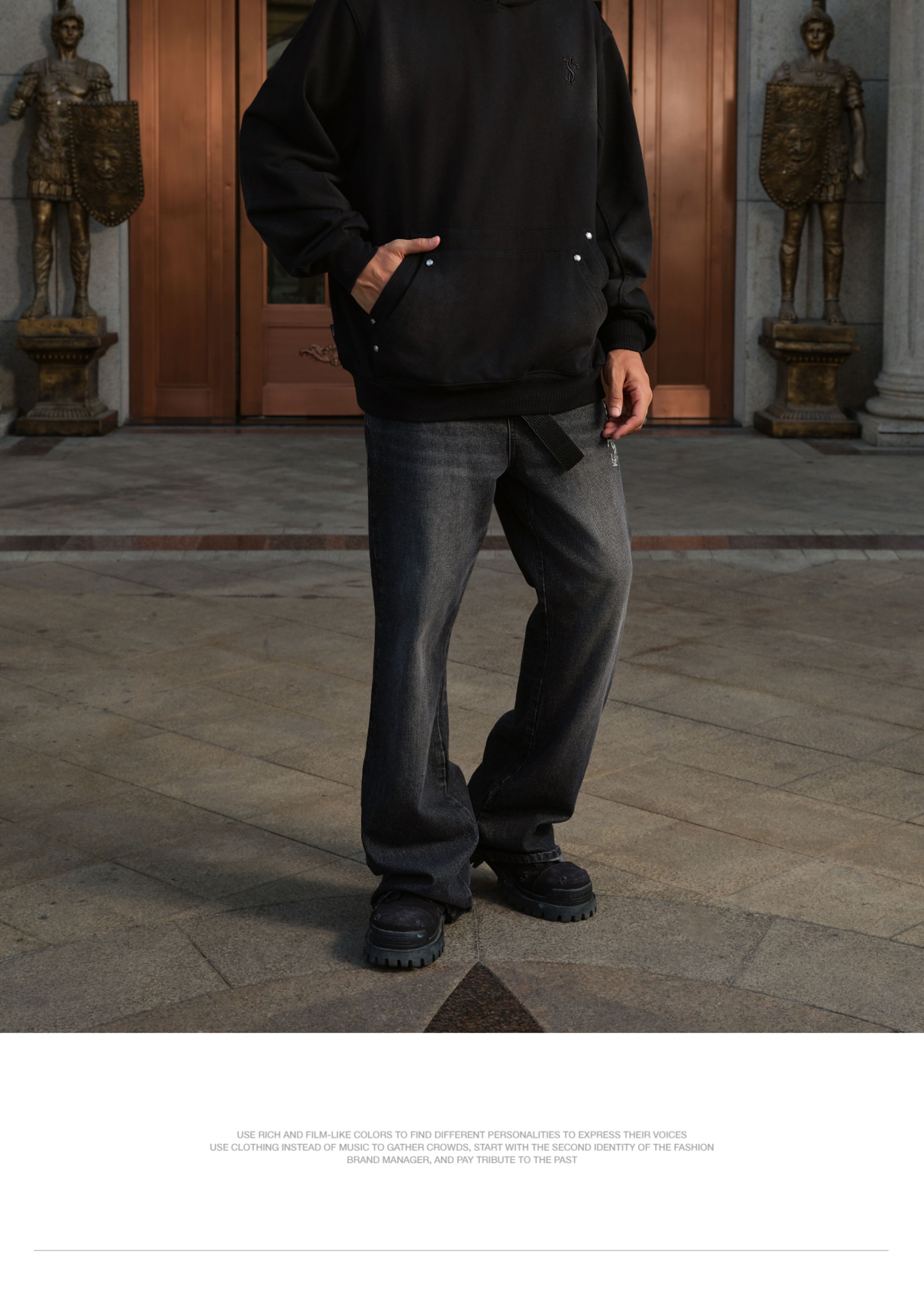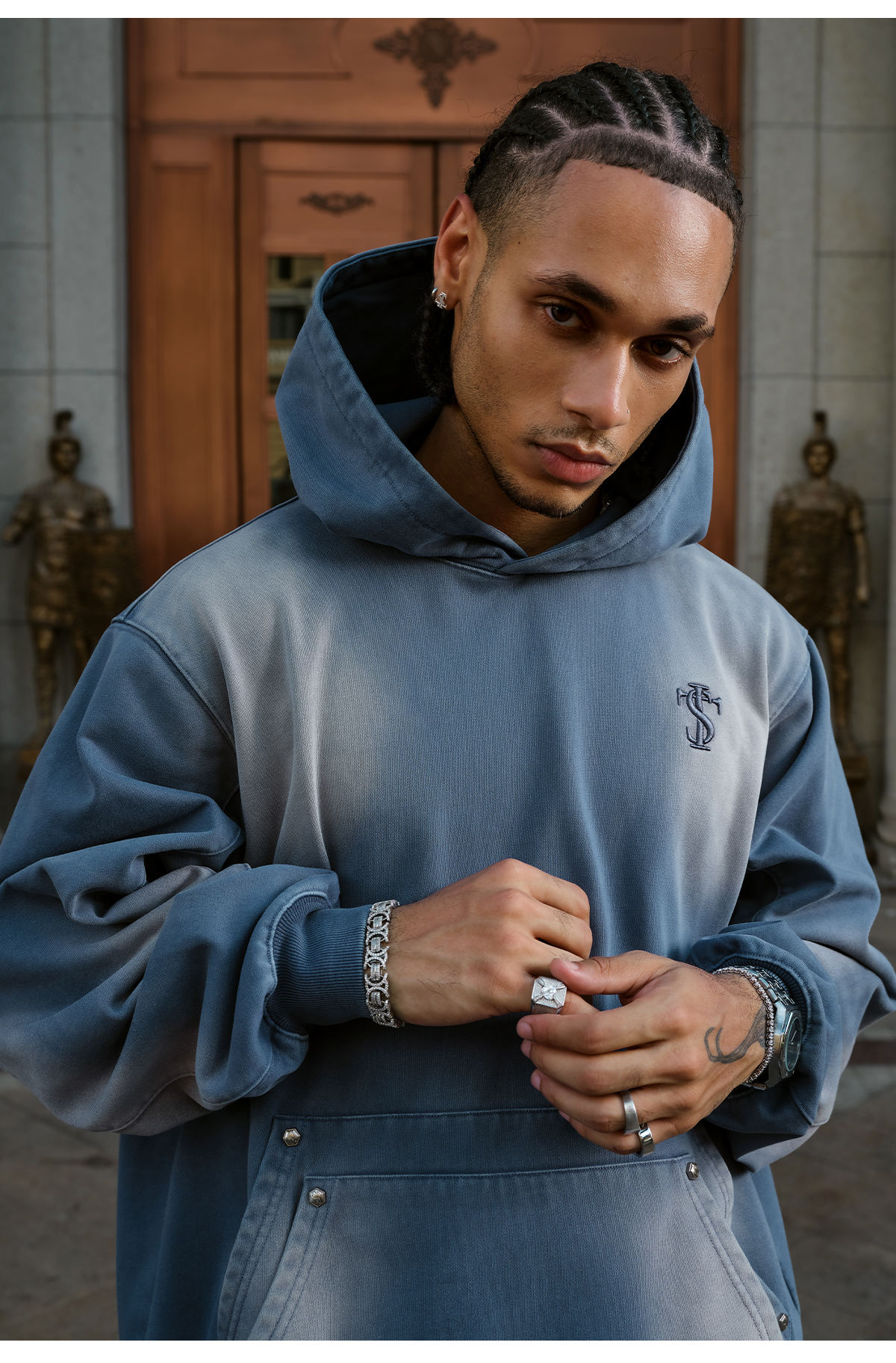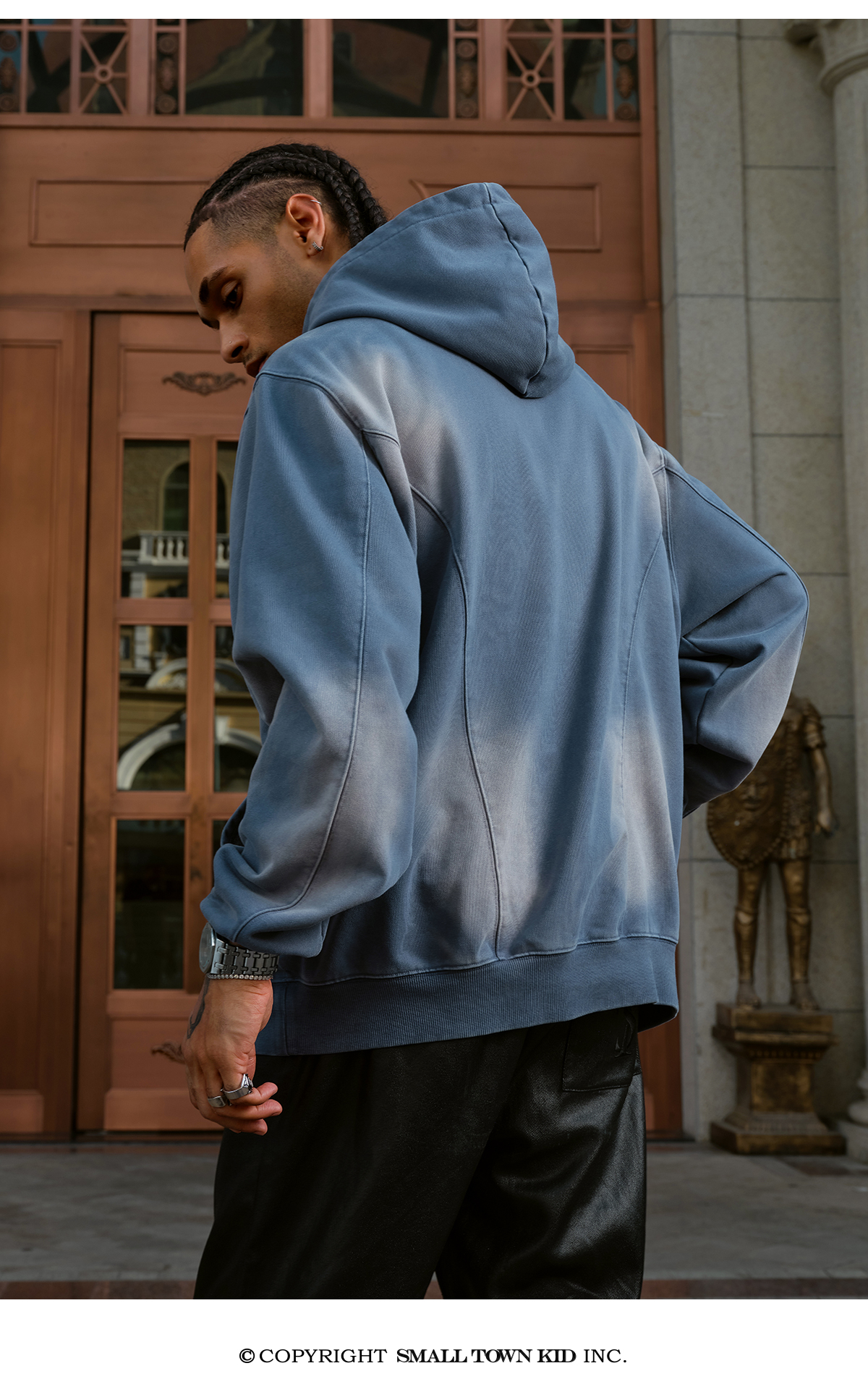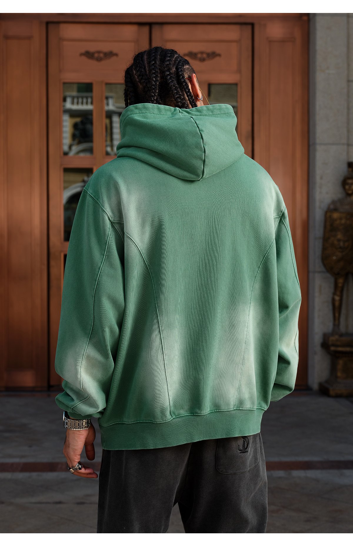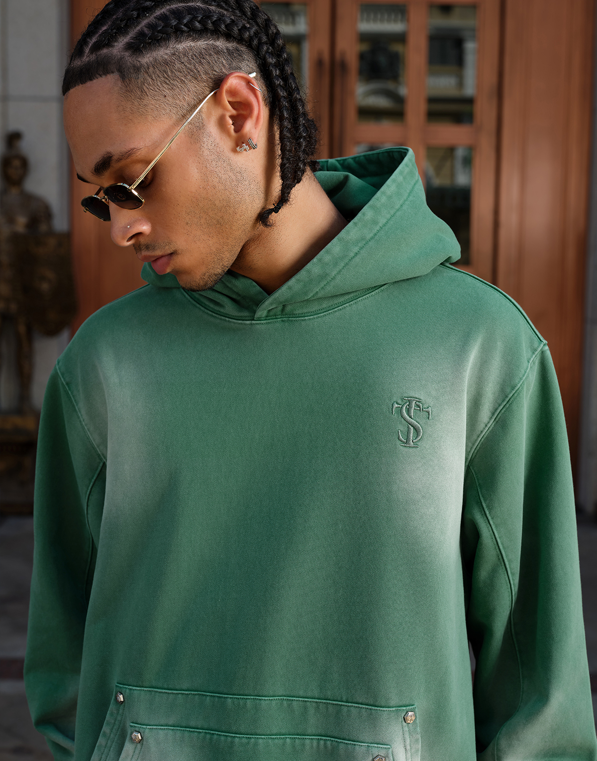 Double-Pocket Studded Washed Pullover Hoodie WN11984