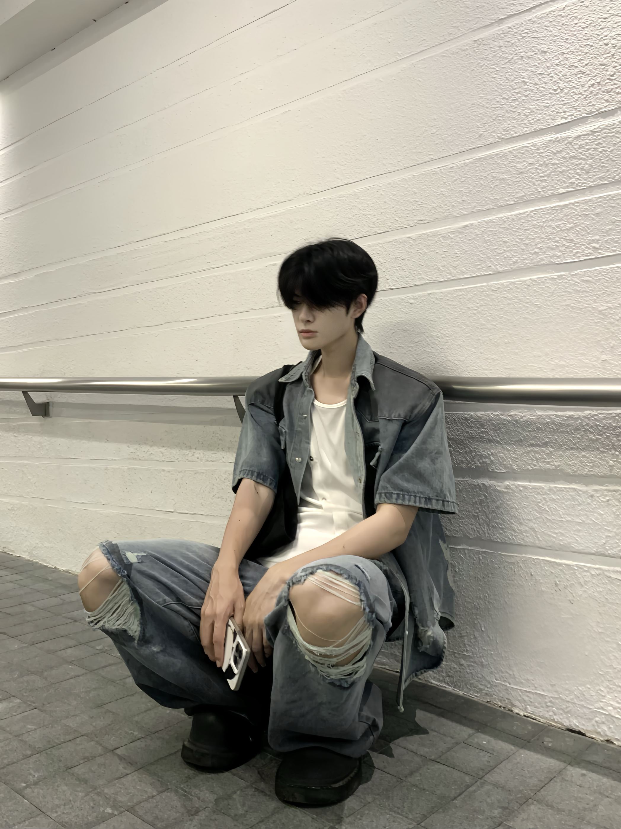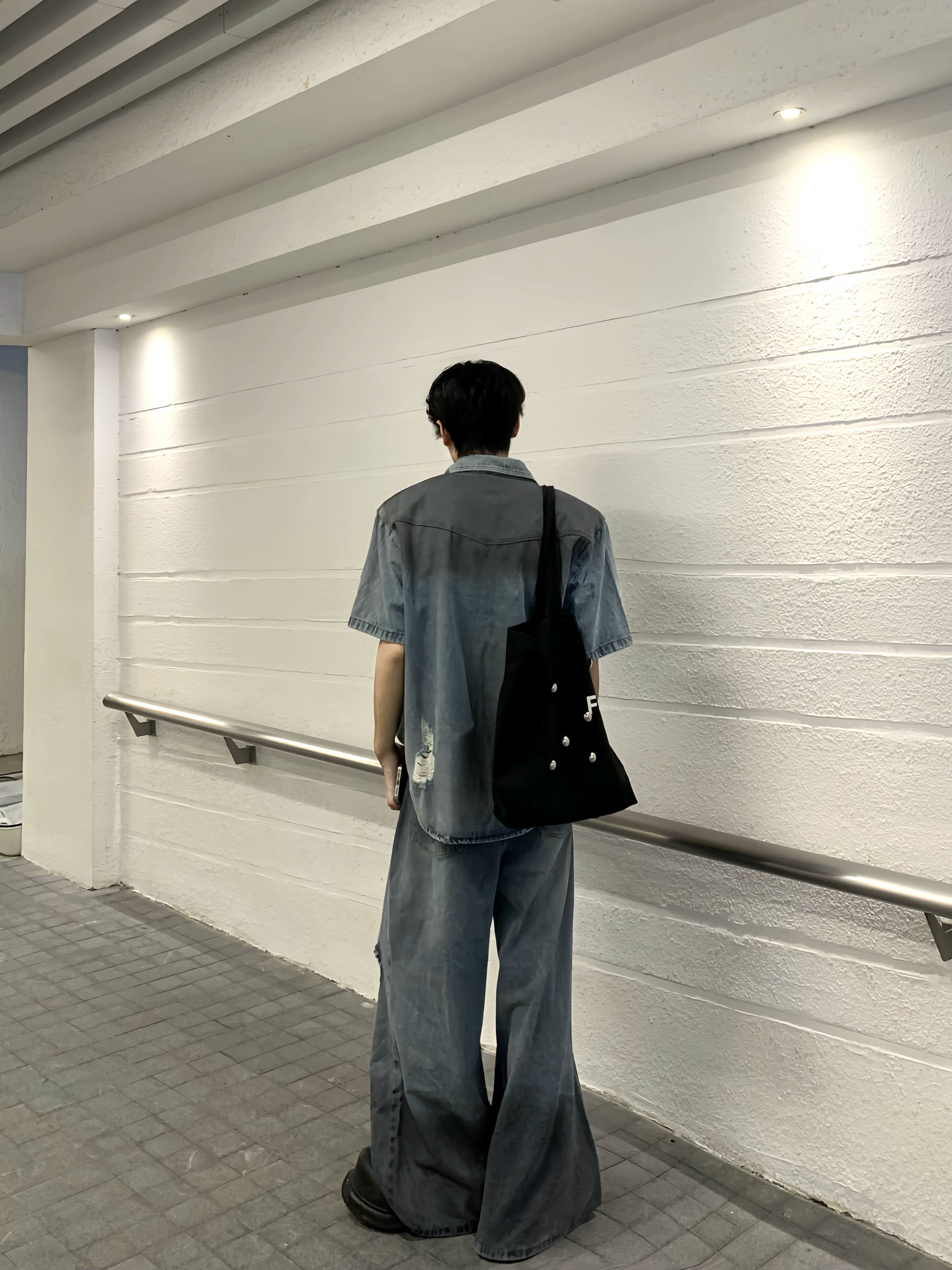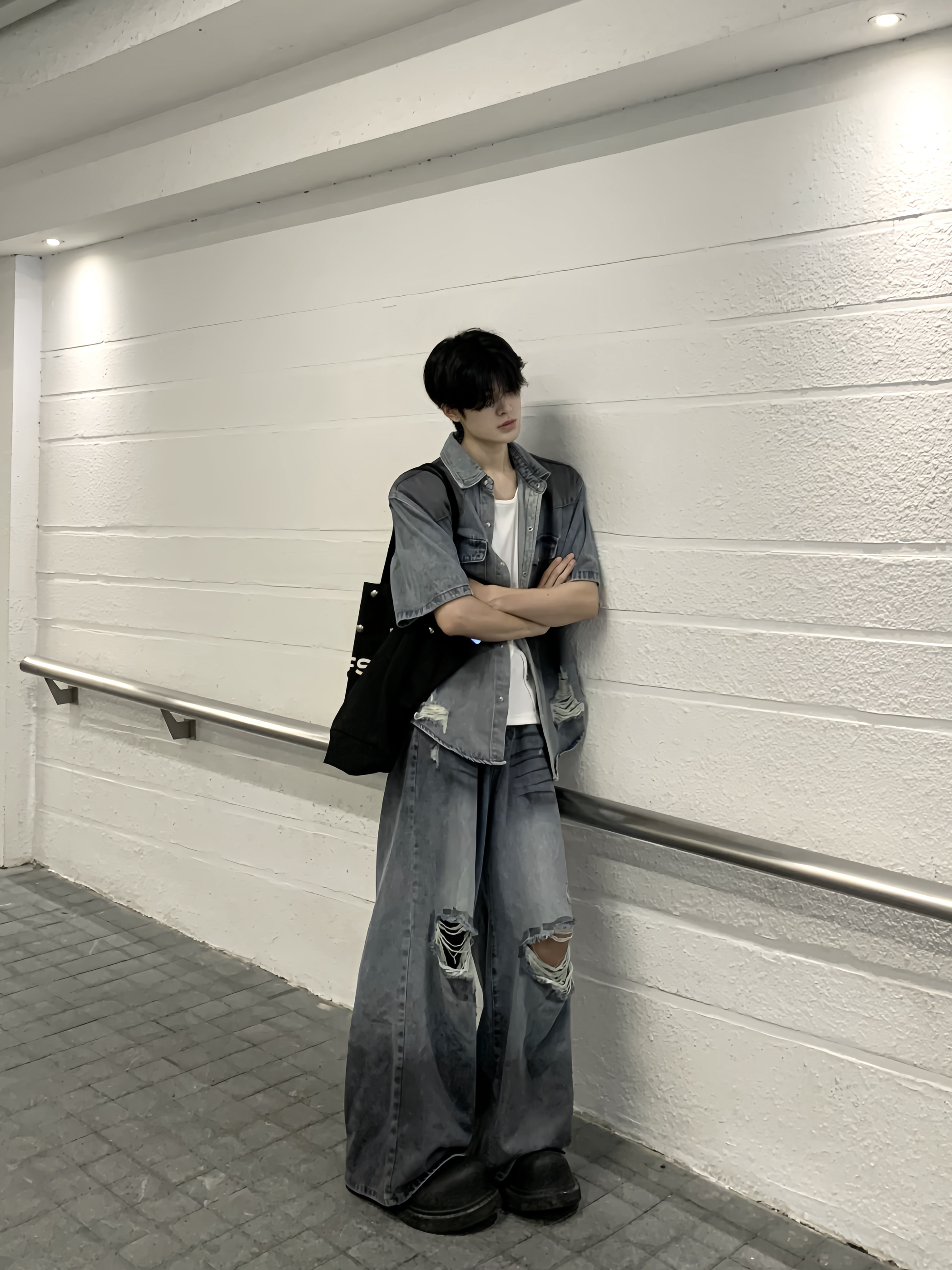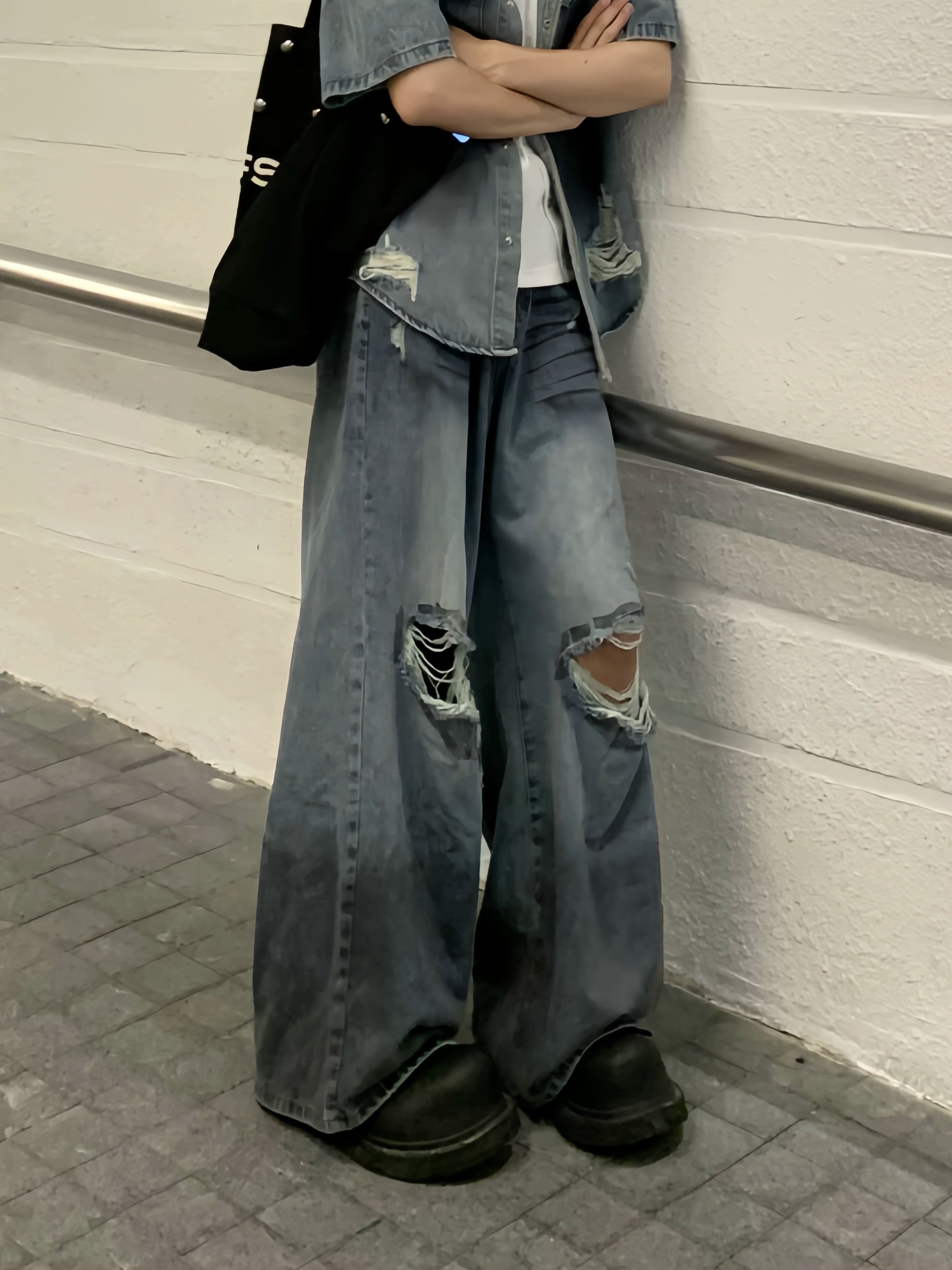 Washed Damage Deconstructed Denim Jacket & Damage Wide Leg Denim Jeans Setup WN19814