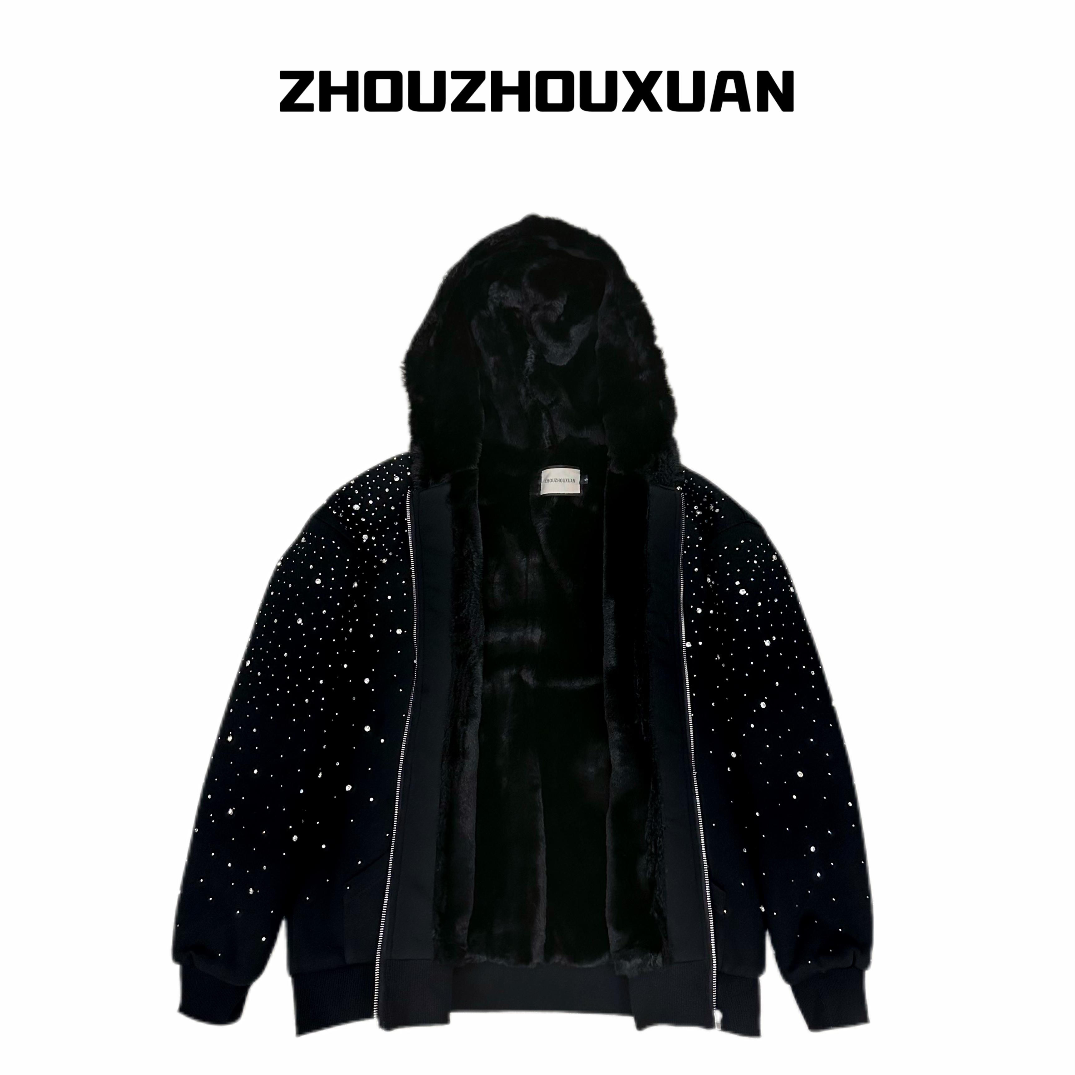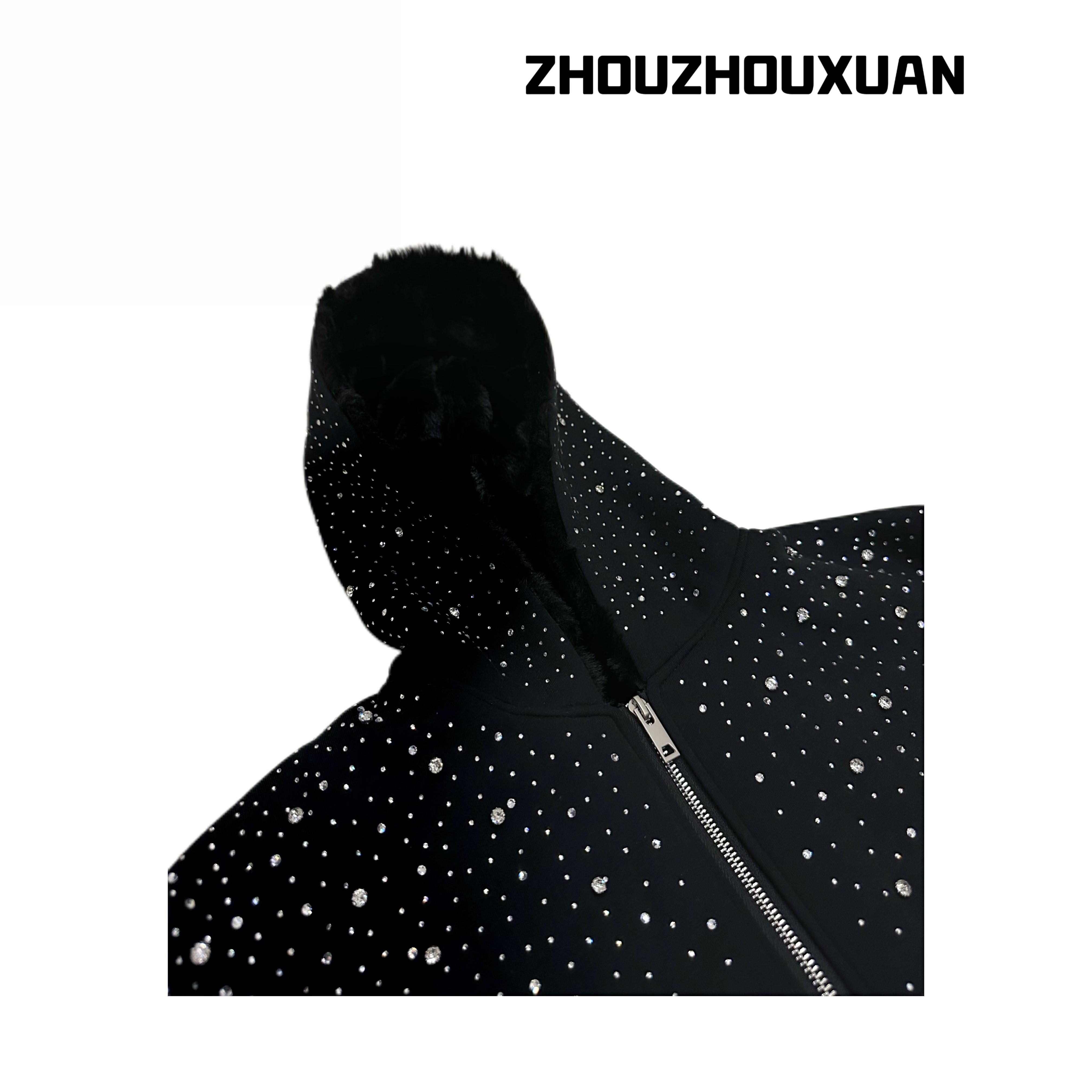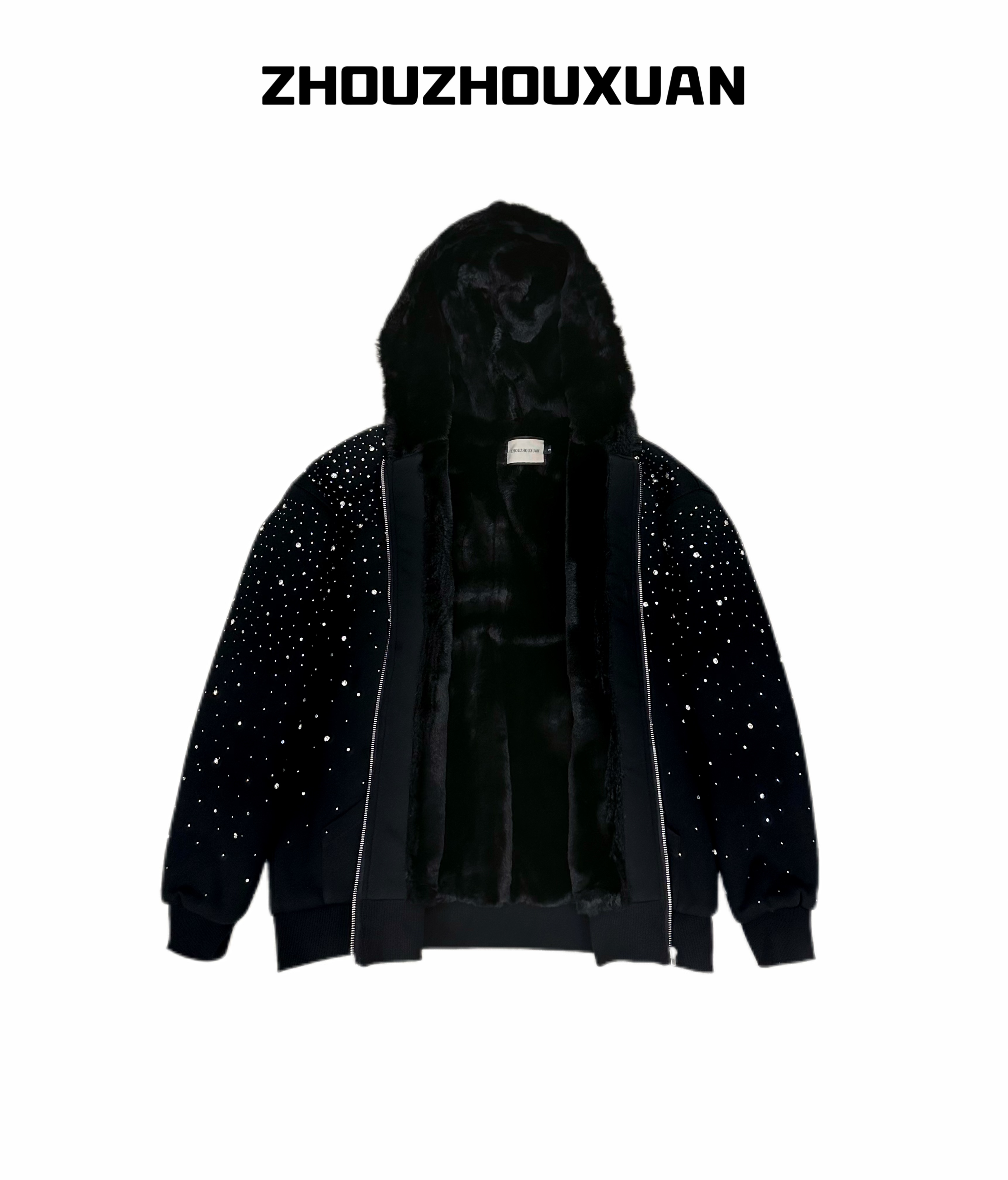 Rhinestone Fleece Lining Zipper Hooded Jacket WN20715