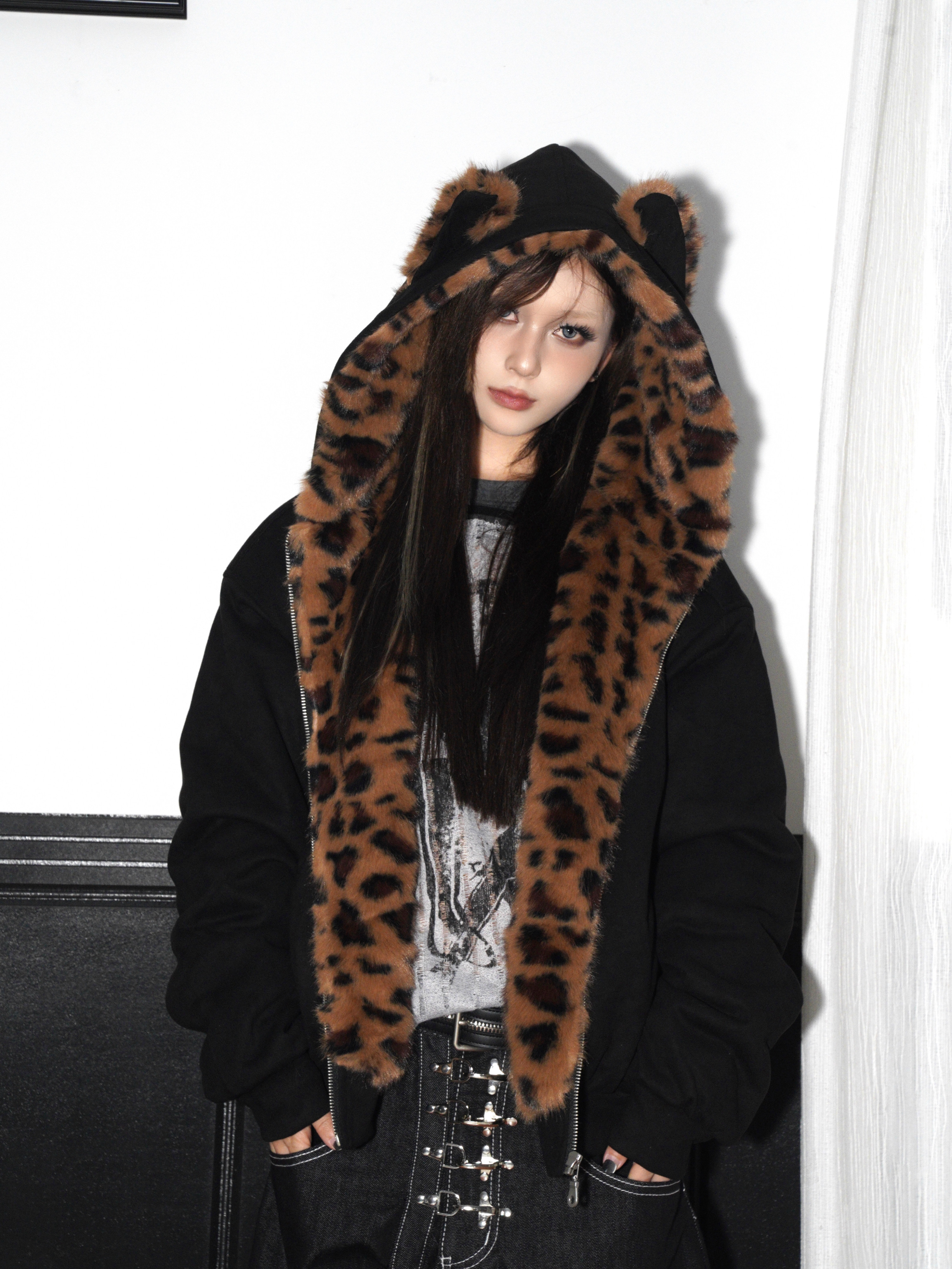 Leopard Fake Fur-Collar Hooded Zipper Jacket WN22210