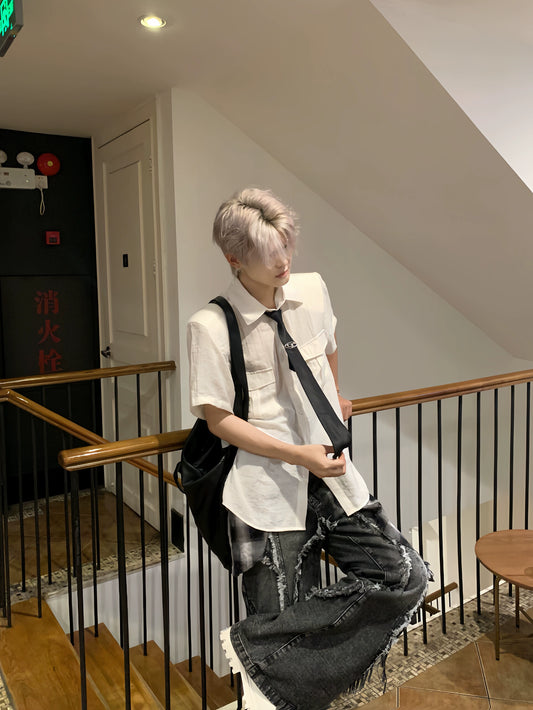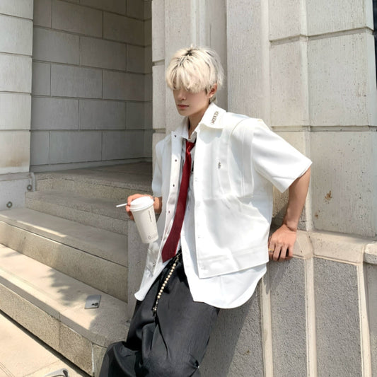 Necktie & Shoulder-Pad Design Short Sleeve Shirt WN19765