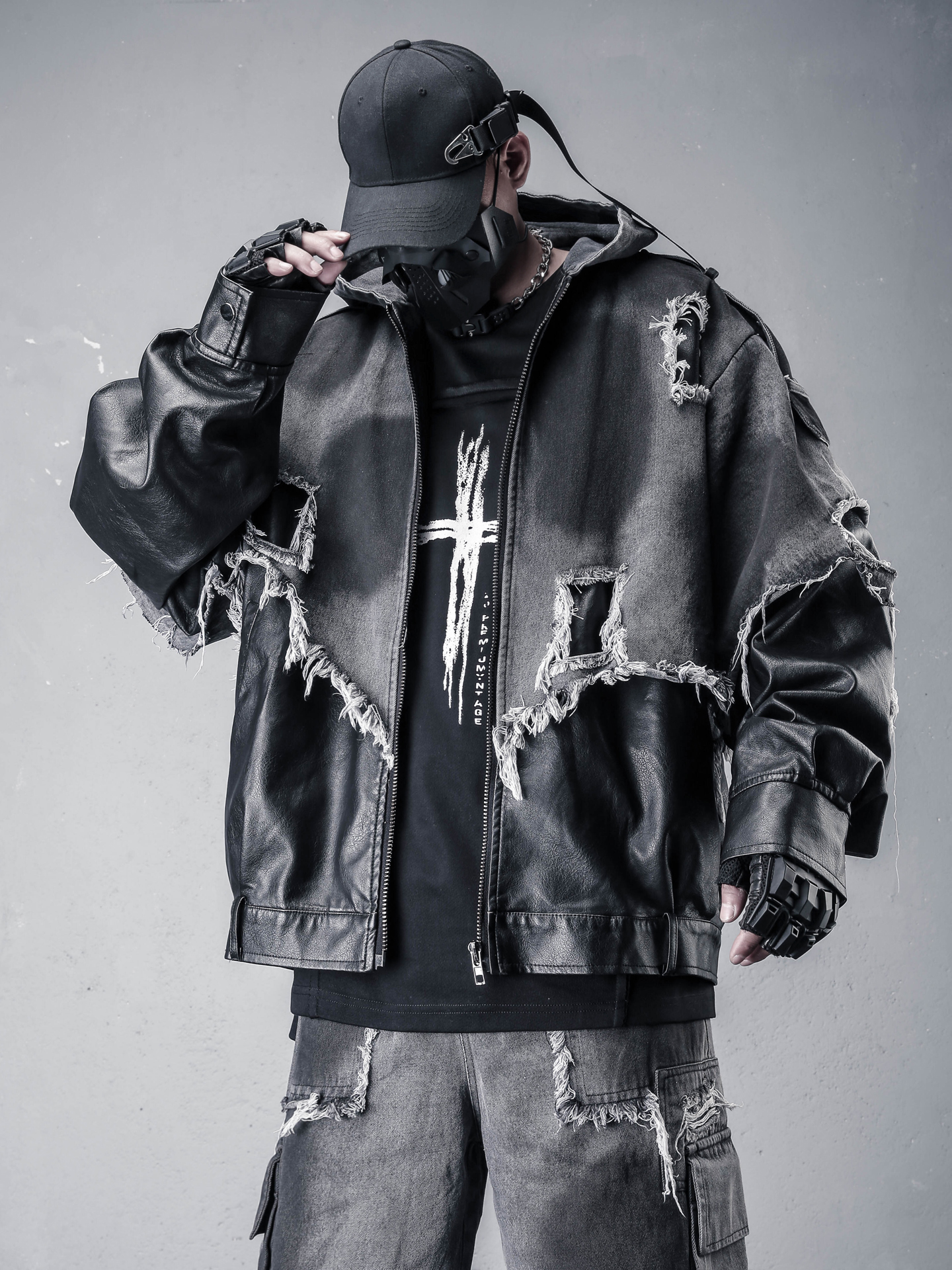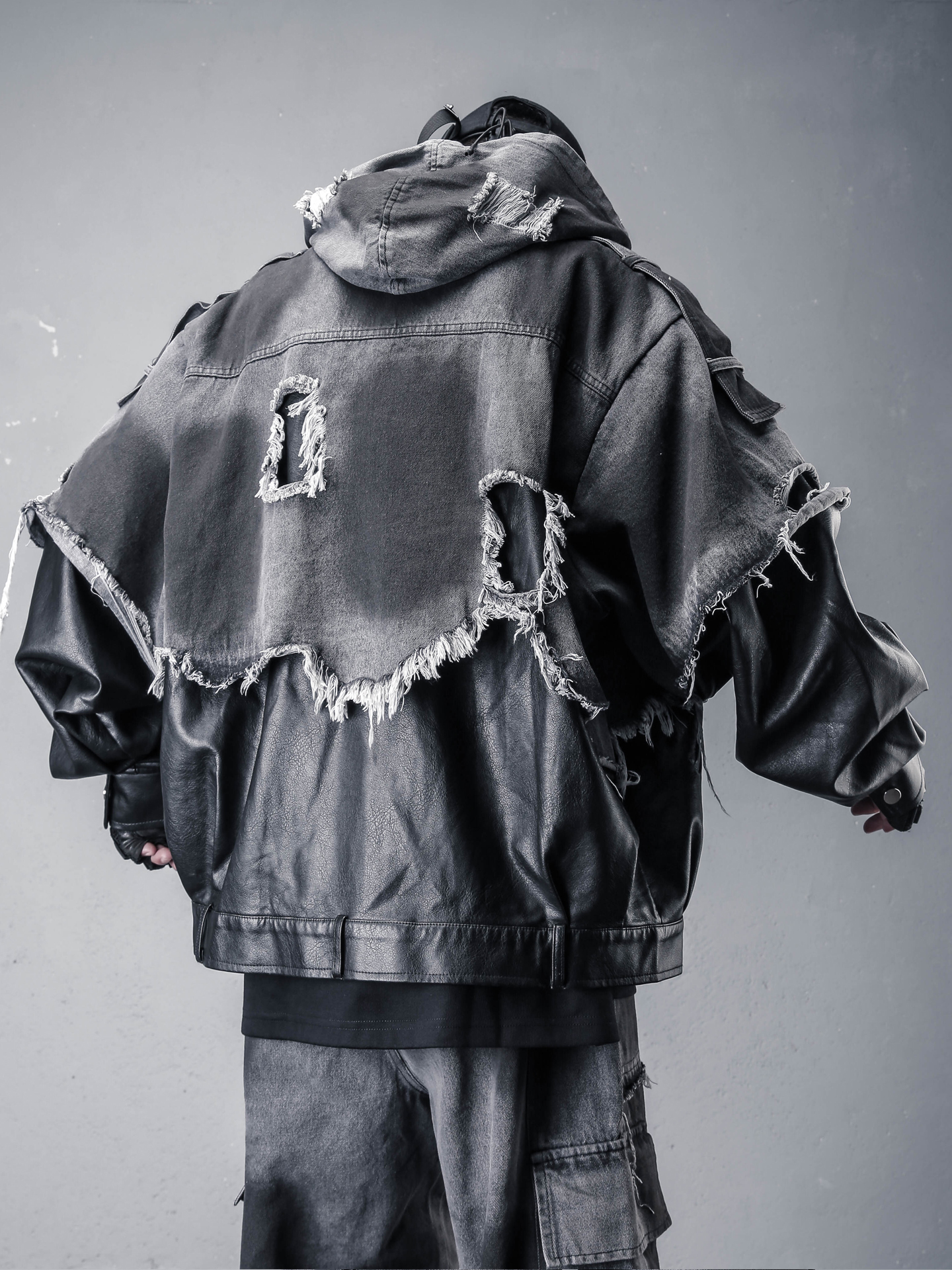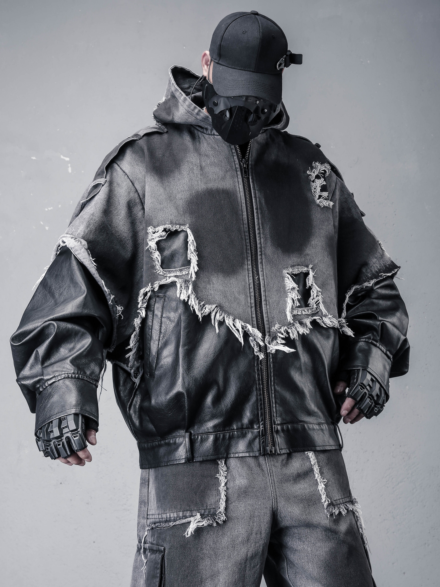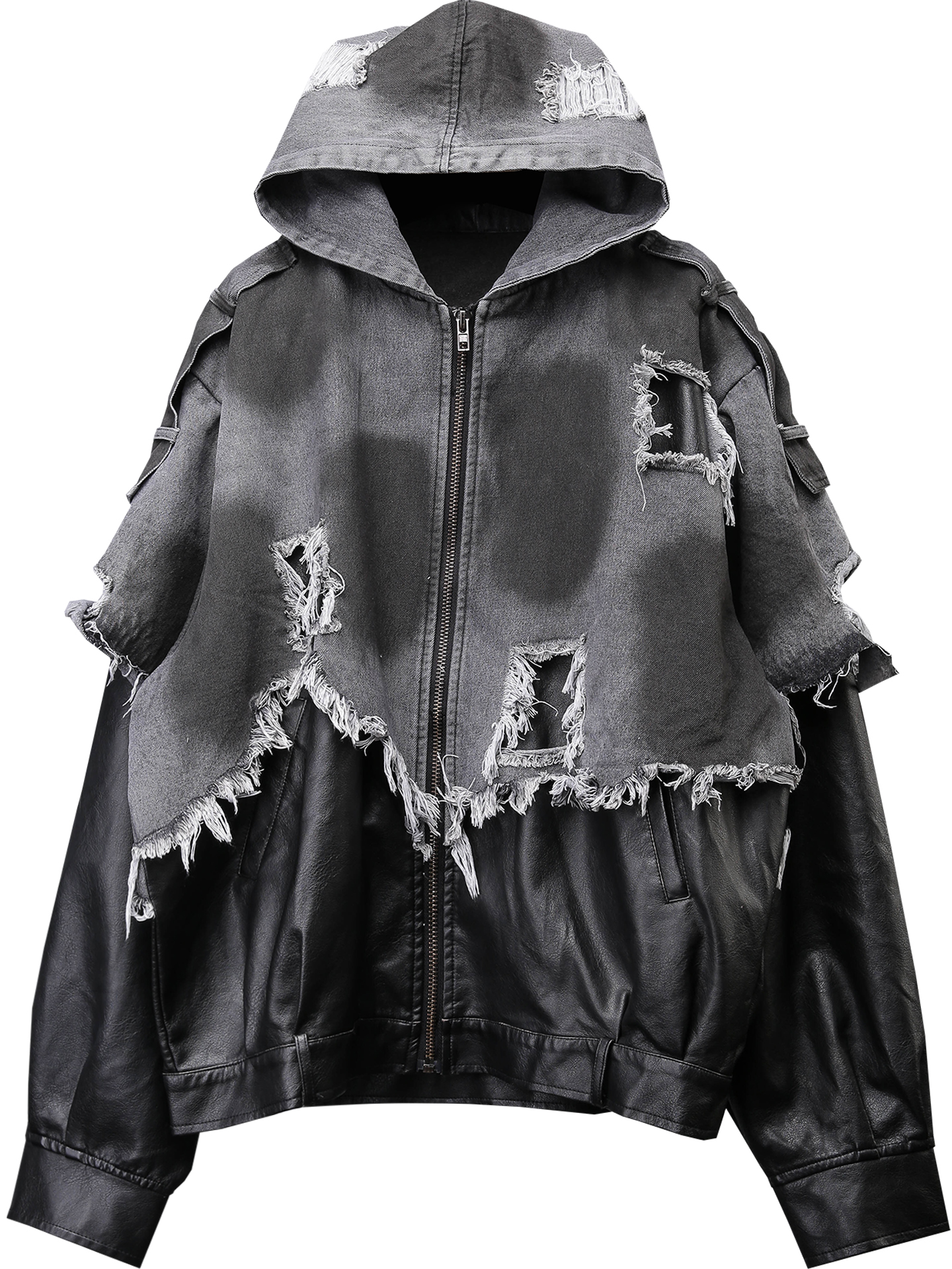 Damage Raw Edge Mix Patch PU Leather Denim Jacket WN22316