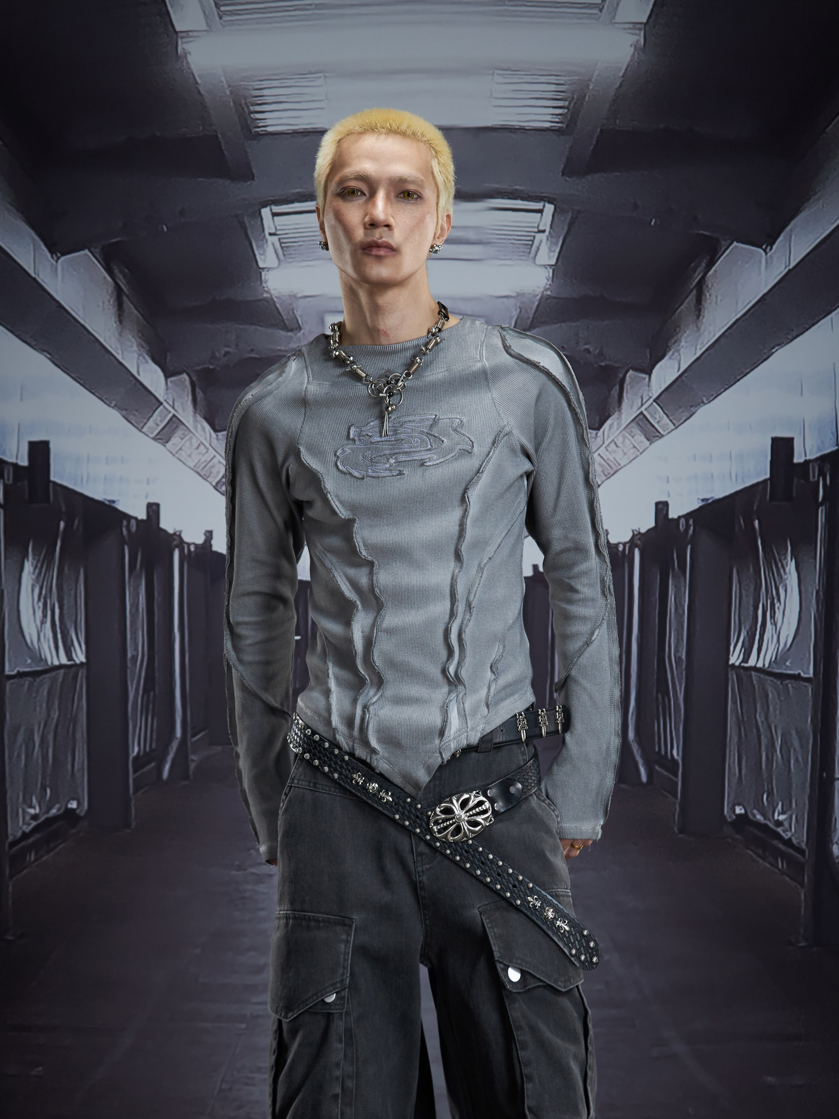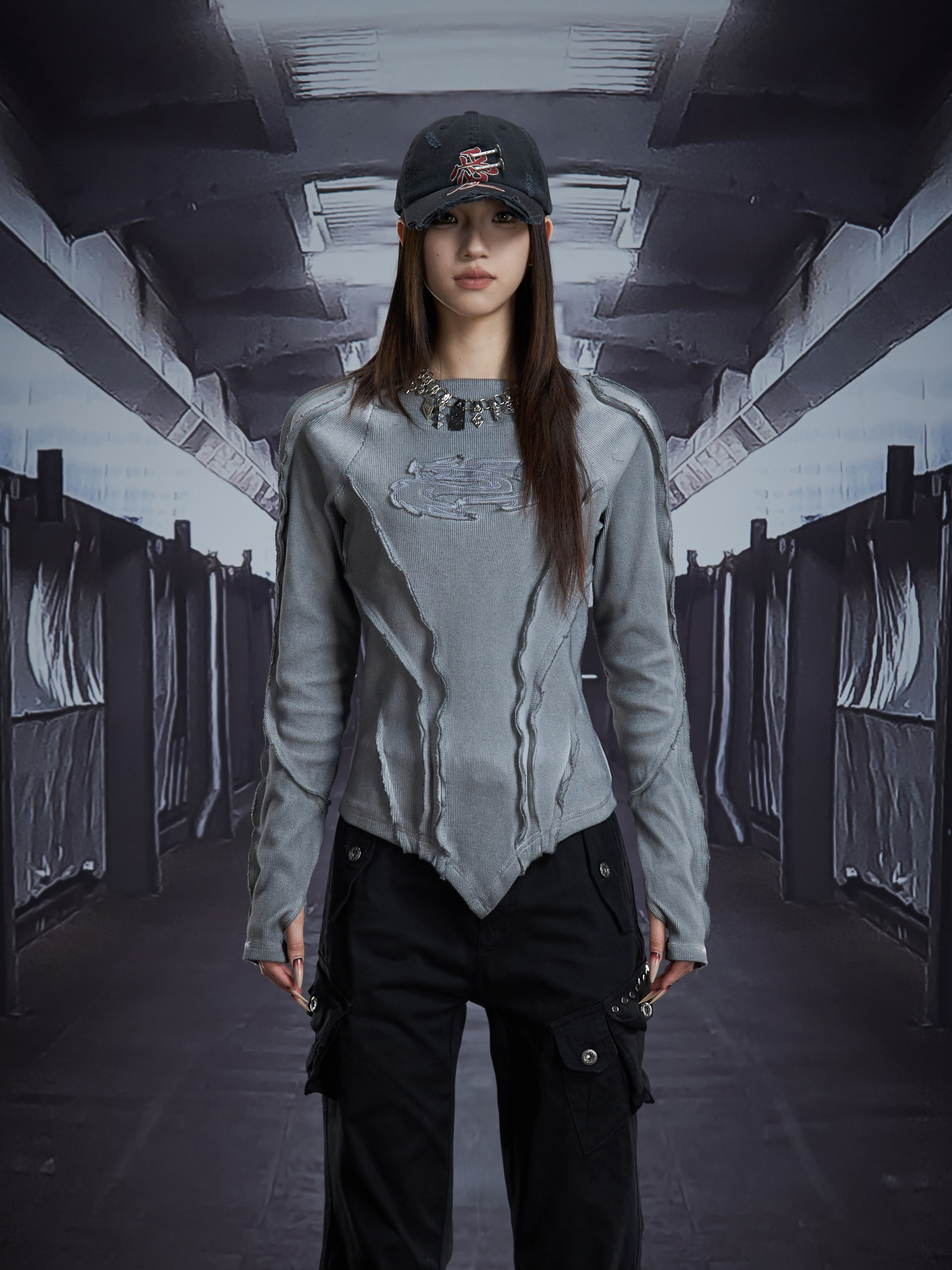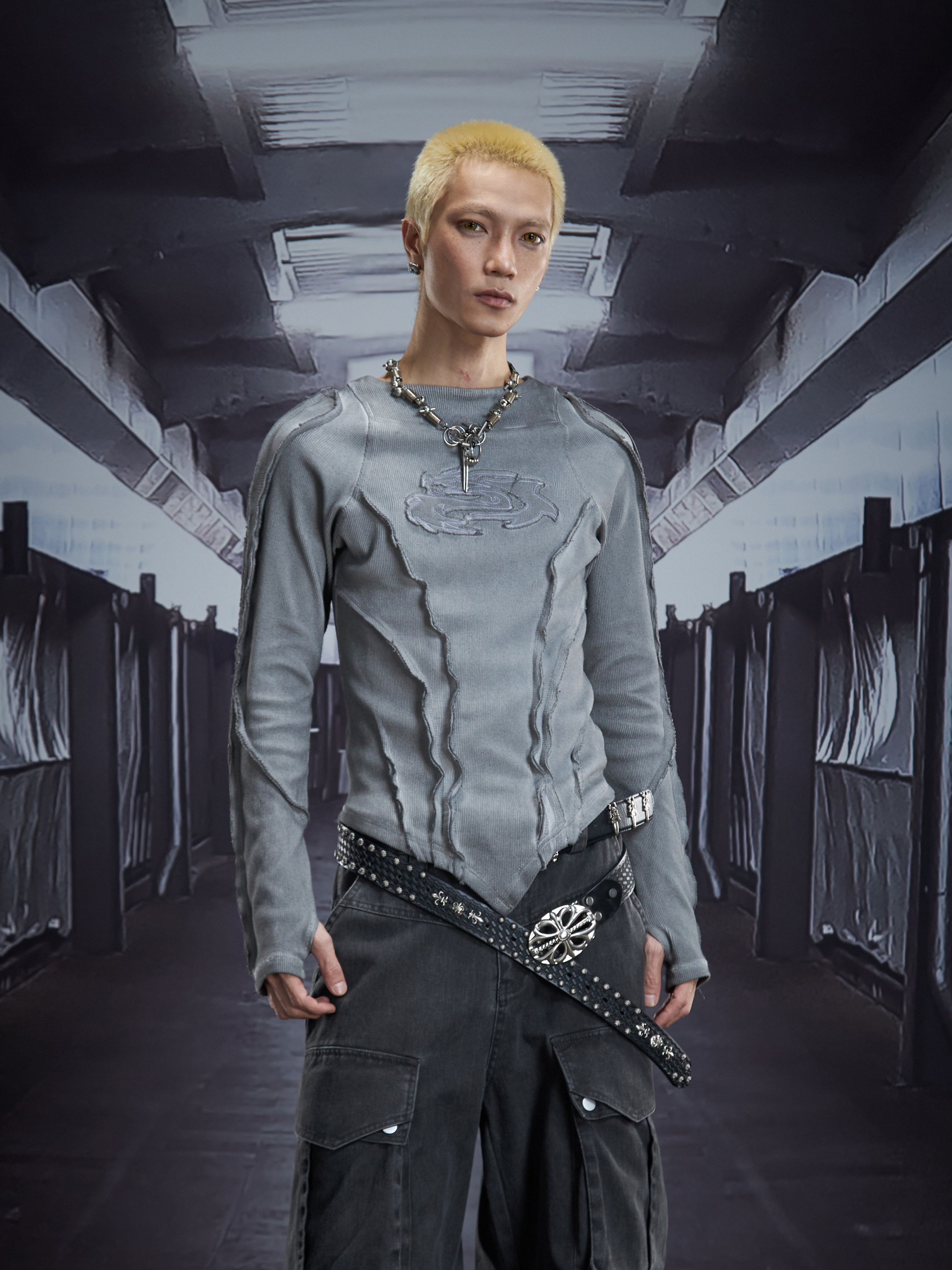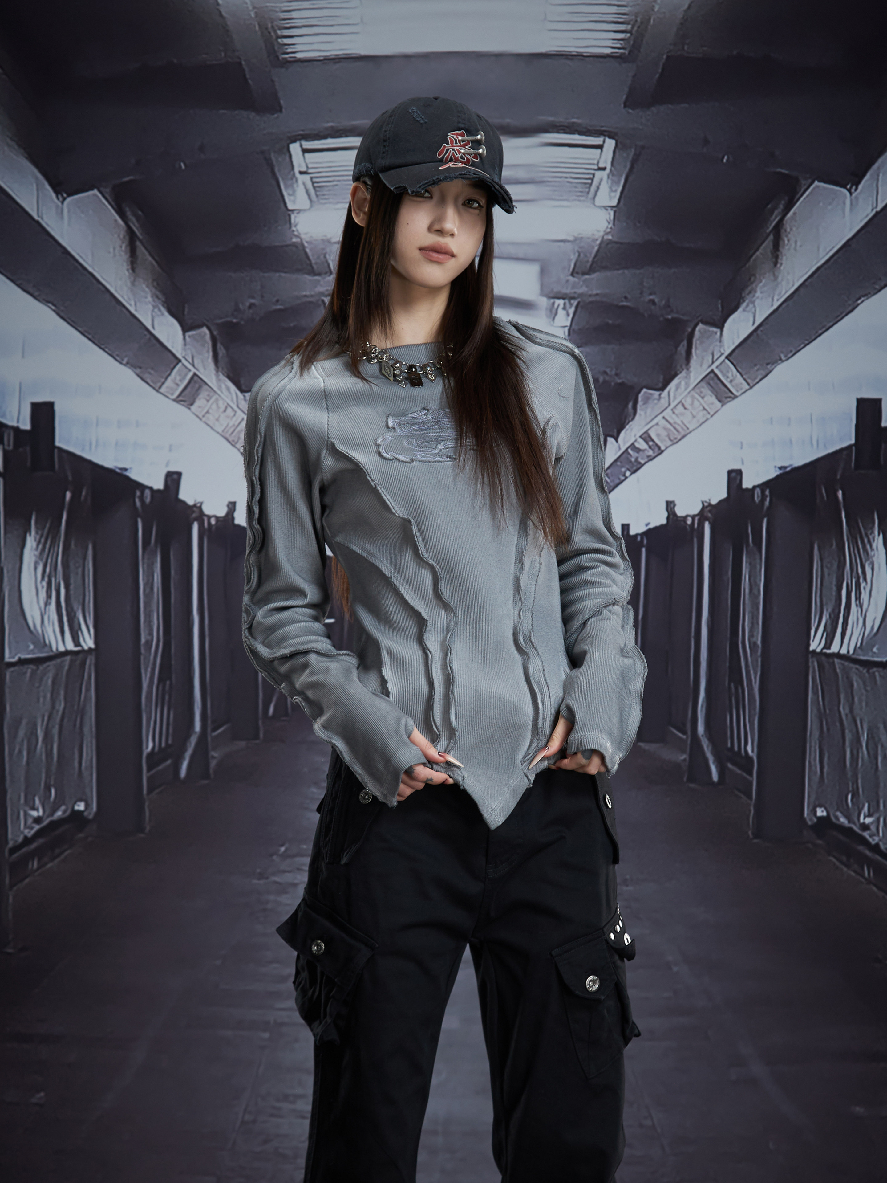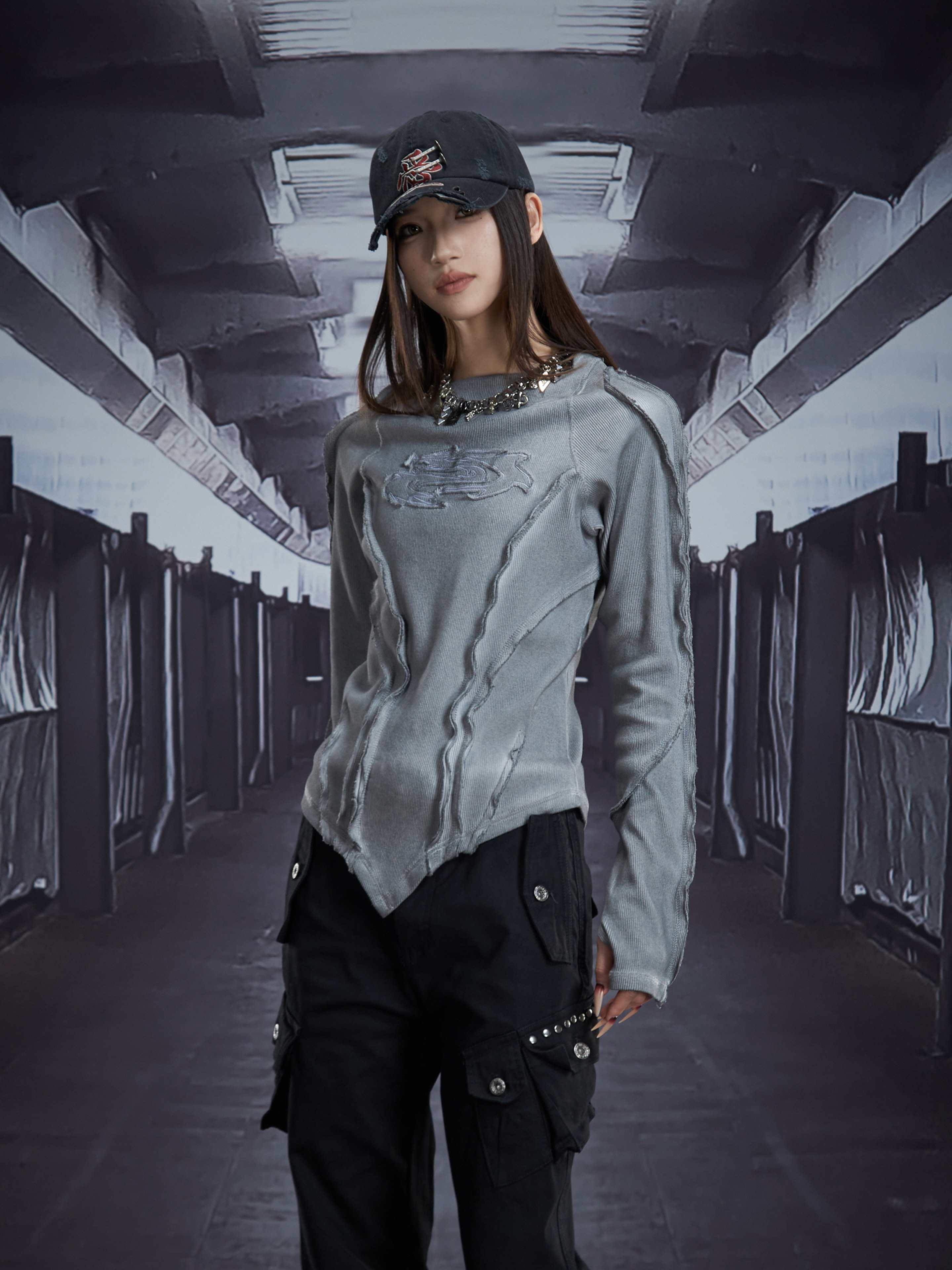 Deconstruct V-Hem Wash Damage High Elastic Long Sleeve T-Shirt WN22876