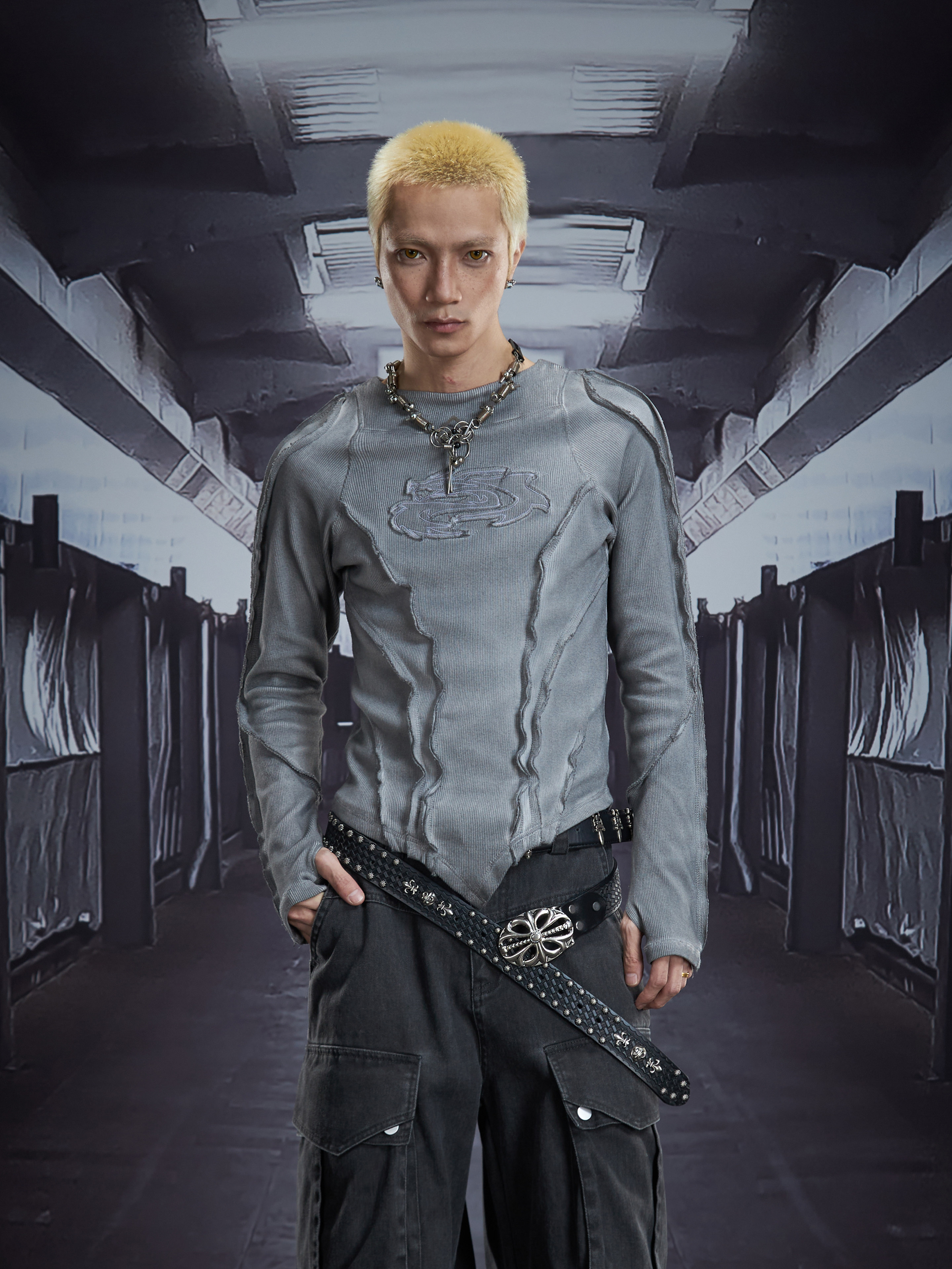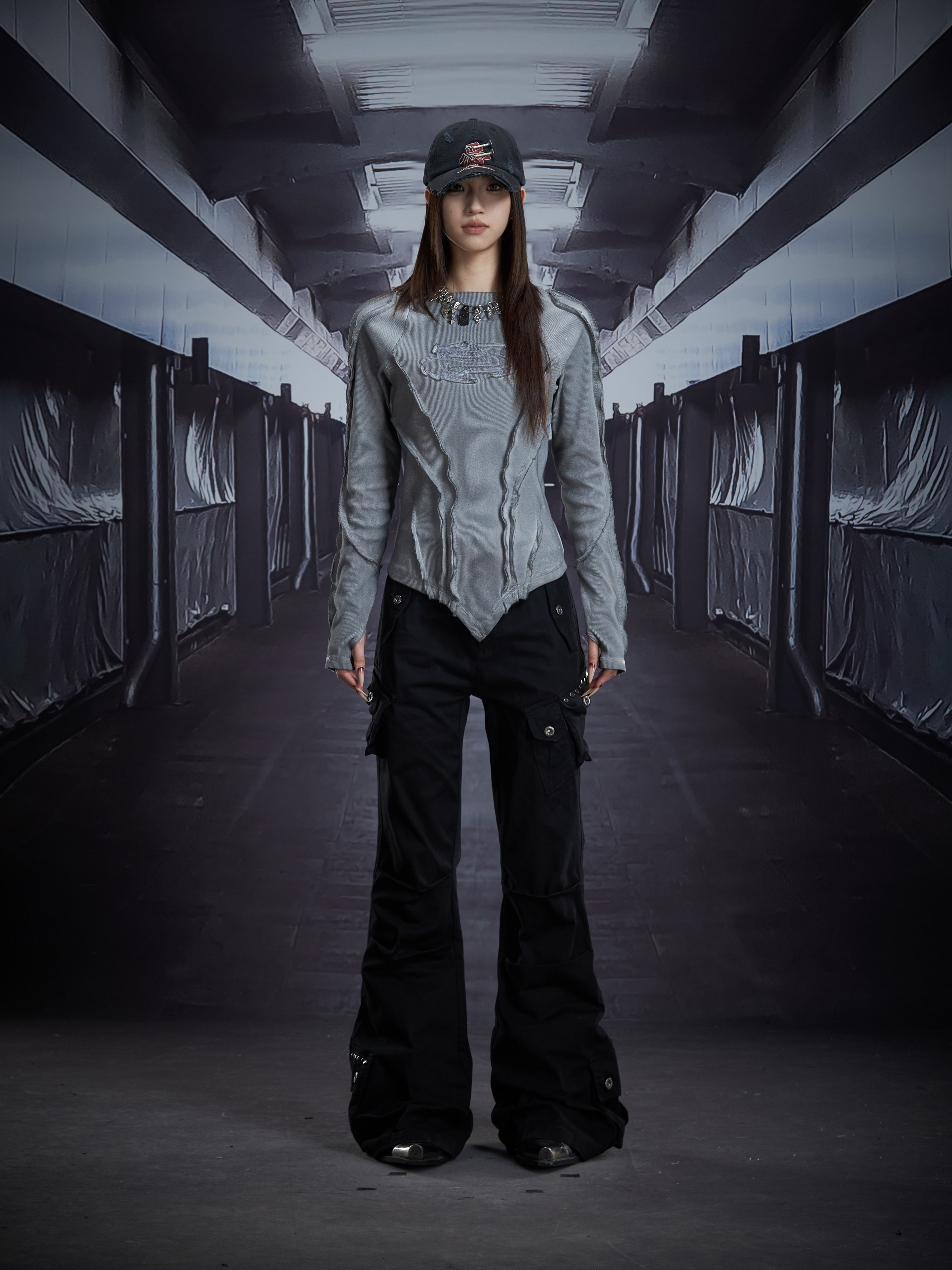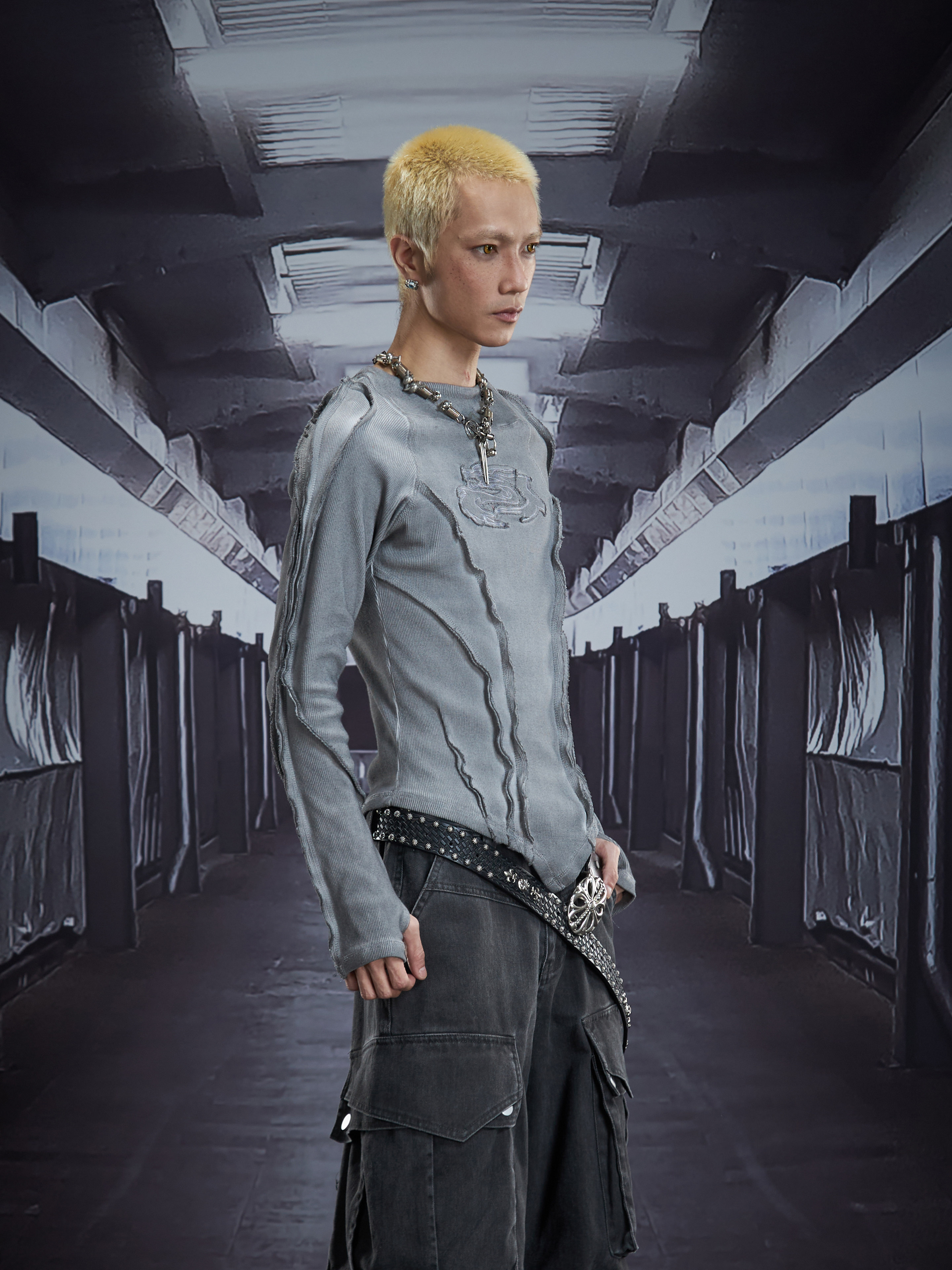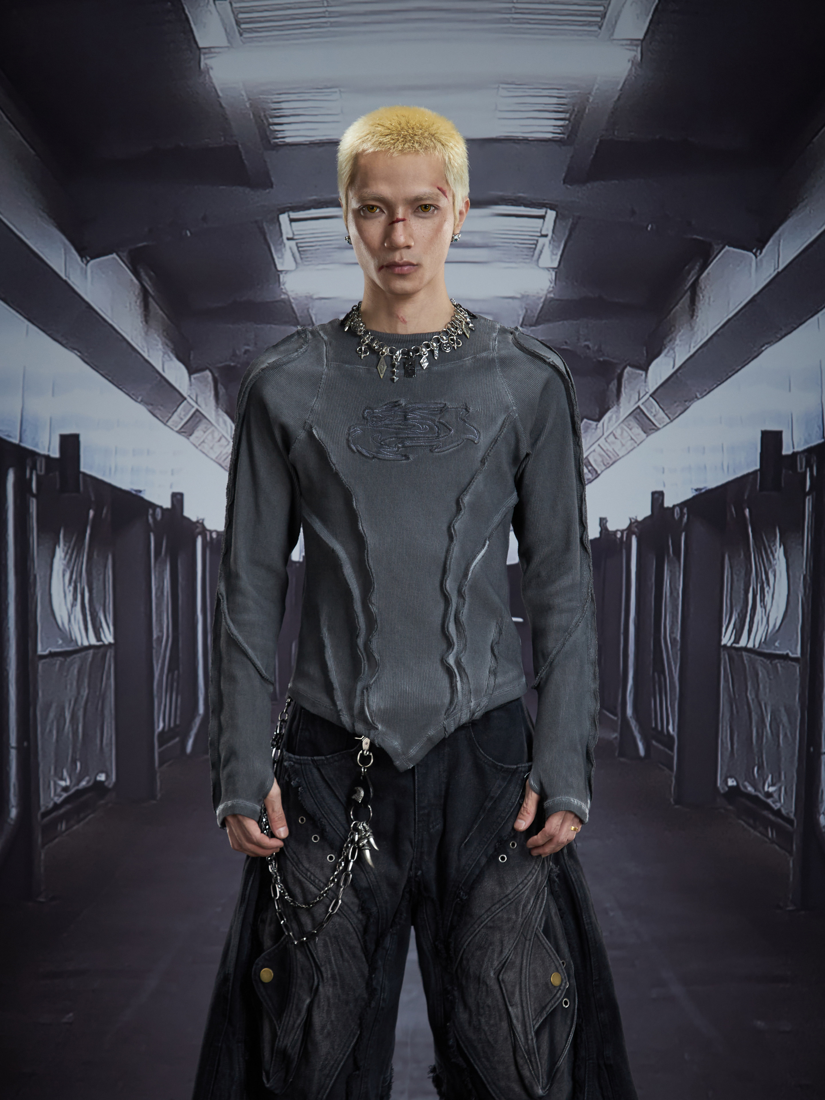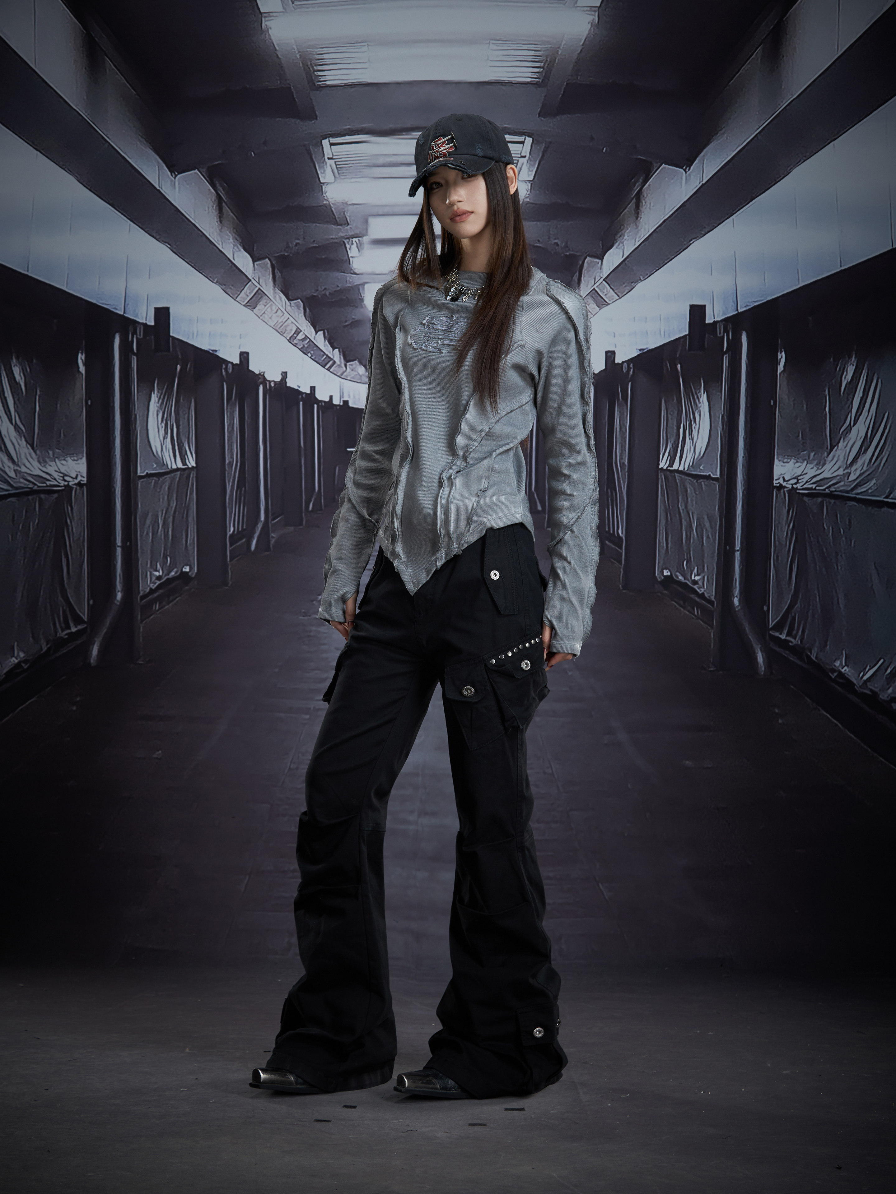Deconstruct V-Hem Wash Damage High Elastic Long Sleeve T-Shirt WN22876