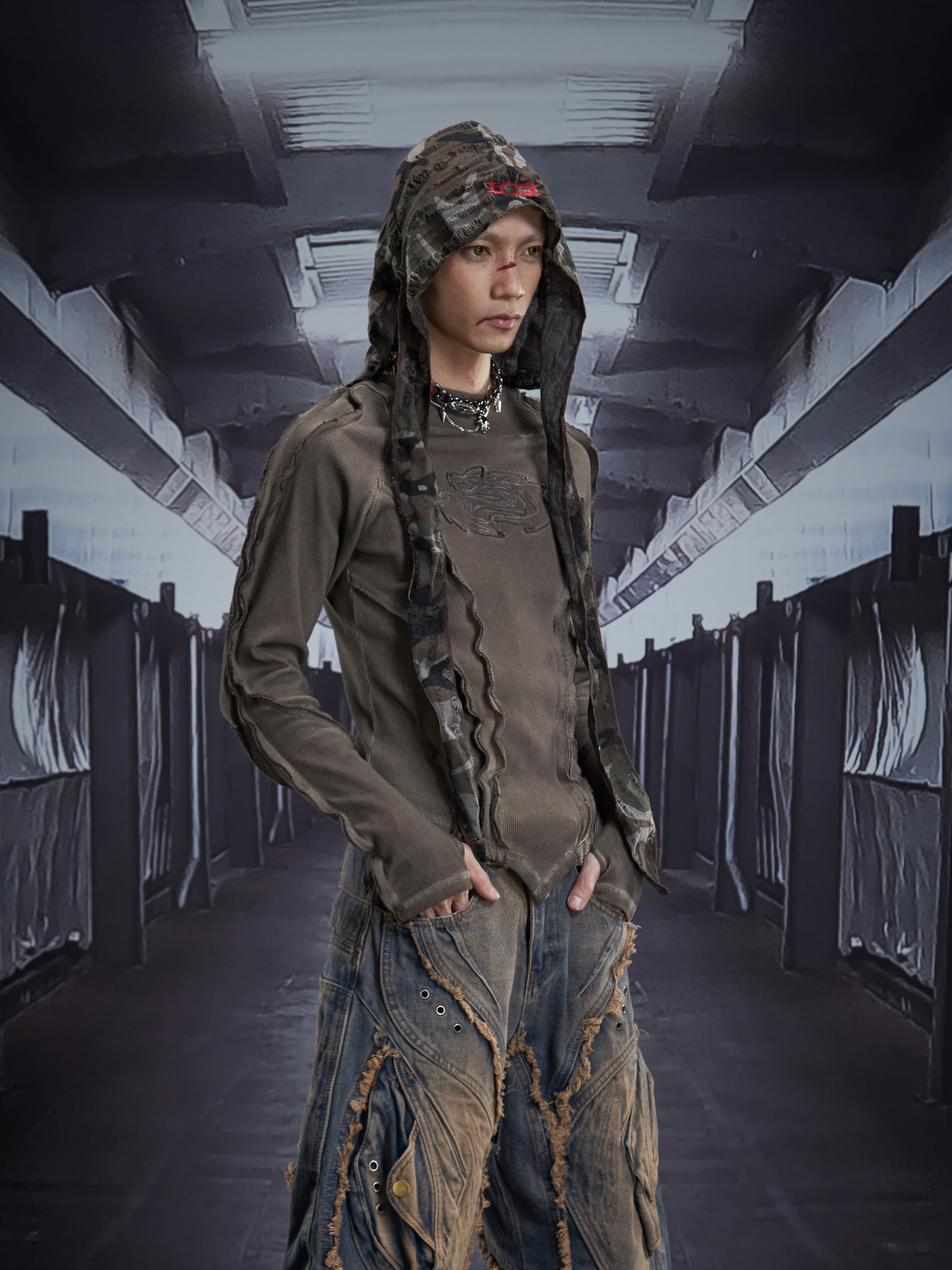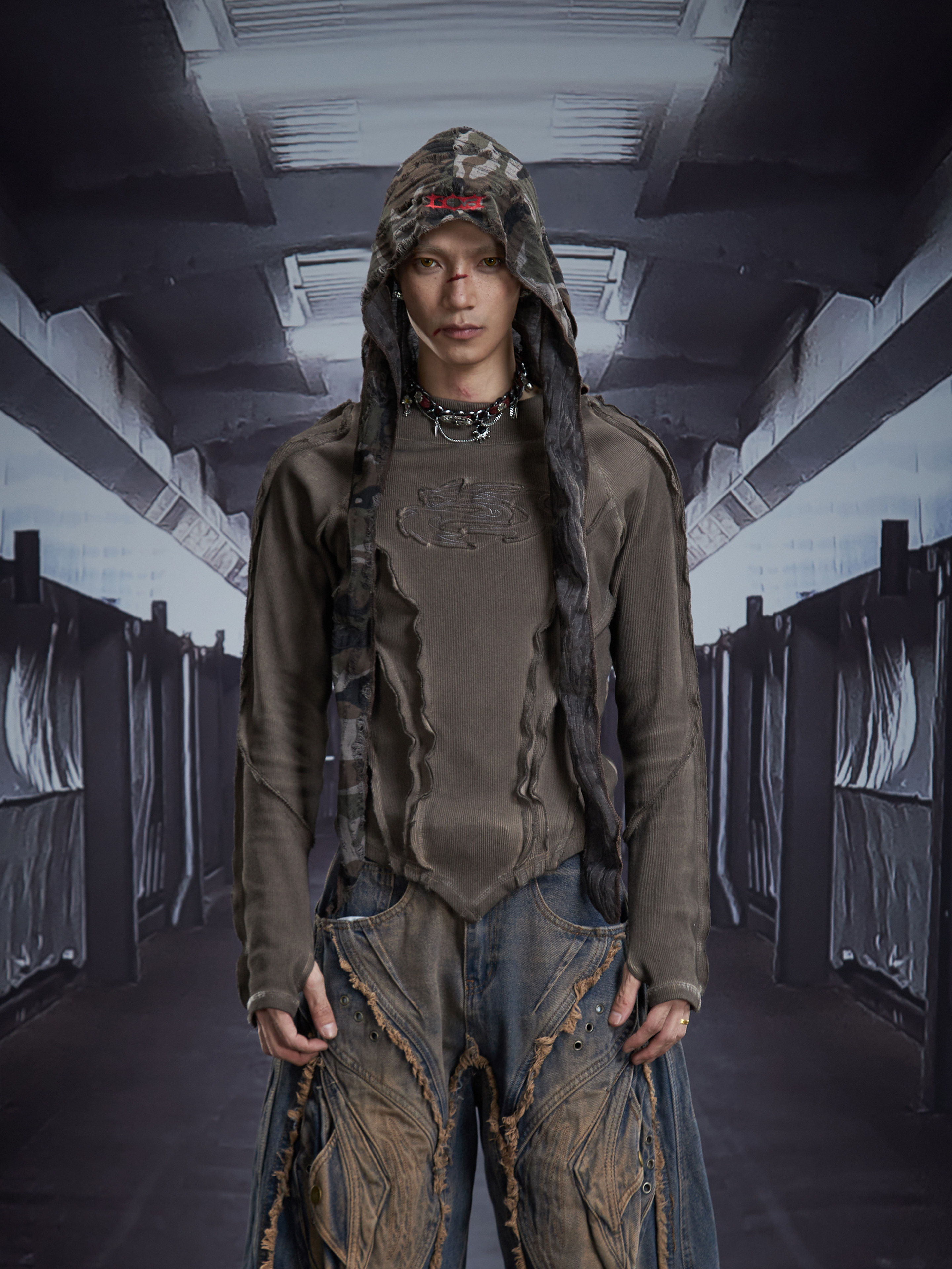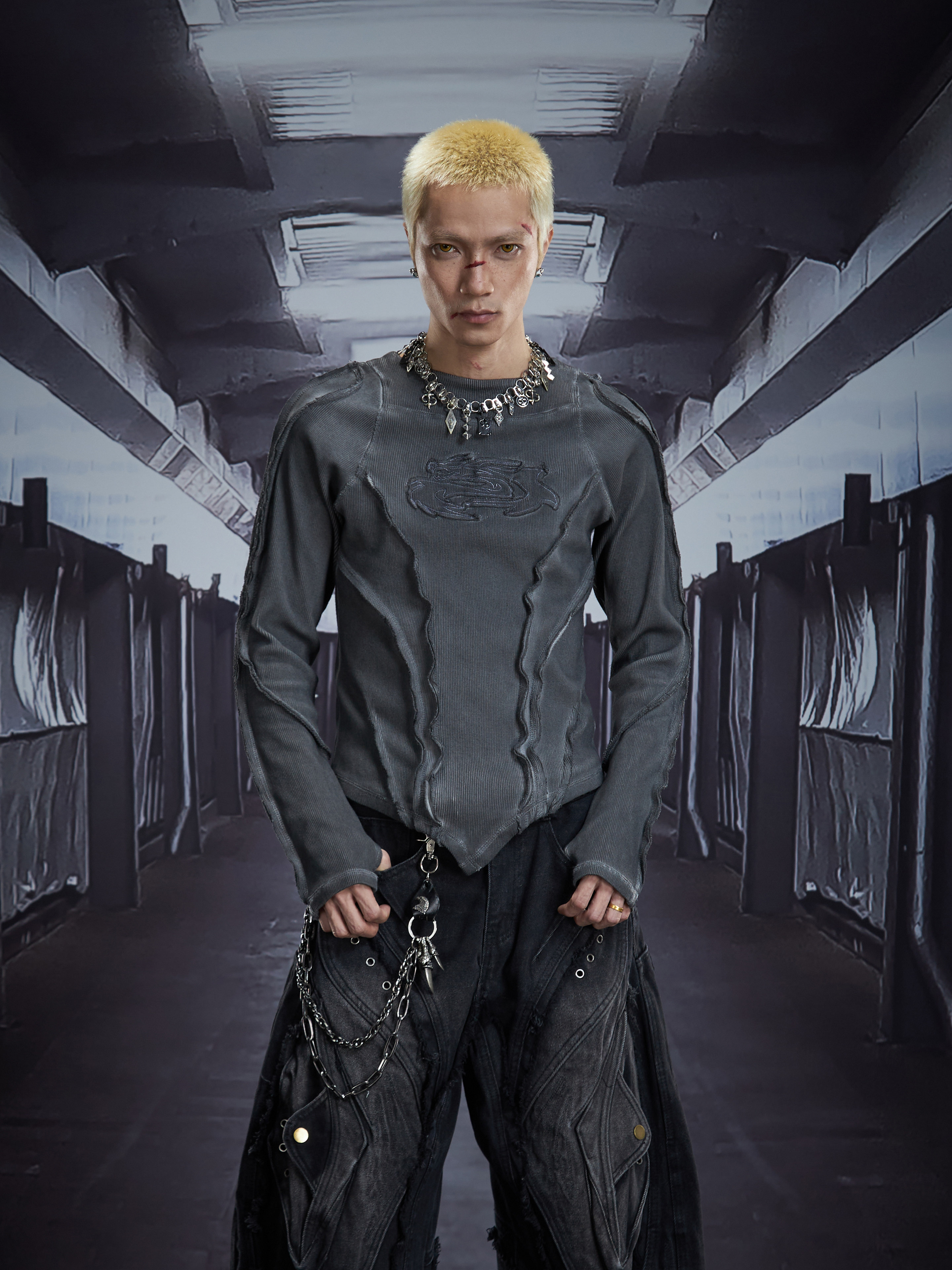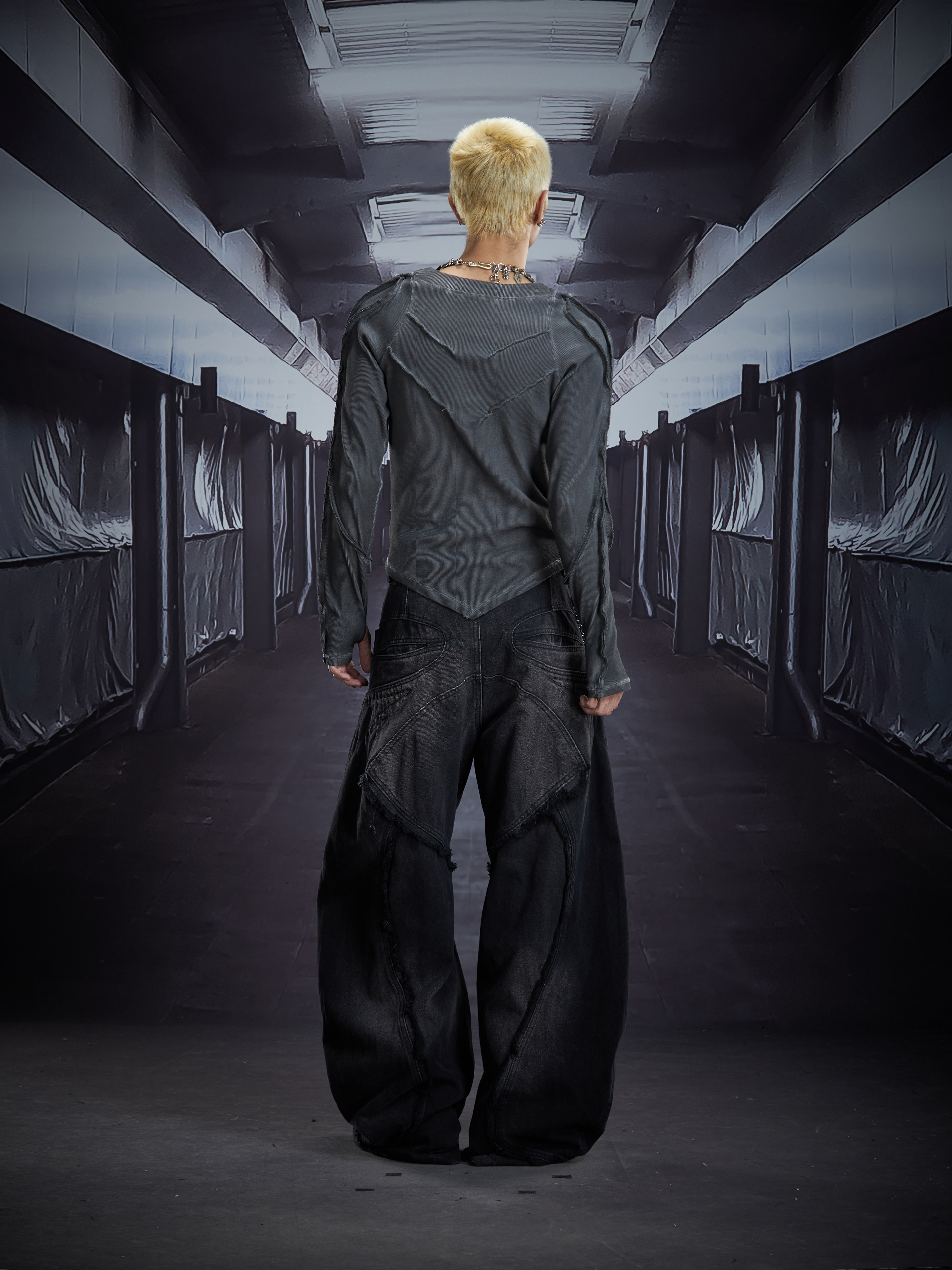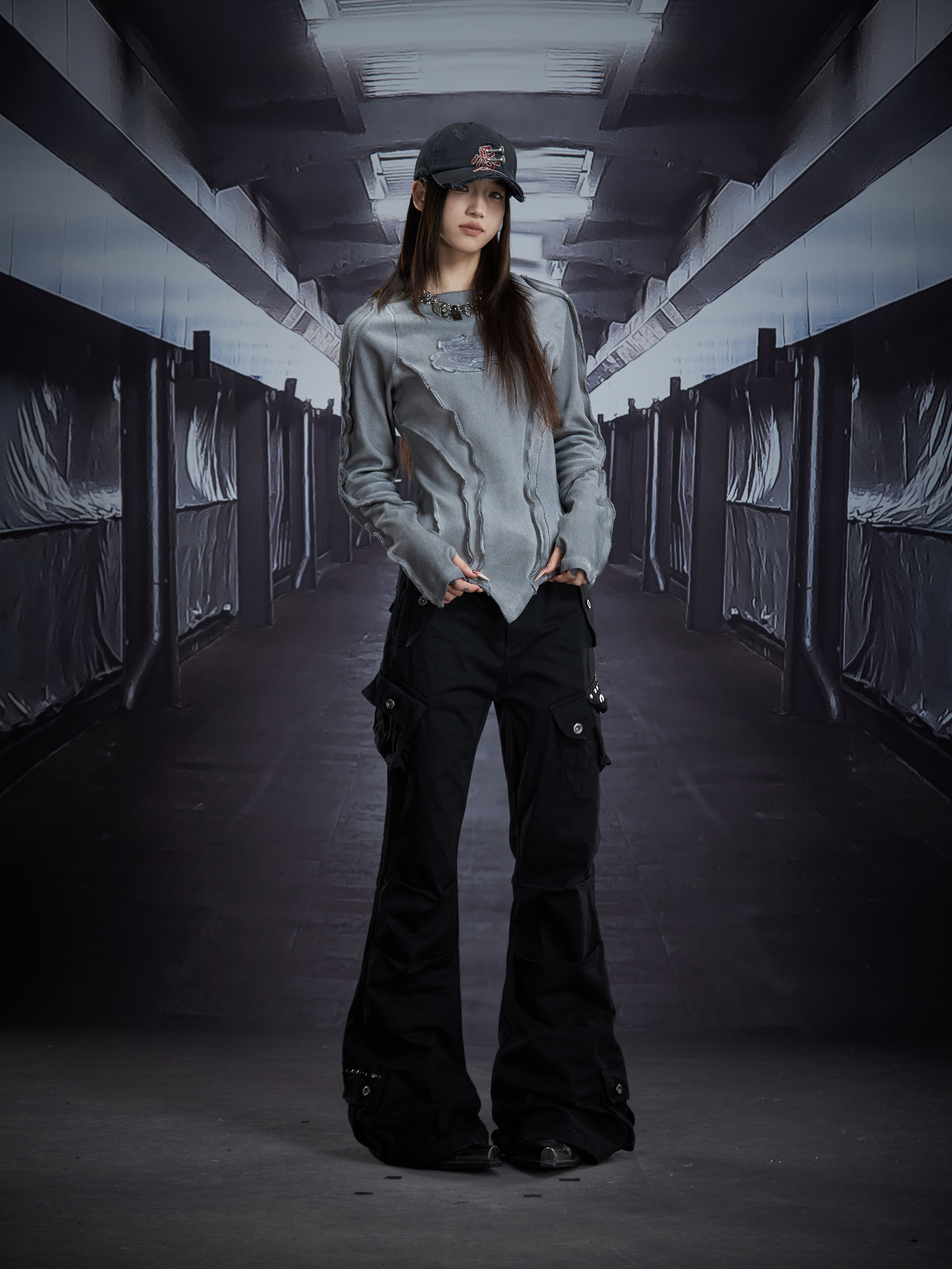 Deconstruct V-Hem Wash Damage High Elastic Long Sleeve T-Shirt WN22876