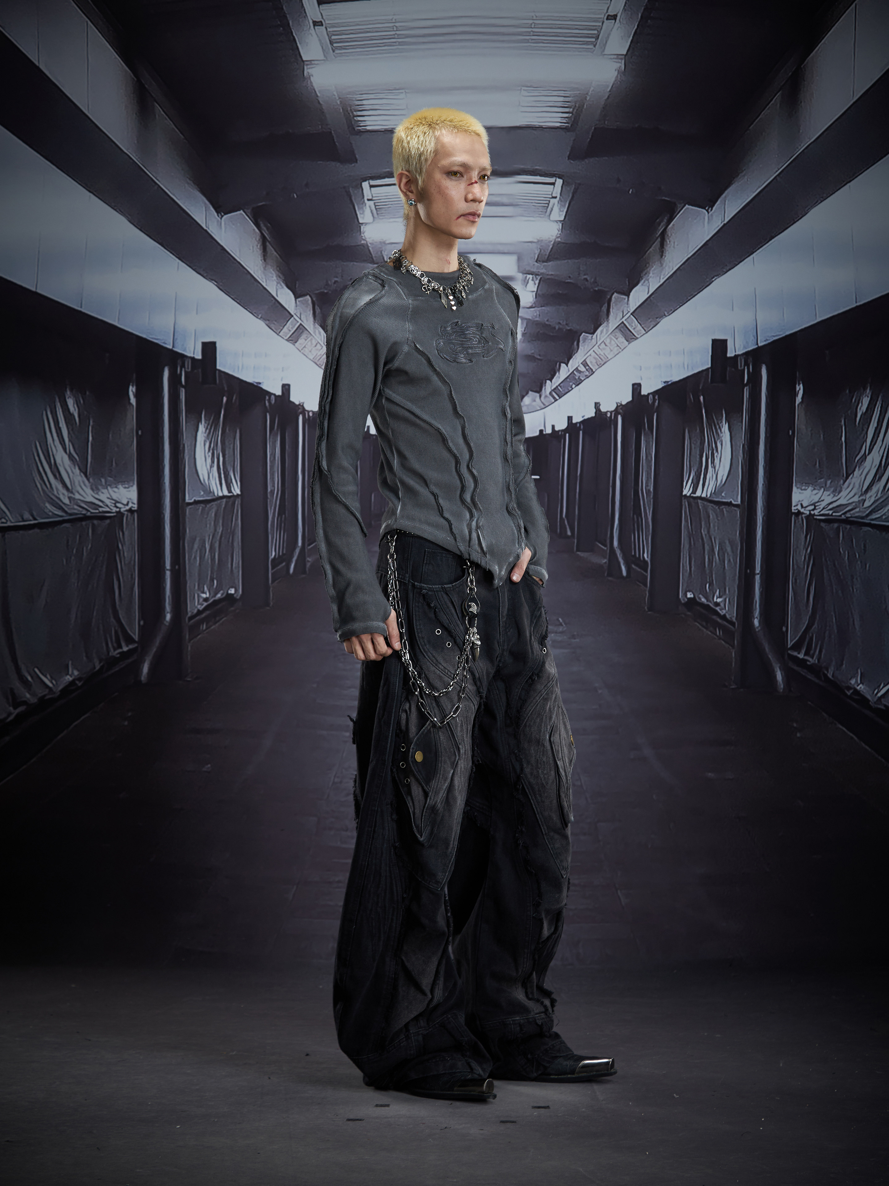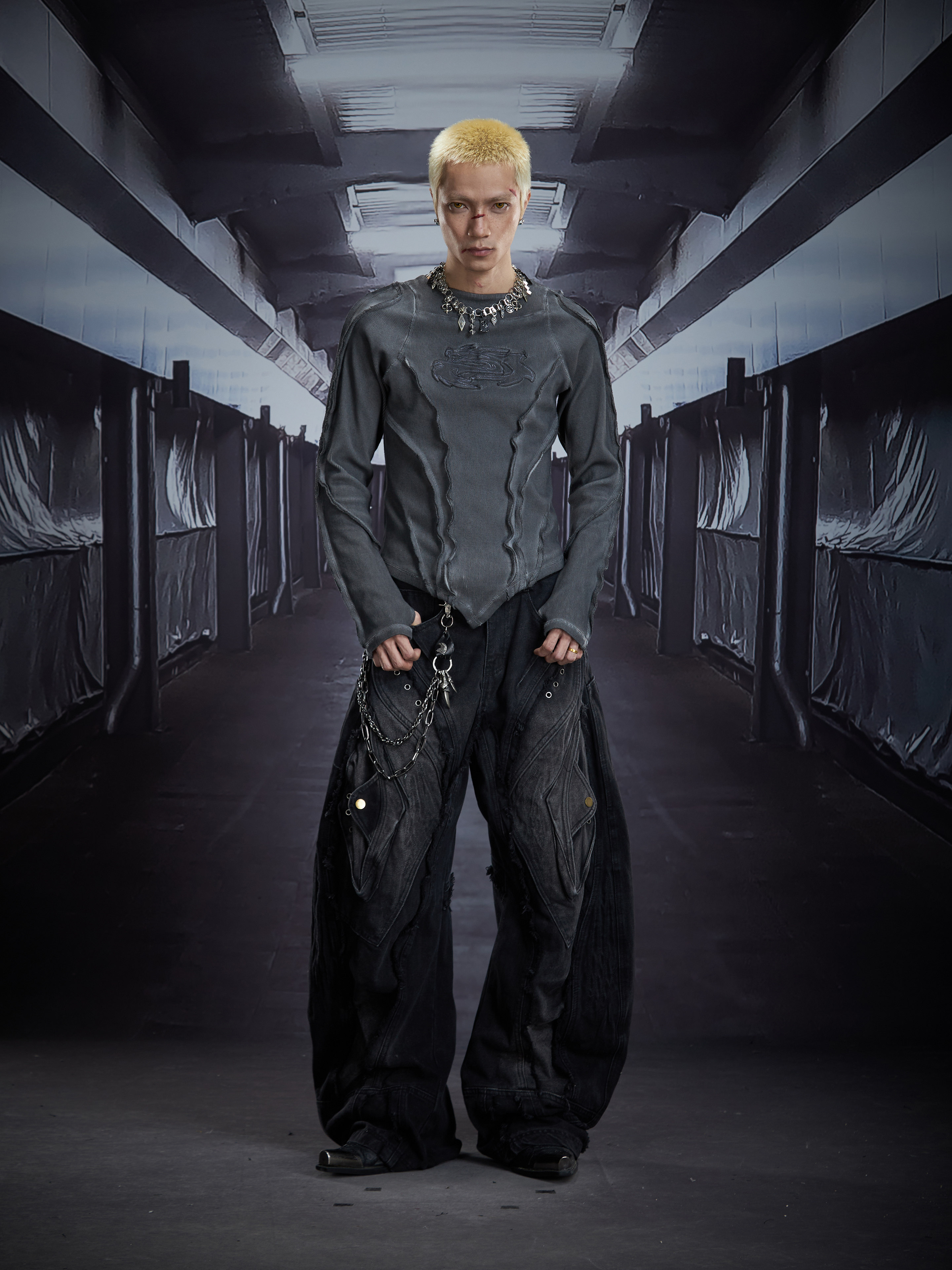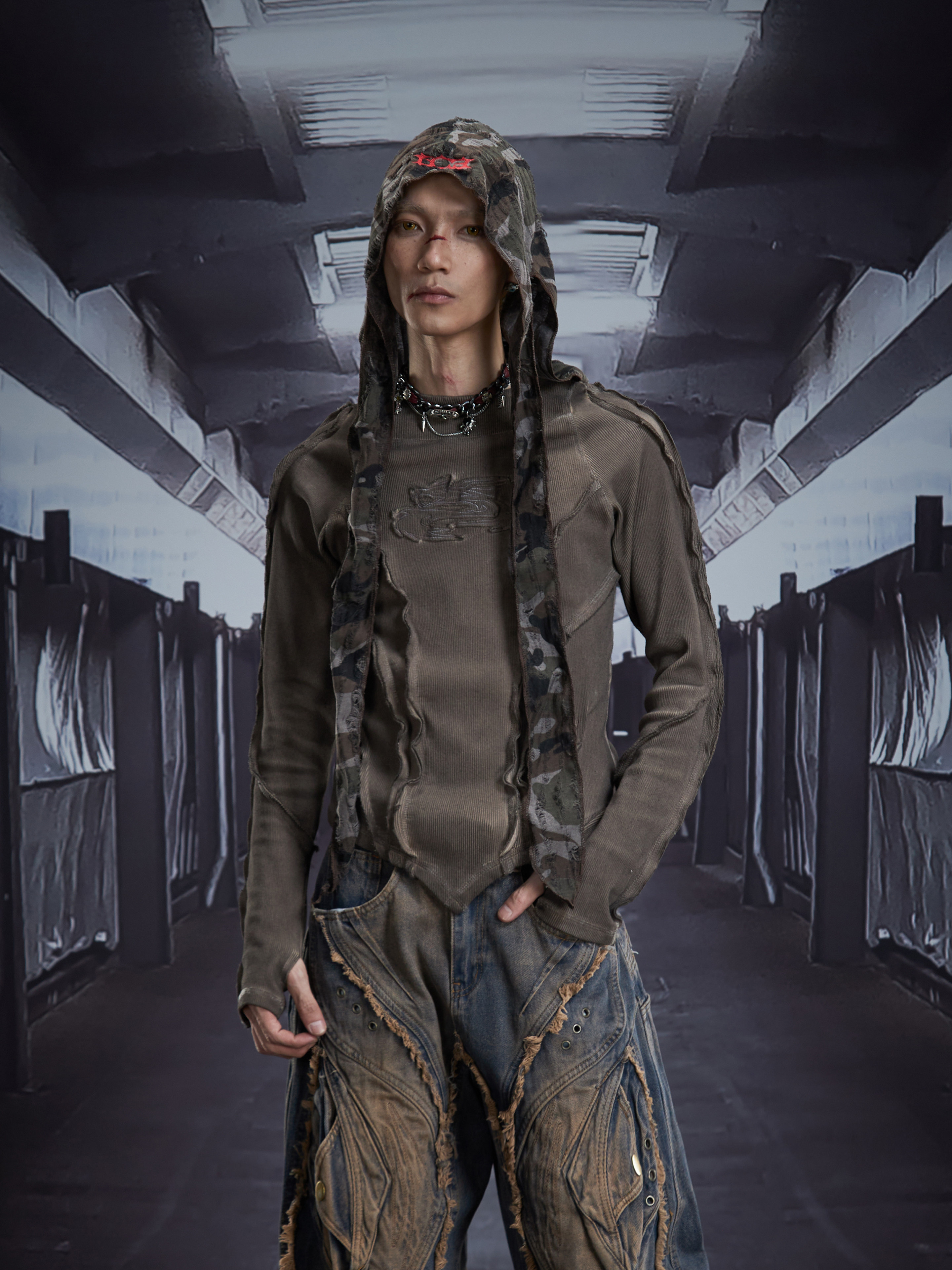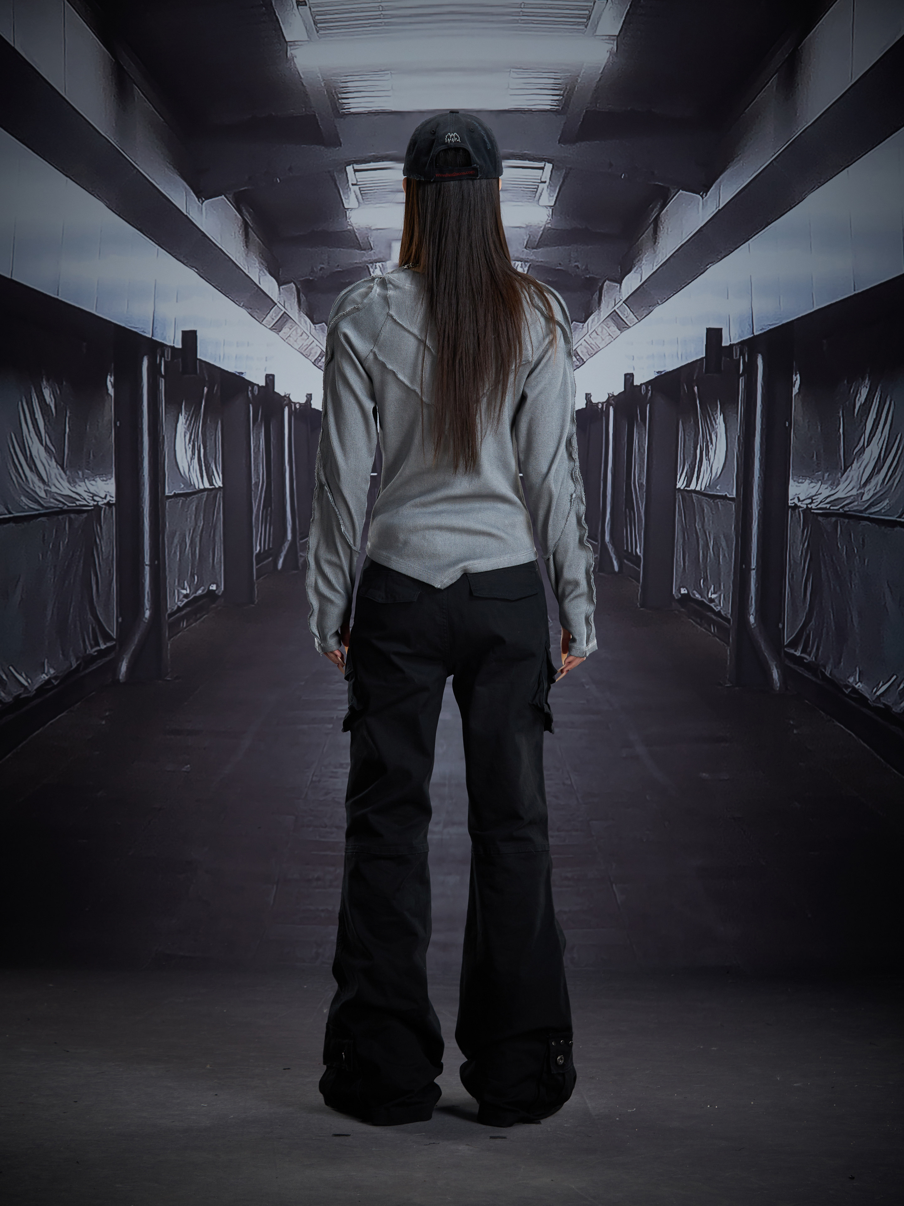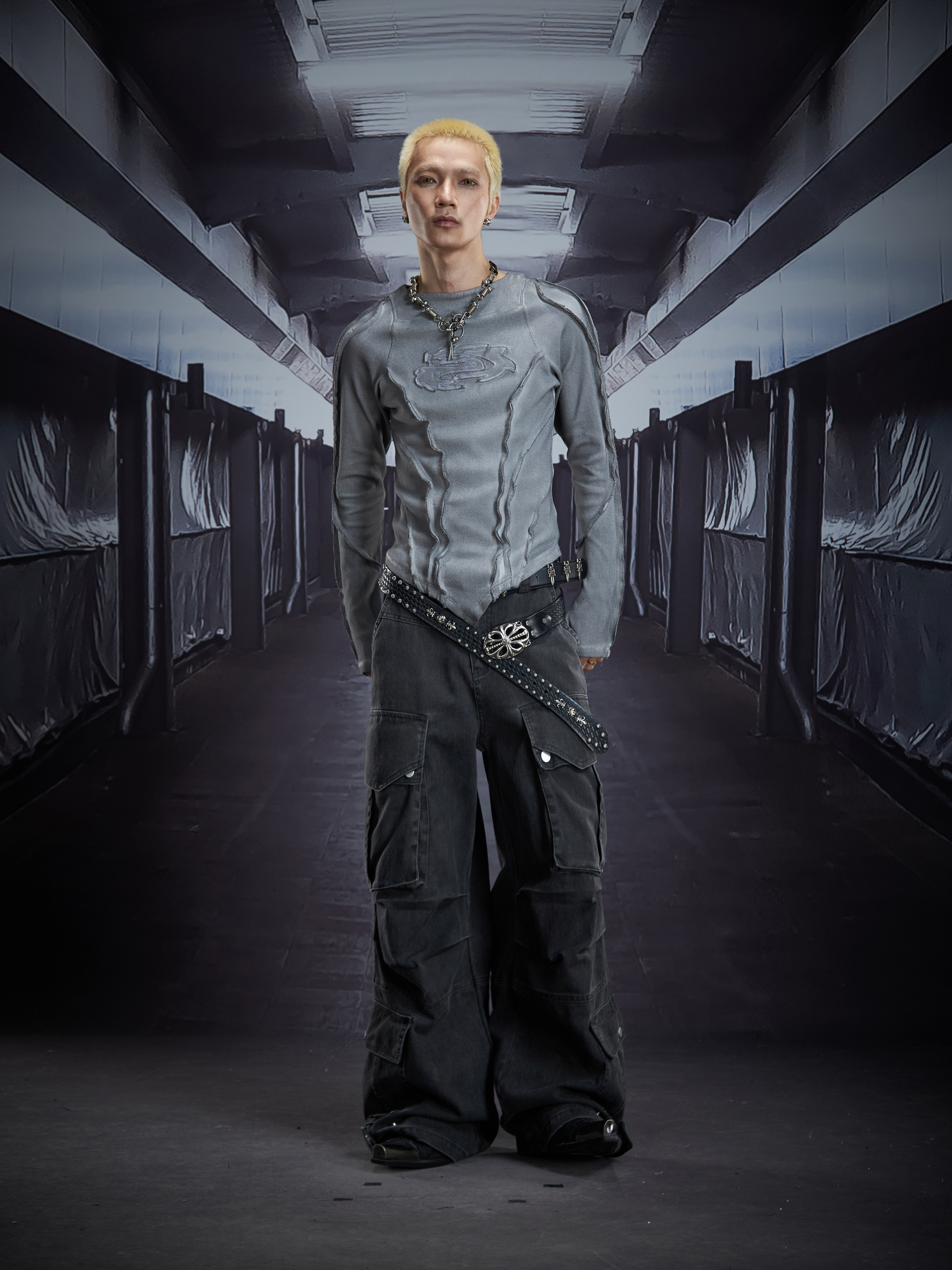 Deconstruct V-Hem Wash Damage High Elastic Long Sleeve T-Shirt WN22876