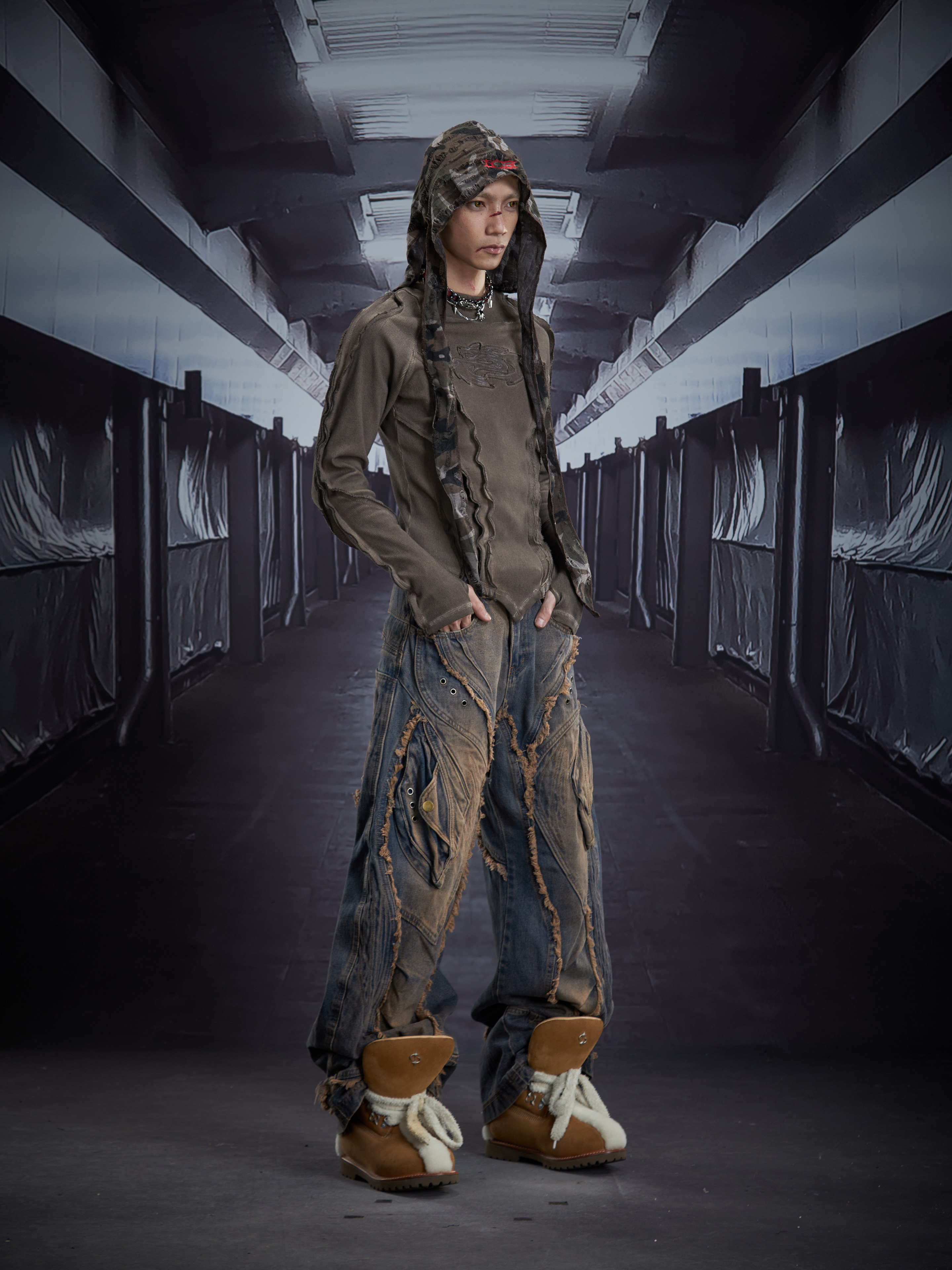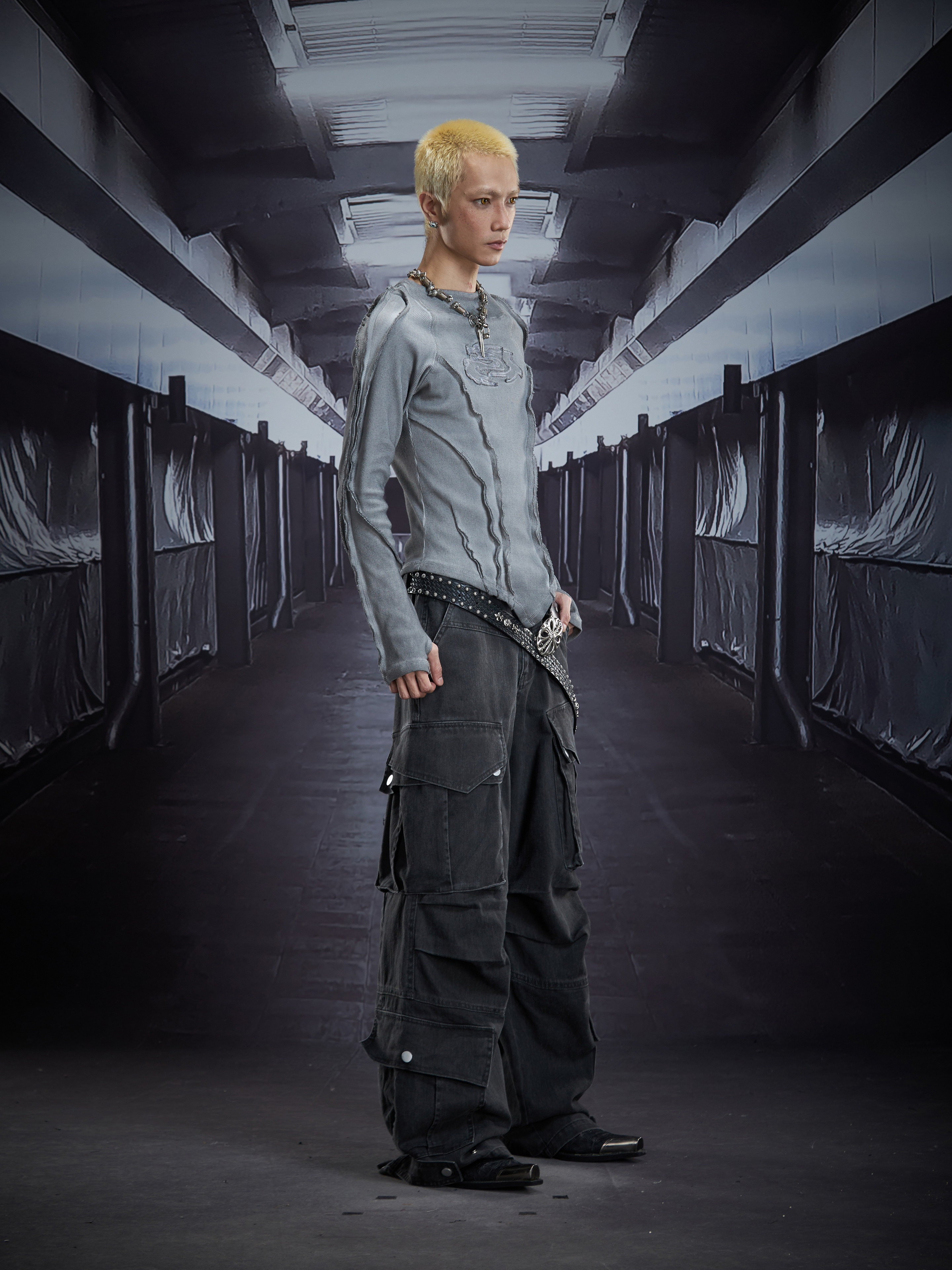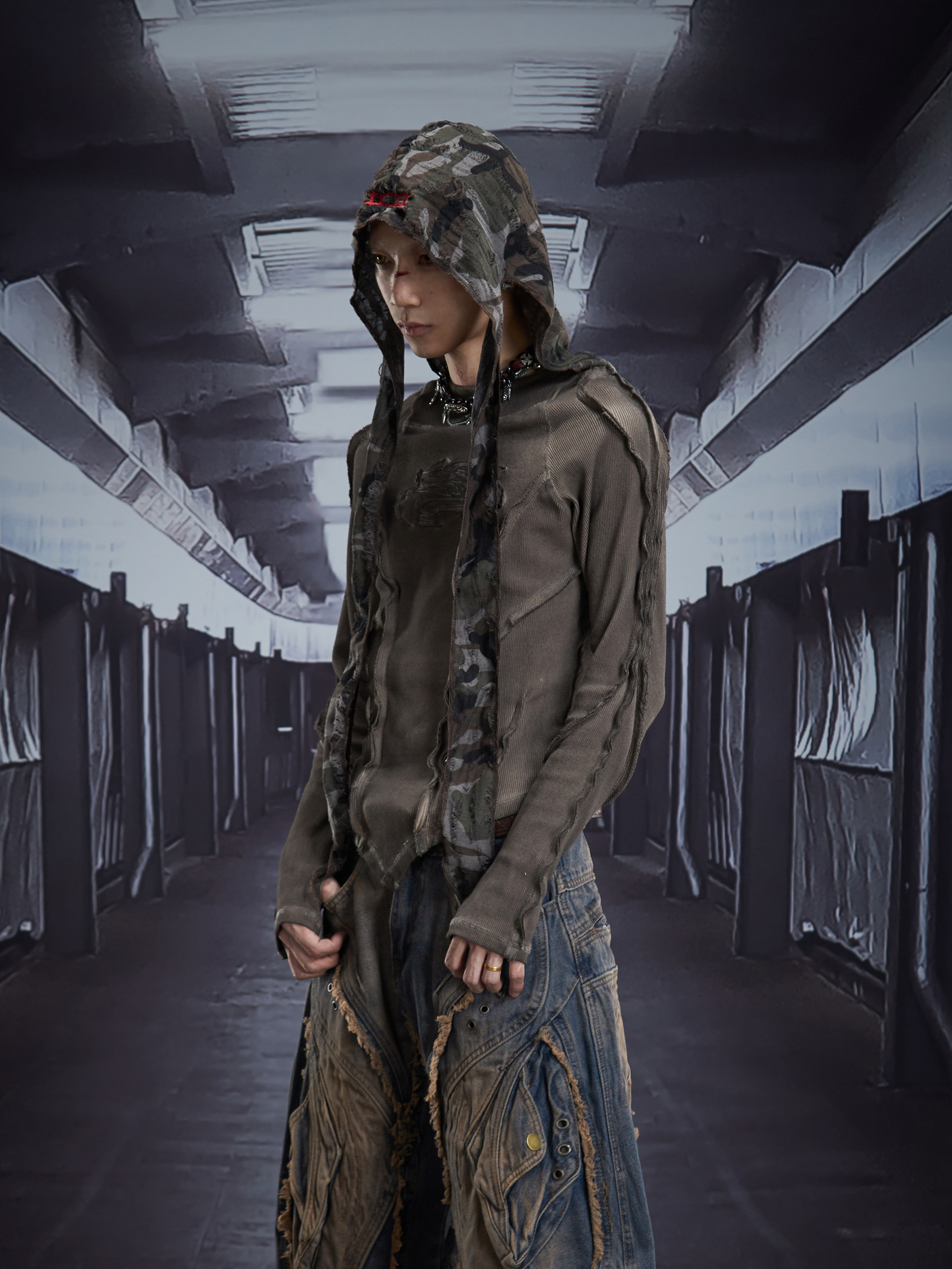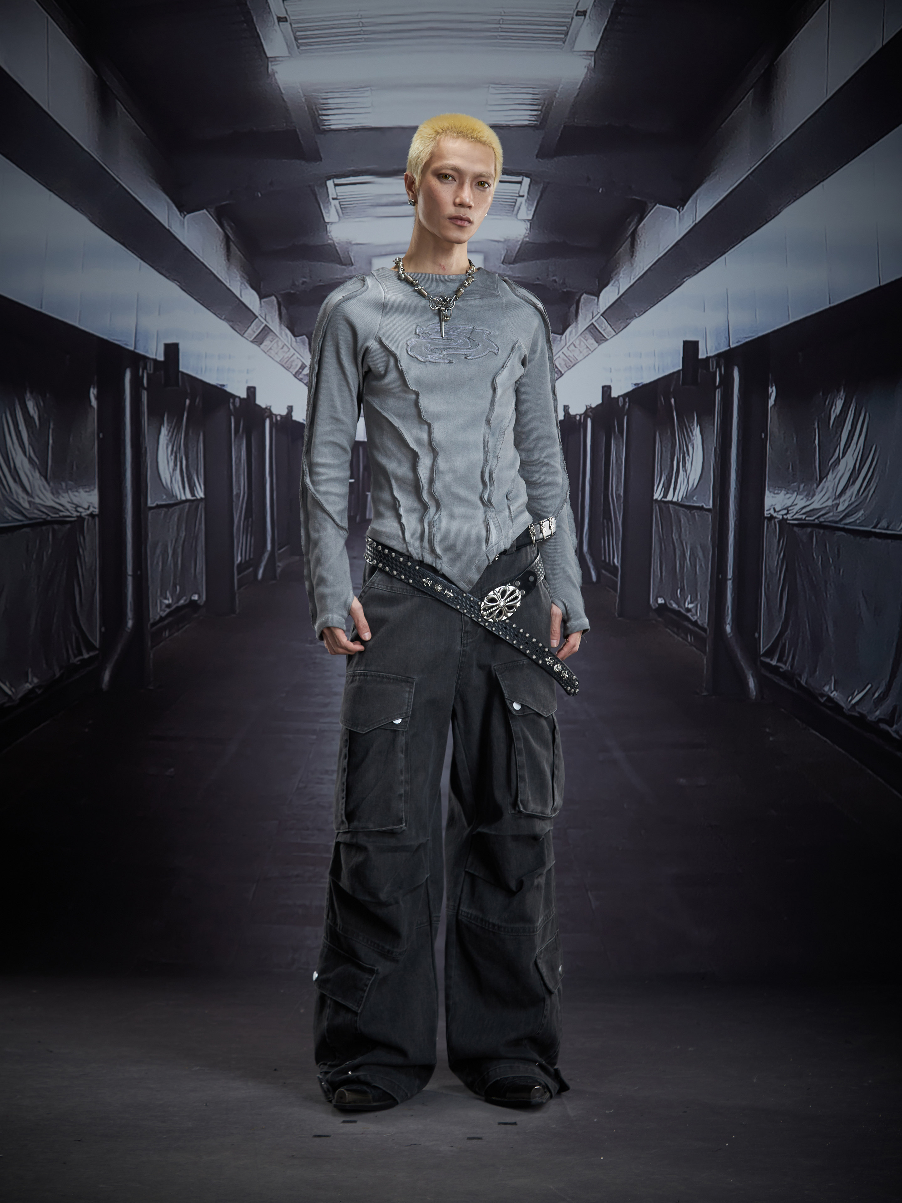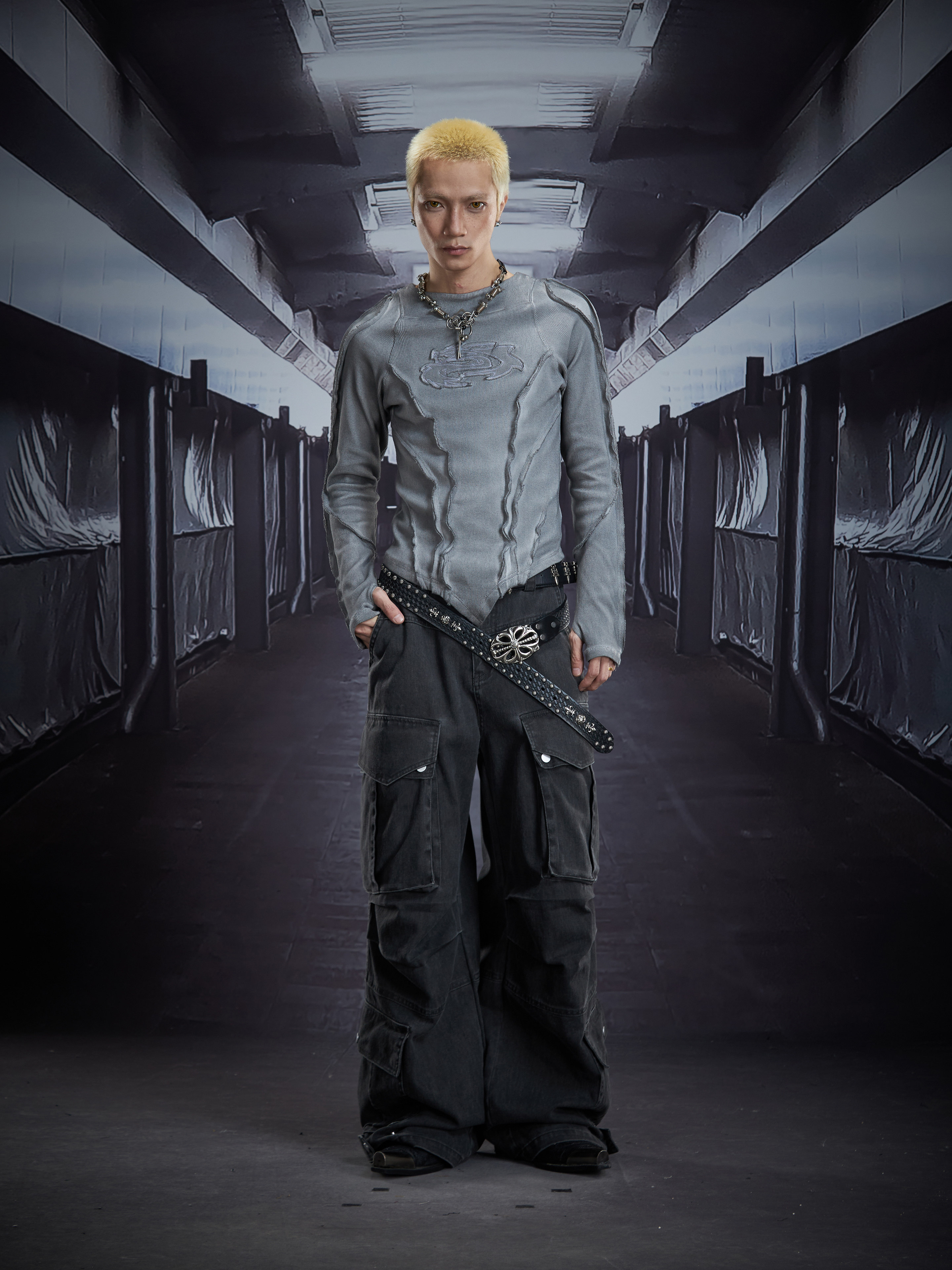 Deconstruct V-Hem Wash Damage High Elastic Long Sleeve T-Shirt WN22876
