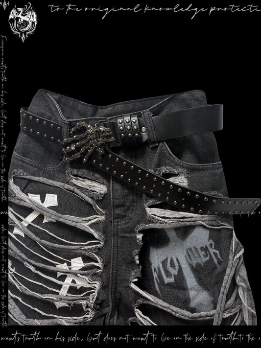 Washed Damage Design Five Pocket Half Denim Jeans & Belt & Waist Chain WN20092