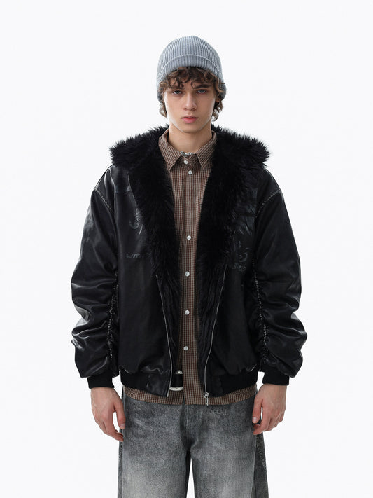 Washed Zipper Fake Fur Patchwork PU Leather Short Jacket WN21825