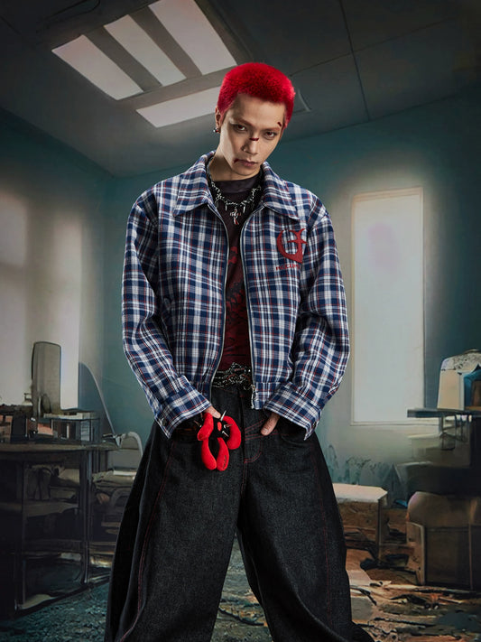 Embroidery Plaid Collar Short Zipper Jacket WN20598