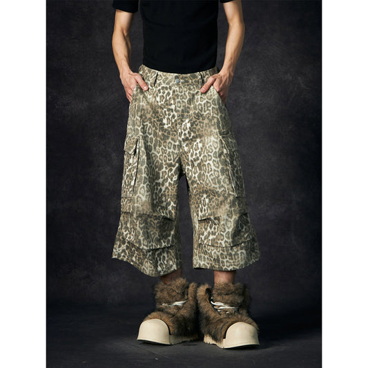 Leopard Print Pleated Large Pocket Wide Leg Cargo Half Pants WN18461