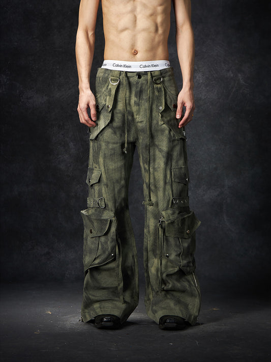 Stain Washed Multi-pocket Wide-leg Cargo Pants WN15259