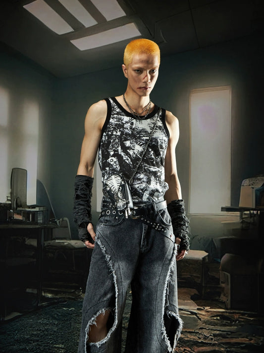 Embroidery Design Washed Dyed Sleeveless T-Shirt WN18436