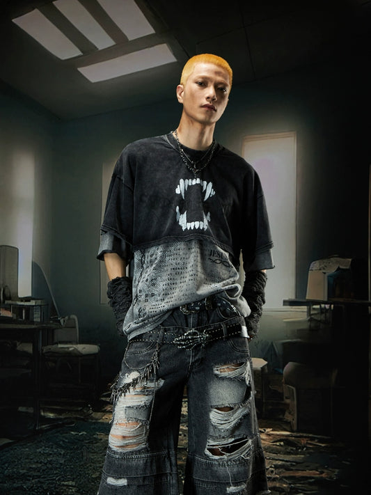 Double Layer Washed Letter Print Oversize Short Sleeve T-Shirt WN18457