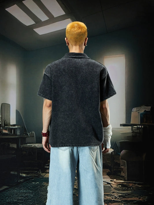 Washed Spray Print Asymmetric Collar Short Sleeve Polo Shirt WN18454