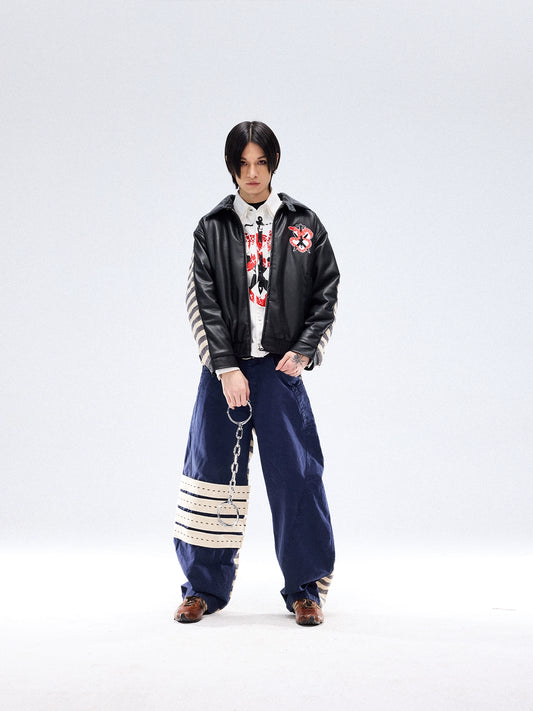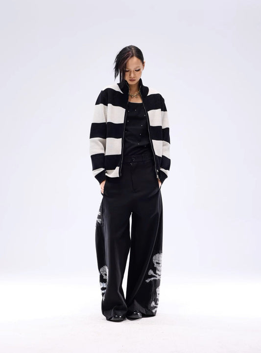 Curved Cut Skull Print Patch Wide Leg Sweatpants WN13685