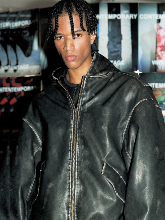Washed Hooded PU Leather Puffer Jacket WN13276