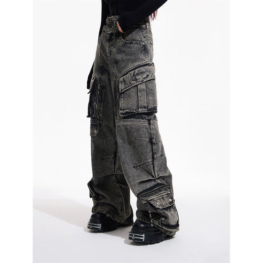 Washed Multi-Pocket Wide Leg Cargo Denim Jeans WN18200