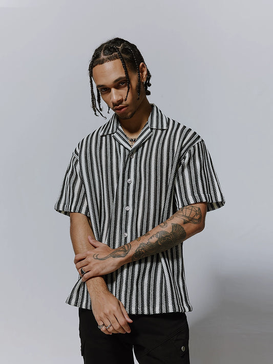 Stripe Woven Turn-Down Collar Oversize Short Sleeve Shirt WN17591
