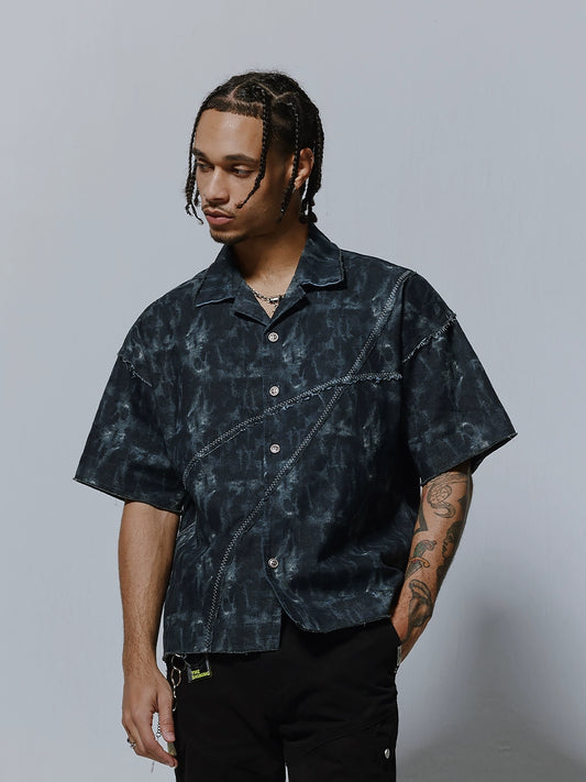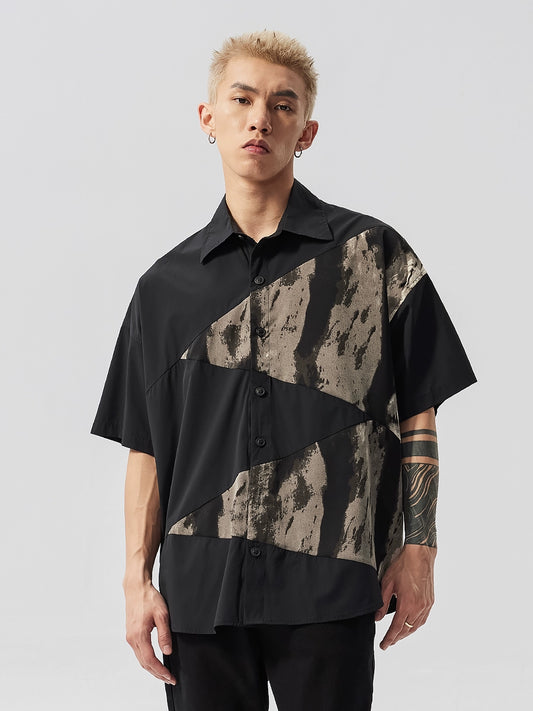 Ink Print Patchwork Spread-Collar Short Sleeve Shirt WN17520