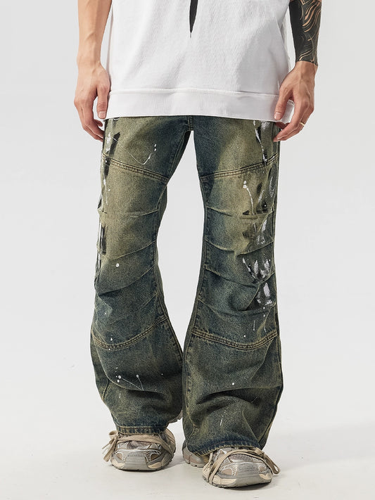 Graffiti Paint Wrinkle Stacked Micro Flare Denim Jeans WN17461