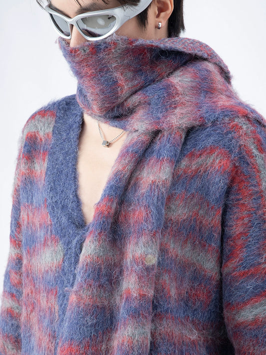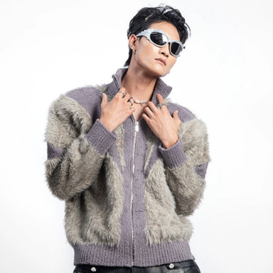 Fuzzy Patchwork Stand Neck Knit Cardigan WN20629
