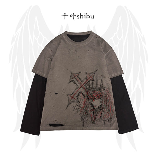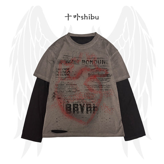 Fake Layered Damage Graphic Print Long Sleeve T-Shirt WN16841