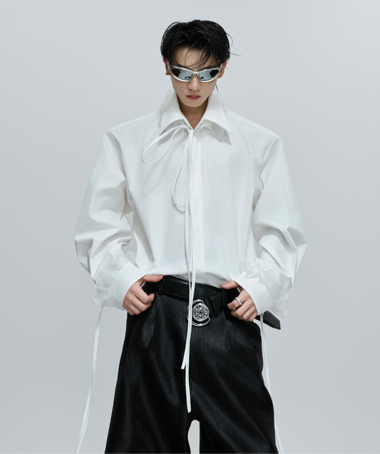 Pearl Beads Ribbon Pleats Long Sleeve Shirt WN21220