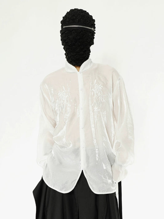 Organza Floral Embroidery Standing-Collar Long Sleeve Shirt WN20175