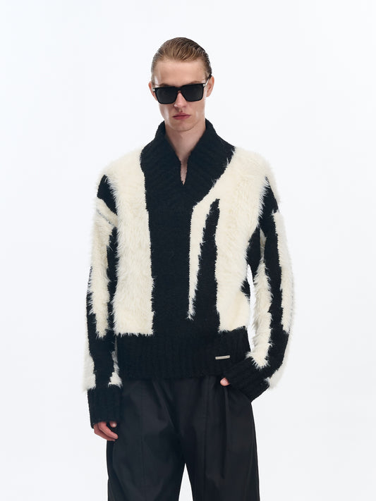 Fake Fur Patchwork Shaggy V-Neck Knit Sweater WN10694