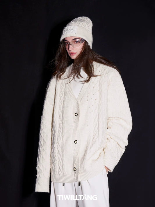 Pearl Accent V-neck Cable Knit Cardigan WN10696