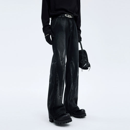 Wave Texture Washed Black Button Flare Denim Jeans WN21764