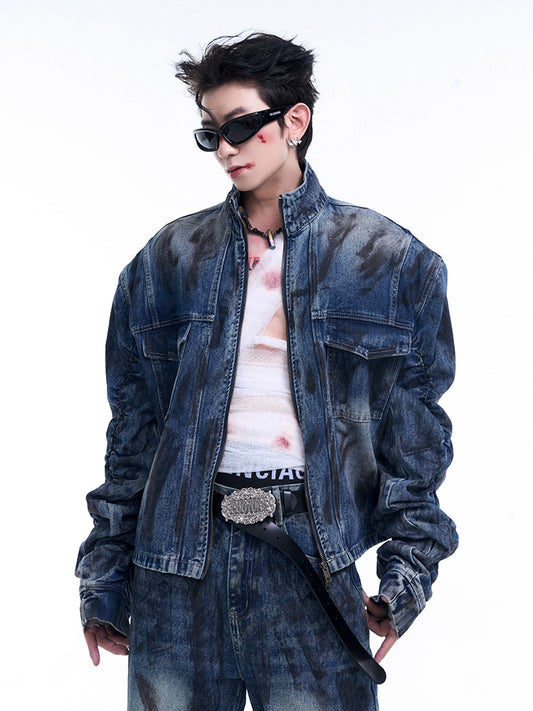 Wrinkles Sleeve Stand Neck Denim Jacket & Micro Flare Denim Jeans Setup WN8069
