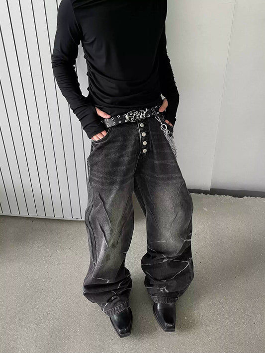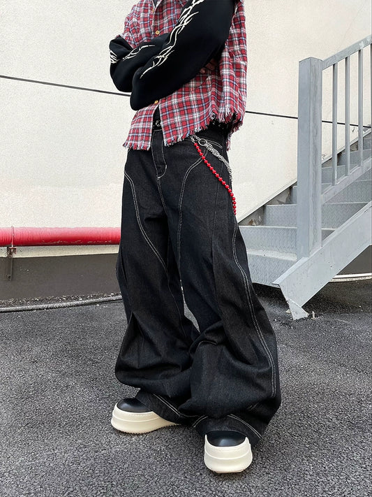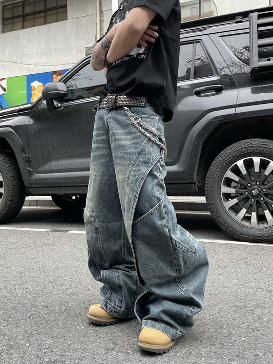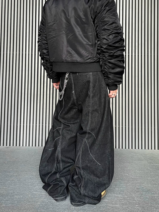 3D Panel Washed Wide-Leg Straight Denim Jeans WN15004