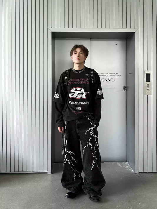 Embroidery Lightning Wide Leg Denim Jeans WN8256