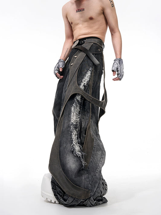 Asymmetric Irregular Embroidery Denim Vest & PU Leather Mix Damage Denim Jeans Setup WN16580