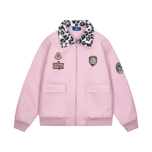Badge Embroidery Detachable Leopard Collar PU Leather Jacket WN11189