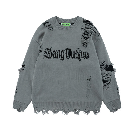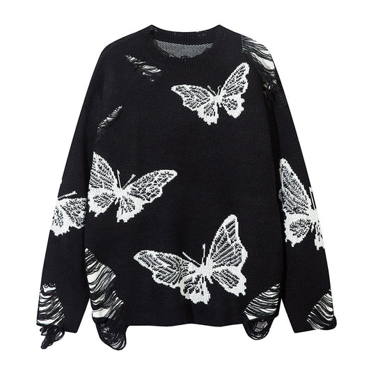 Butterfly Embroidery Damage Fringe Oversize Knit Sweater WN11171