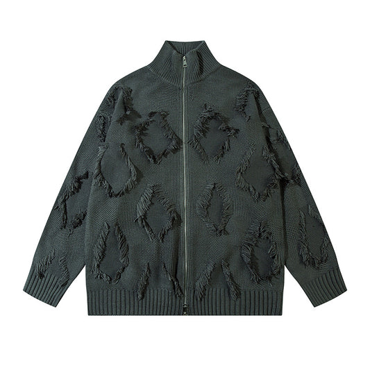 Damage Cross Pattern Zipper Knit Cardigan WN11188